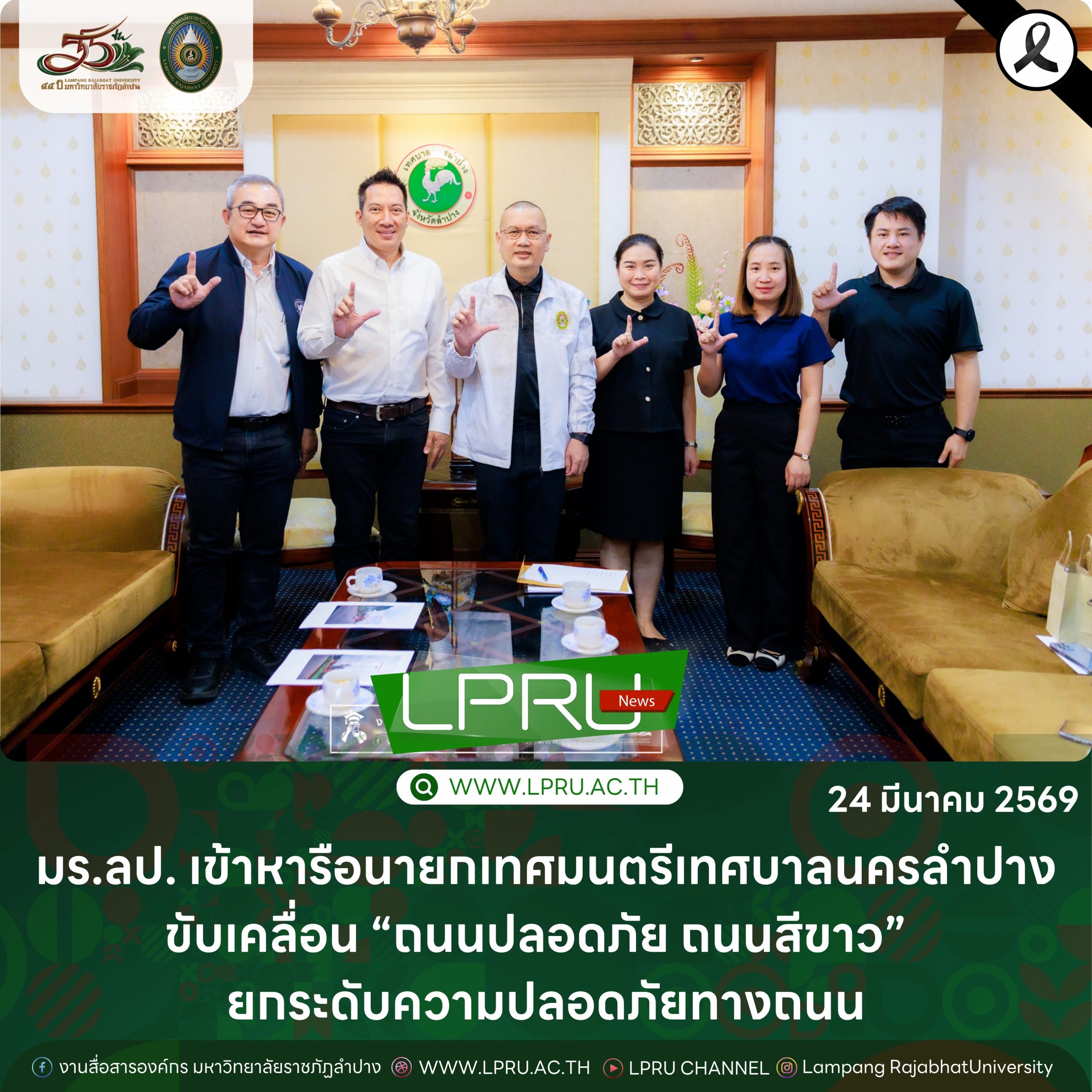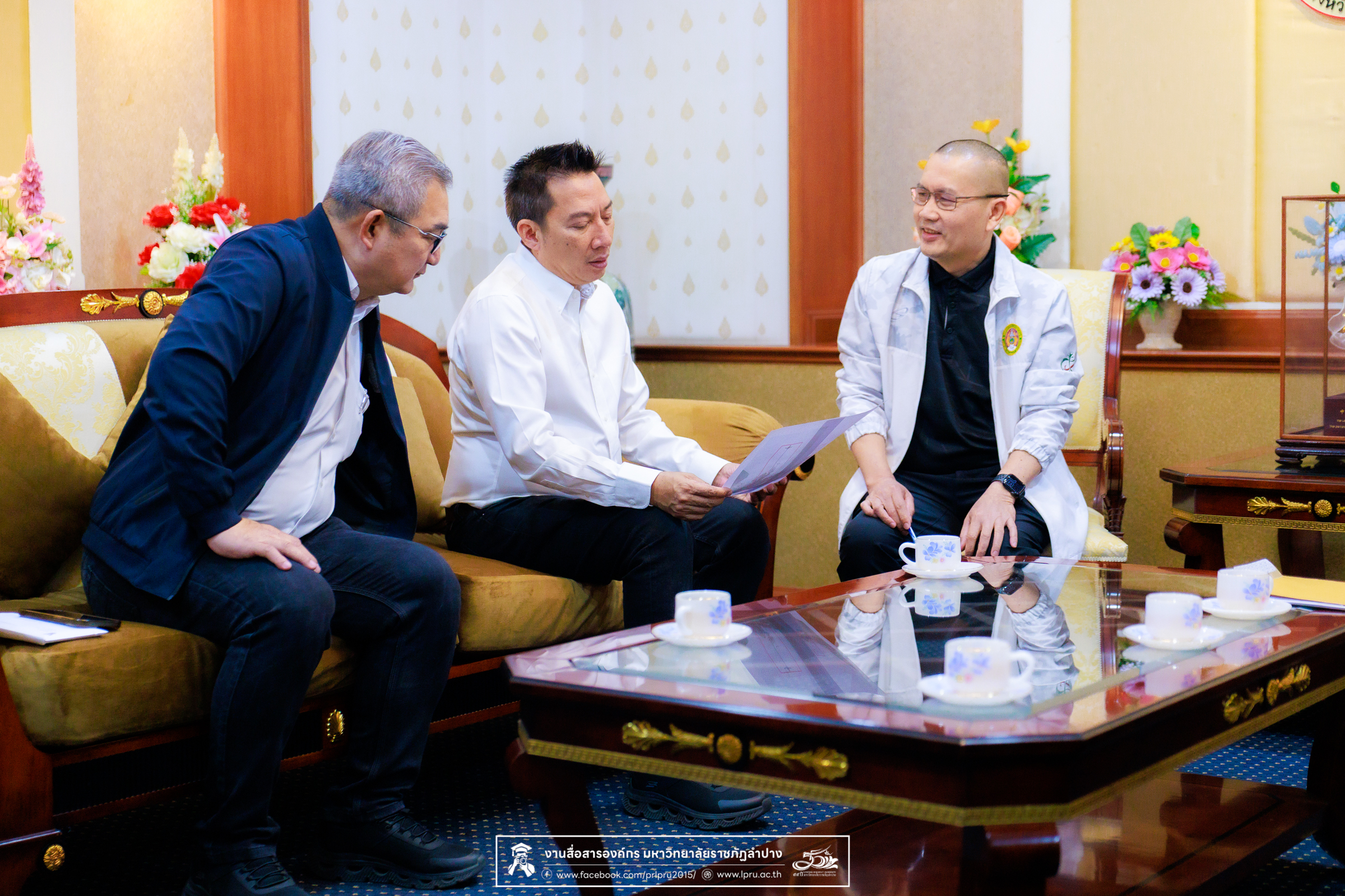 เมื่อวันที่ 24 มีนาคม 2569 รศ.ดร.ปริเยศ สิทธิสรวง รองอธิการบดีฝ่ายบริหาร มหาวิทยาลัยราชภัฏลำปาง พร้อมด้วย น.ส.ศศธร เครือนันตา นักประชาสัมพันธ์ ชำนาญการ ปฏิบัติหน้าที่ในตำแหน่งหัวหน้างานบริหารทั่วไปและสื่อสารองค์กร น.ส.นันทนัช กลิ่นซ้อน เจ้าหน้าที่ปฏิบัติงานบริหารงานตำแหน่งทางวิชาการ สังกัดงานบริหารทรัพยากรบุคคลและนิติการ และนายชนาธิป เมืองมูล นักประชาสัมพันธ์ ปฏิบัติการ สังกัดงานบริหารทั่วไปและสื่อสารองค์กร เข้าพบ นายปุณณสิน มณีนันทน์ นายกเทศมนตรีนครลำปาง โดยมี นายธนภณ แสงวิจิตร สมาชิกสภาเทศบาลนครลำปาง ให้การต้อนรับและร่วมแลกเปลี่ยนข้อมูลด้านงานจราจรที่อยู่ในความดูแลและรับผิดชอบของเทศบาลนครลำปาง ณ ห้องรับรองนายกเทศมนตรีเทศบาลนครลำปาง ชั้น 3 สำนักงานเทศบาลนครลำปาง อำเภอเมือง จังหวัดลำปาง