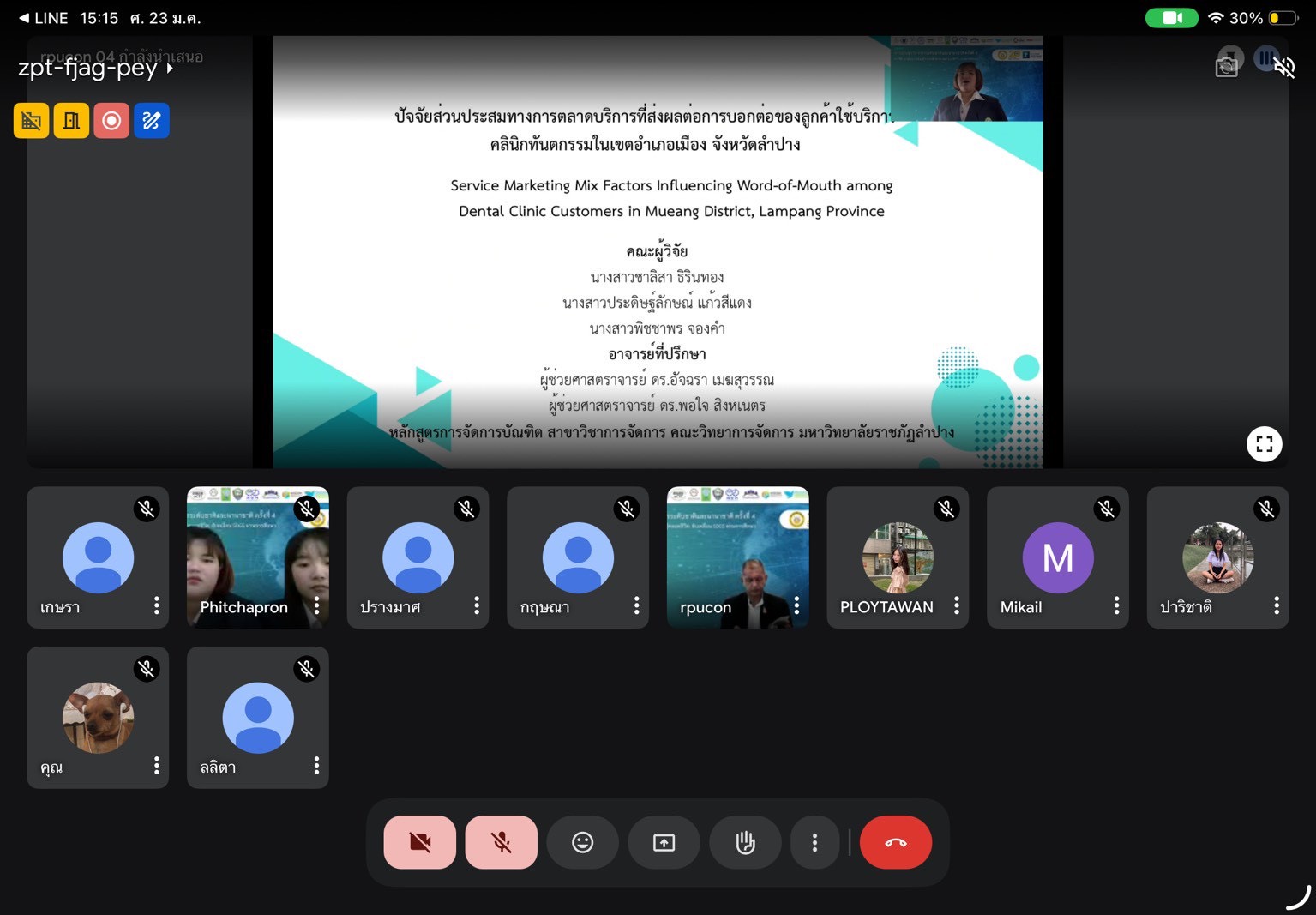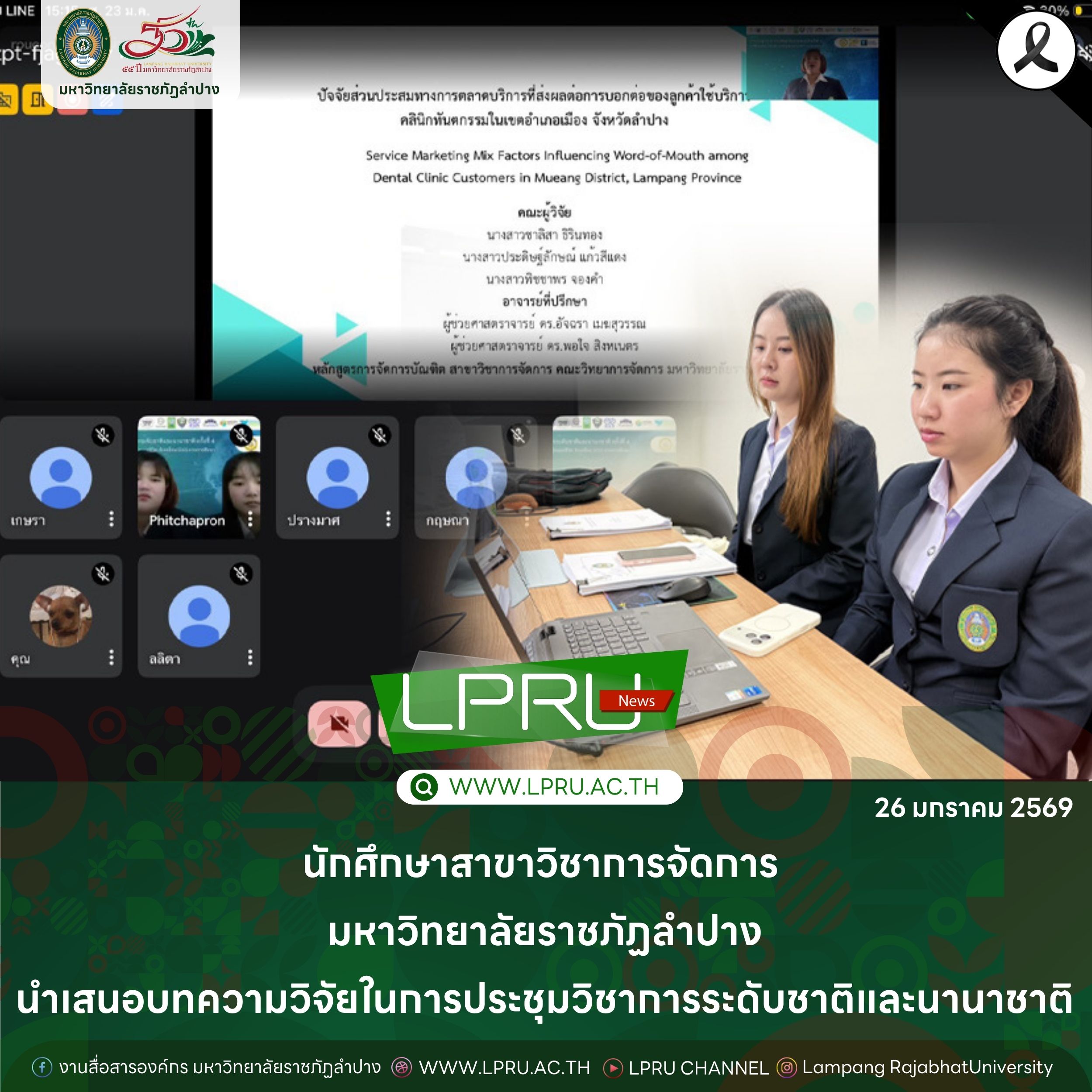 ผศ.ดร.อัจฉรา เมฆสุวรรณ อาจารย์สังกัดสาขาวิชาการจัดการ คณะวิทยาการจัดการ มหาวิทยาลัยราชภัฏลำปาง ในฐานะอาจารย์ผู้สอนรายวิชาการวิจัยทางการจัดการ เปิดเผยว่า เมื่อวันที่ 23 มกราคม 2569 นักศึกษาชั้นปีที่ 4 (เทียบโอน) และนักศึกษาชั้นปีที่ 3 สาขาวิชาการจัดการ คณะวิทยาการจัดการ มหาวิทยาลัยราชภัฏลำปาง ได้เข้าร่วมการประชุมวิชาการระดับชาติและนานาชาติ ครั้งที่ 4 เนื่องในโอกาสฉลองครบรอบ 20 ปี มหาวิทยาลัยราชพฤกษ์ ภายใต้หัวข้อ “การใช้ AI เพื่อการเรียนรู้ตลอดชีวิต: ขับเคลื่อน SDGs ผ่านการศึกษา” จัดขึ้นผ่านระบบออนไลน์ ณ ห้อง Co-Working Space ชั้น 1 อาคารโอฬาร โรจน์หิรัญ มหาวิทยาลัยราชภัฏลำปาง