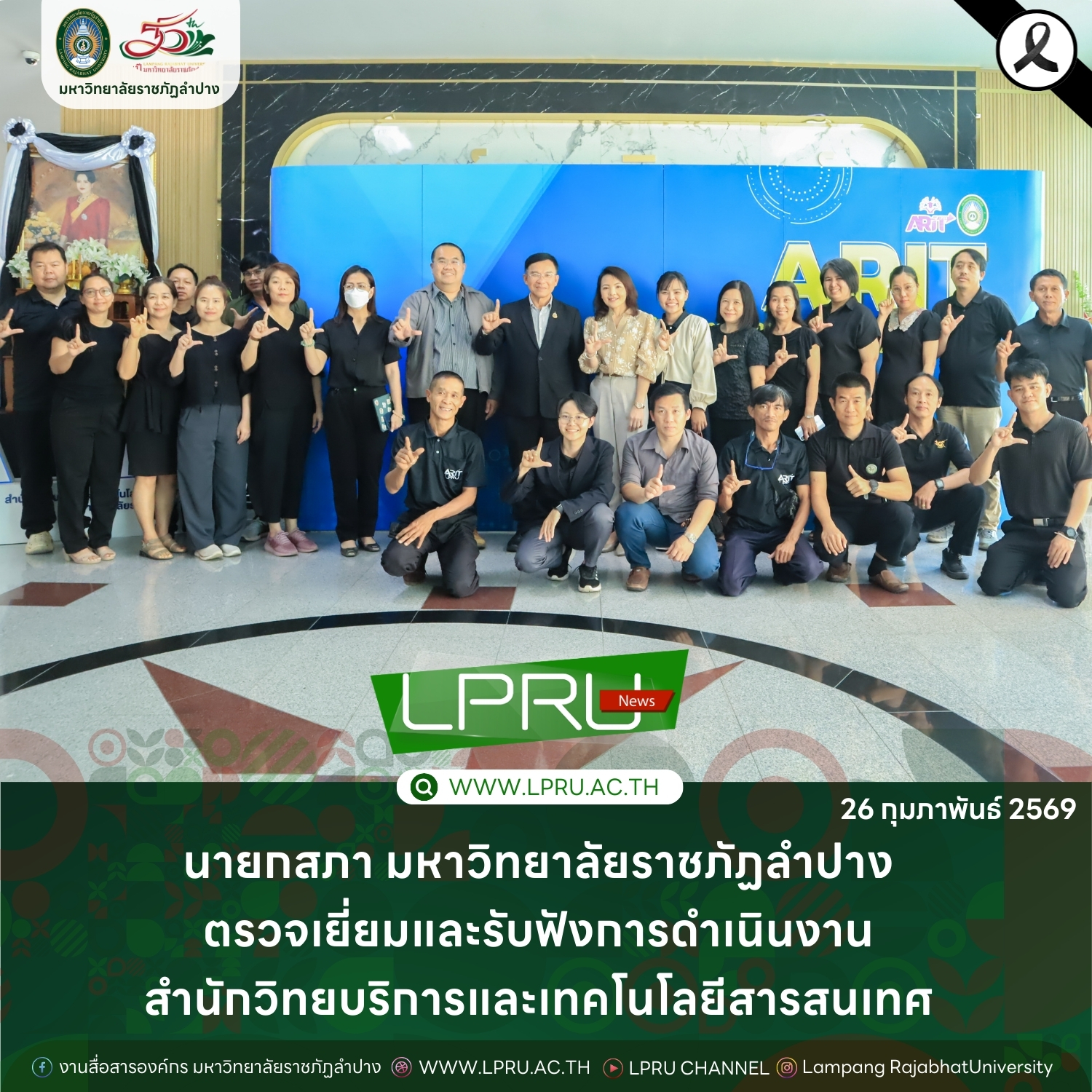 เมื่อวันที่ 26 กุมภาพันธ์ 2569 ศ.ดร.วิทยา จันทร์ศิลา นายกสภามหาวิทยาลัยราชภัฏลำปาง ตรวจเยี่ยมและรับฟังการดำเนินงาน ของสำนักวิทยบริการและเทคโนโลยีสารสนเทศ มหาวิทยาลัยราชภัฏลำปาง โดย ผศ.ชัยวุฒิ โกเมศ ผู้อำนวยการสำนักวิทยบริการและเทคโนโลยีสารสนเทศ พร้อมด้วย รศ.ดร.บัณศิกาญจ ตั้งภากรณ์ และ ผศ.นราธิป วงษ์ปัน รองผู้อำนวยการ ฯ ตลอดจนบุคลากร สำนักวิทยบริการ ฯ ร่วมให้การต้อนรับ ในโอกาสลงพื้นที่เยี่ยมและติดตามผลการดำเนินงาน ฯ ณ ห้อง Arit Play Ground ชั้น 1 อาคารสำนักวิทยบริการและเทคโนโลยีสารสนเทศ มหาวิทยาลัยราชภัฏลำปาง