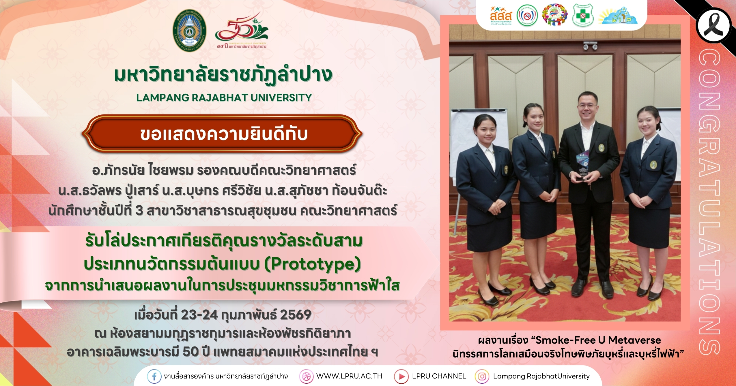 มหาวิทยาลัยราชภัฏลำปาง ขอแสดงความยินดีกับ อ.ภัทรนัย ไชยพรม รองคณบดีคณะวิทยาศาสตร์ น.ส.ธวัลพร ปู่เสาร์ น.ส.บุษกร ศรีวิชัย น.ส.สุภัชชา ก้อนจันต๊ะ นักศึกษาชั้นปีที่ 3 สาขาวิชาสาธารณสุขชุมชน คณะวิทยาศาสตร์