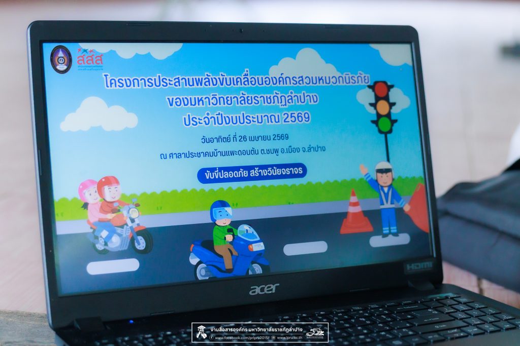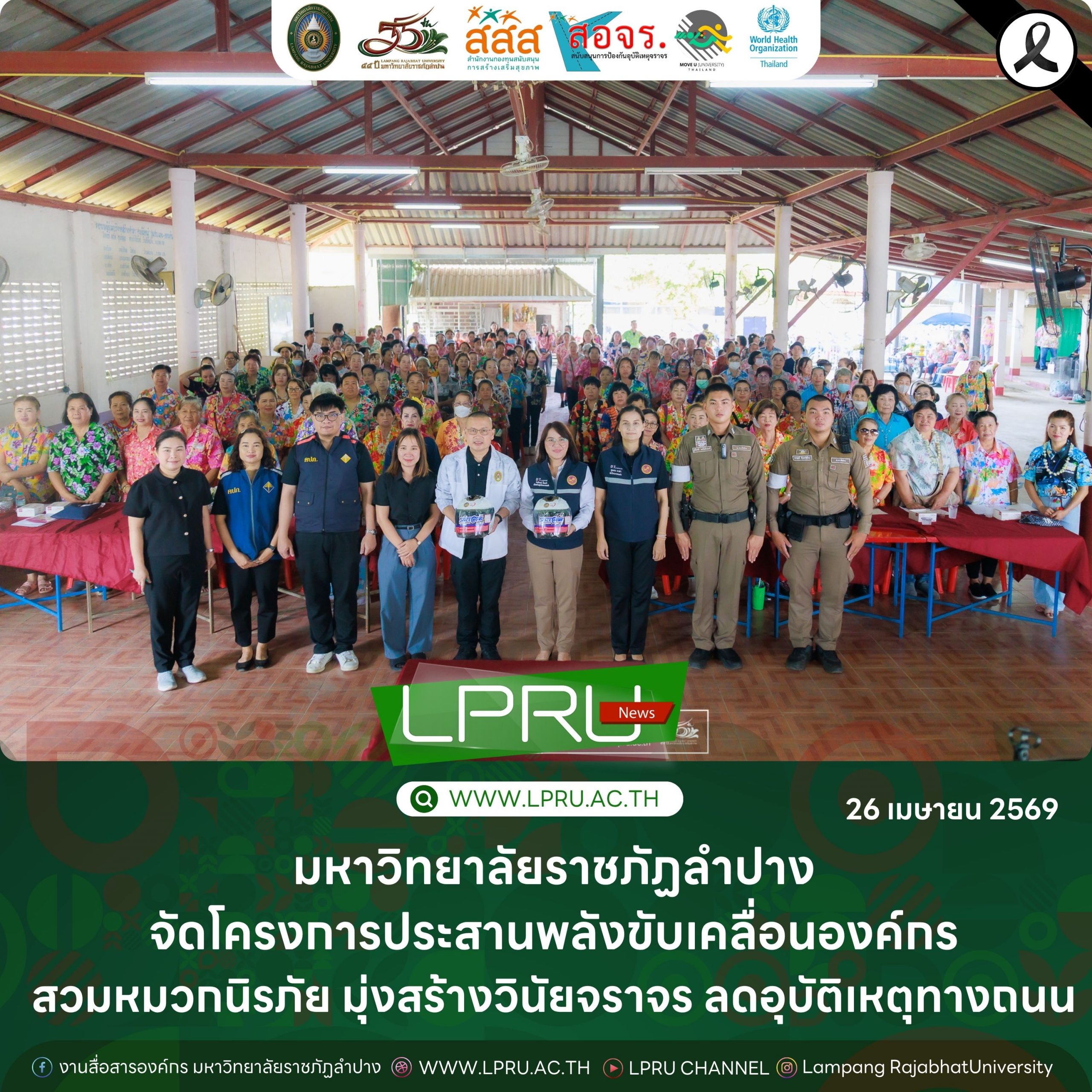 เมื่อวันที่ 26 เมษายน 2569 รศ.ดร.ปริเยศ สิทธิสรวง รองอธิการบดีฝ่ายบริหาร มหาวิทยาลัยราชภัฏลำปาง เป็นประธานเปิดโครงการ “ประสานพลังขับเคลื่อนองค์กรสวมหมวกนิรภัย” ประจำปีงบประมาณ พ.ศ. 2569 ณ ศาลาประชาคมบ้านแพะดอนตัน ตำบลชมพู อำเภอเมือง จังหวัดลำปาง โดยมีหน่วยงานภาครัฐเข้าร่วม อาทิ สำนักงานขนส่งจังหวัดลำปาง สำนักงานคณะกรรมการกำกับและส่งเสริมการประกอบธุรกิจประกันภัย (คปภ.) จังหวัดลำปาง โรงพยาบาลลำปาง และสถานีตำรวจภูธรเขลางค์นคร