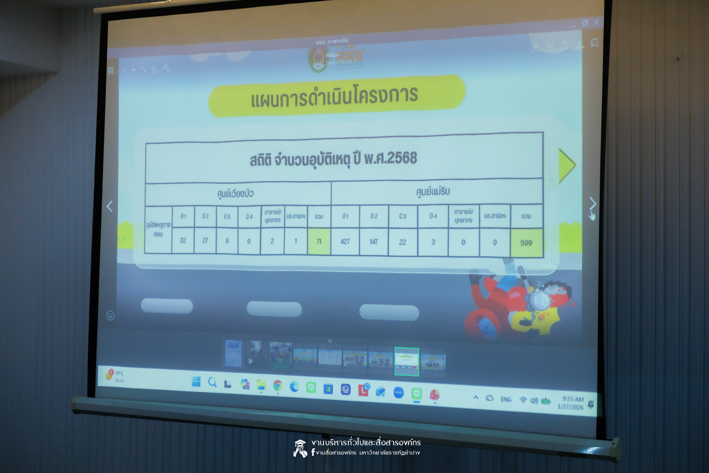 ทั้งนี้ เมื่อวันที่ 26 มกราคม 2569 ผู้เข้าร่วมการประชุมเชิงปฏิบัติการได้เข้าศึกษาดูงาน ณ มหาวิทยาลัยราชภัฏลำปาง ซึ่งเป็นต้นแบบองค์กรสวมหมวกนิรภัย 100% และการยกระดับมาตรการความปลอดภัยทางถนนภายในมหาวิทยาลัย