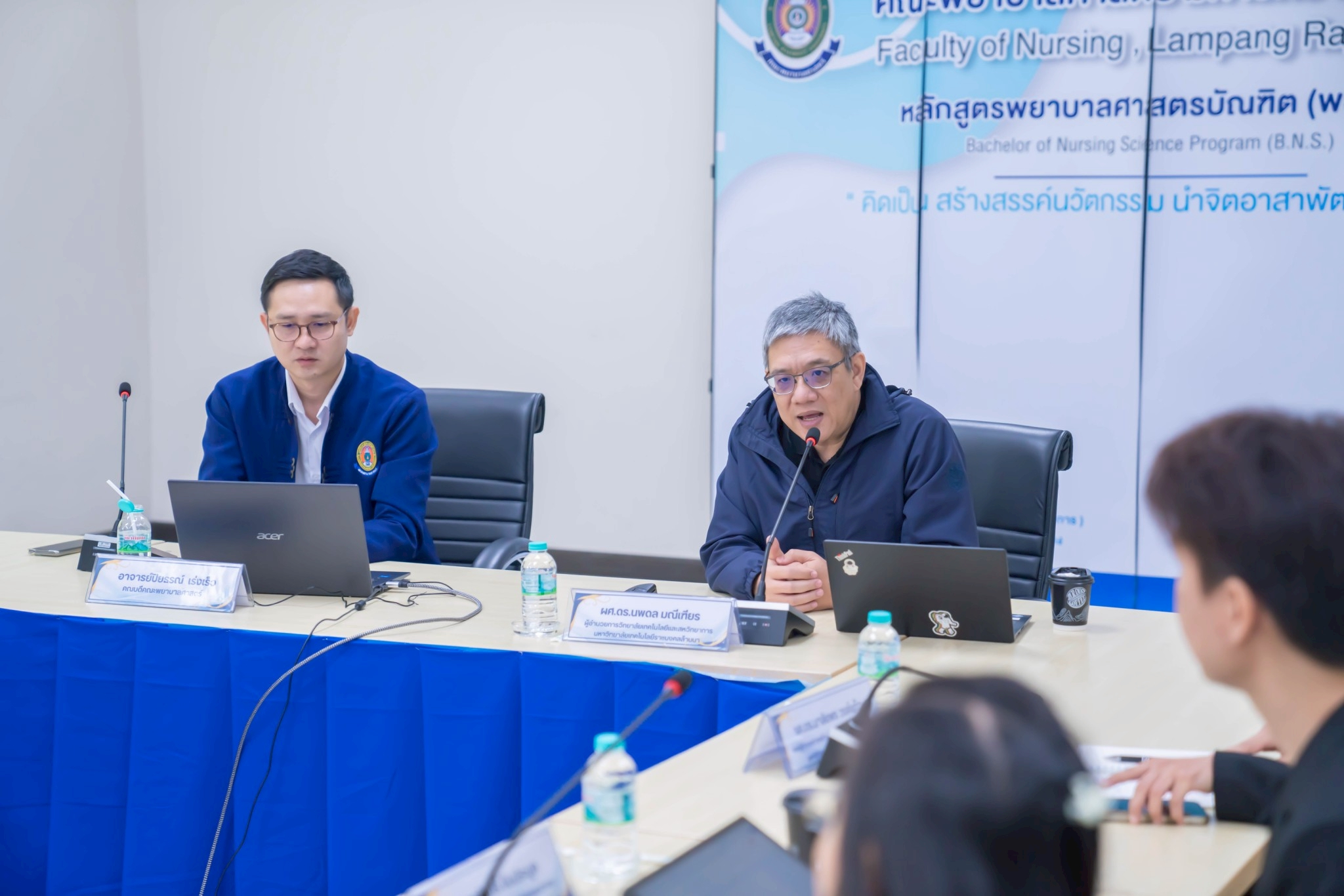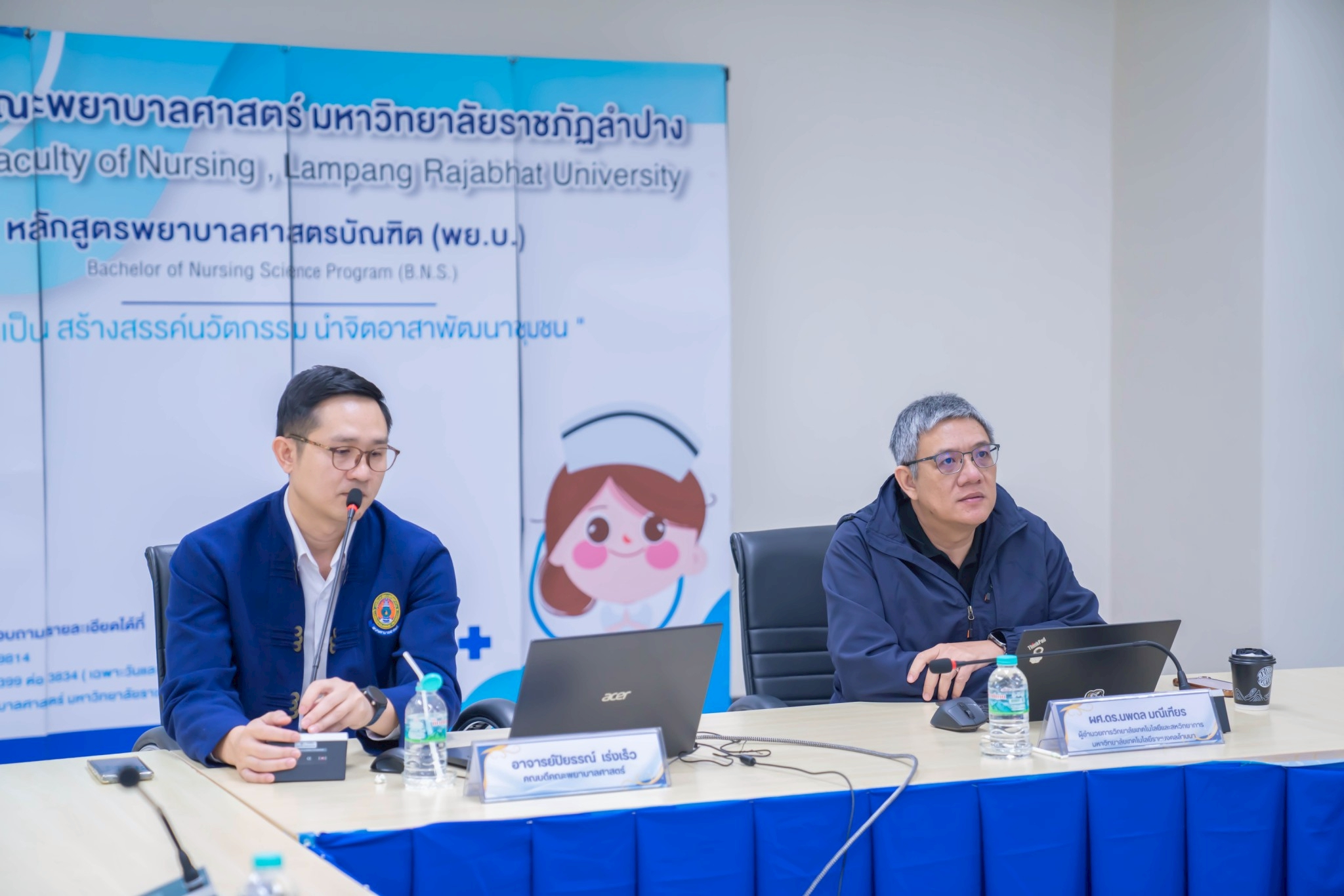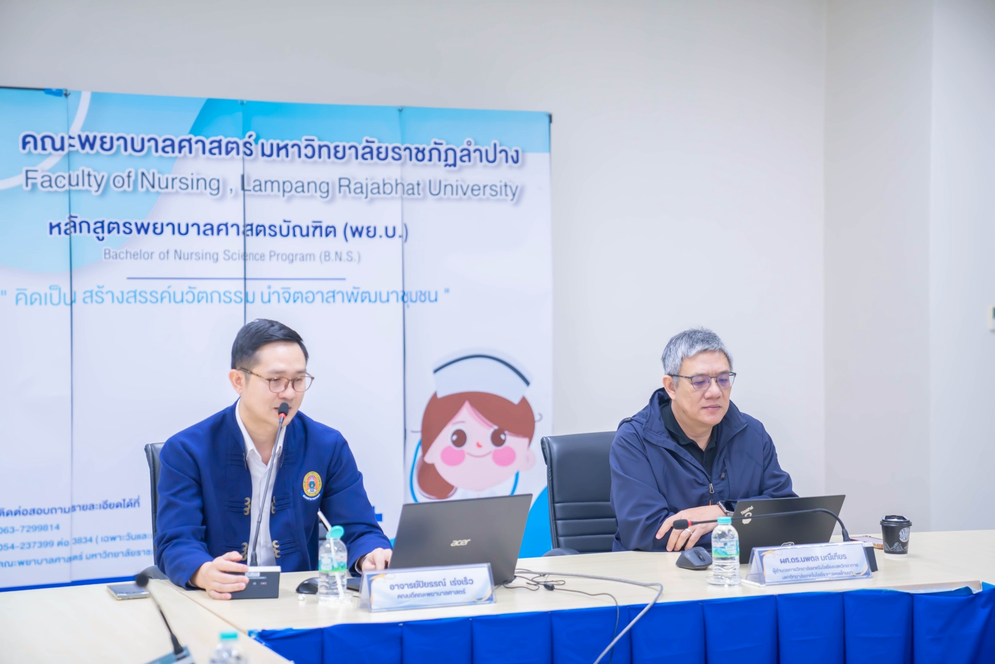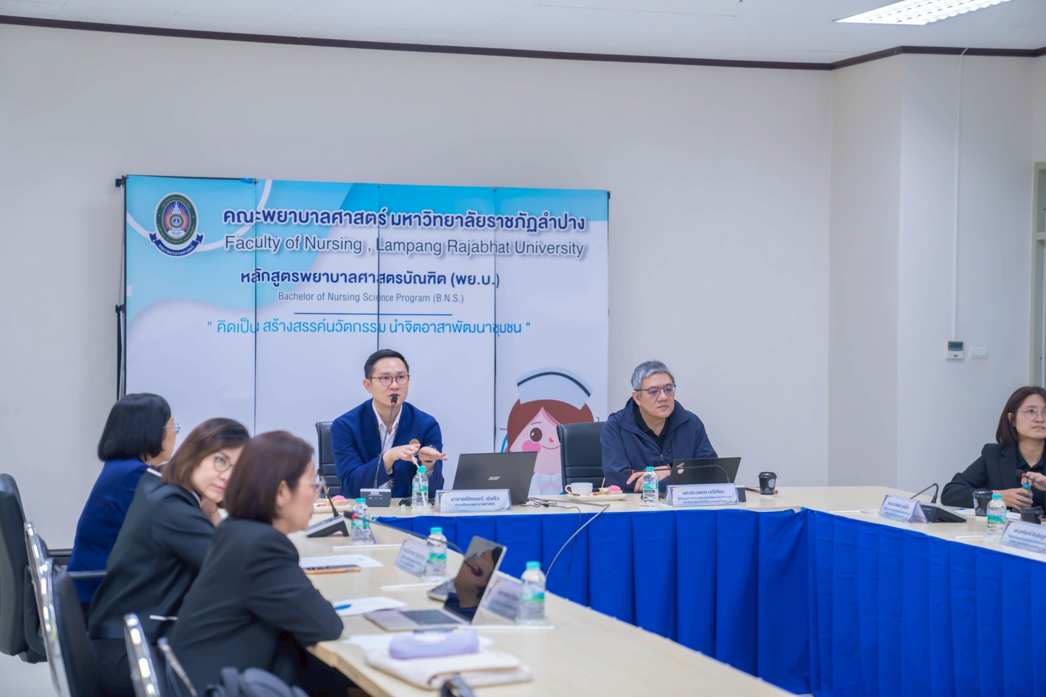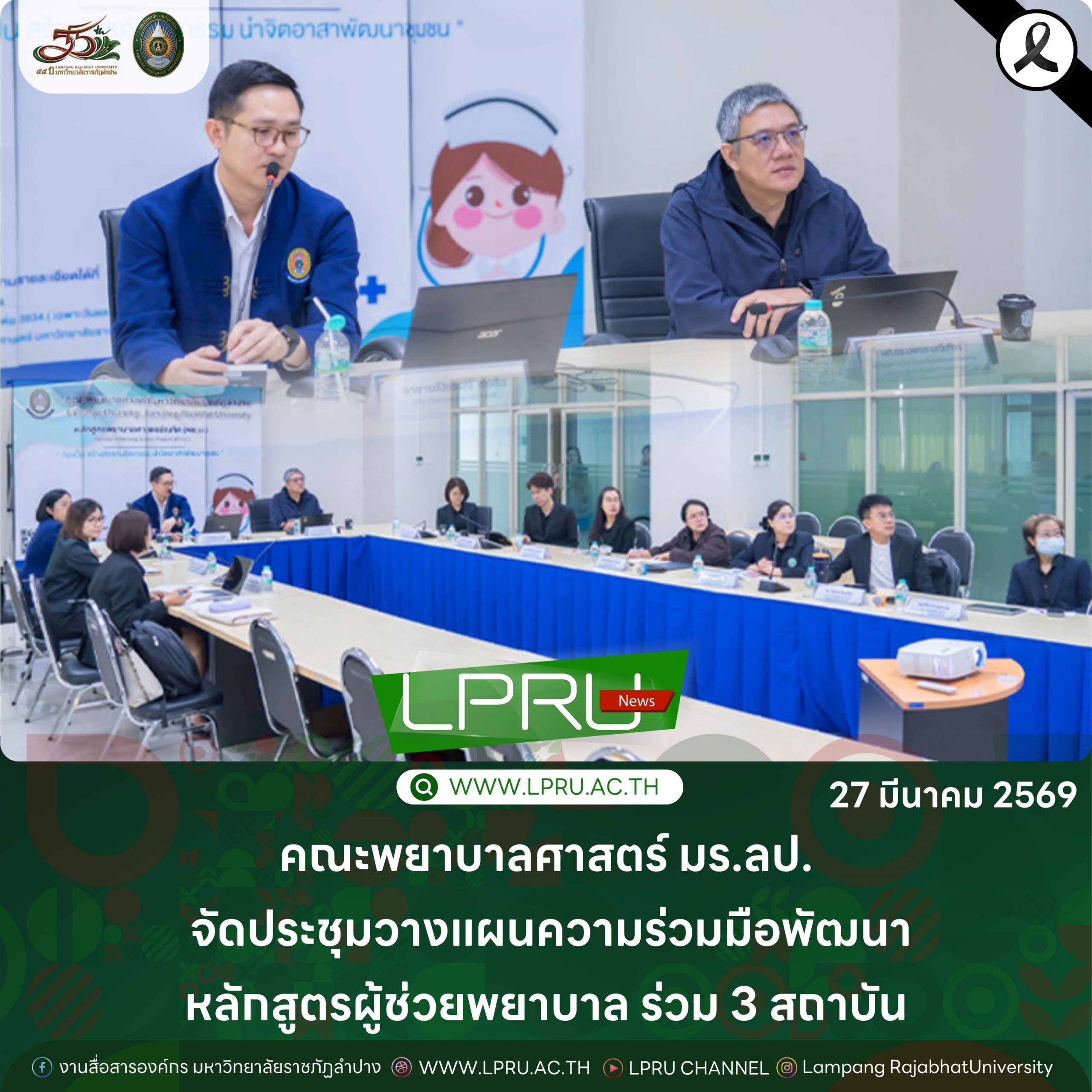 เมื่อวันที่ 26 มีนาคม 2569 อ.ปิยธรณ์ เร่งเร็ว คณะบดีคณะพยาบาลศาสตร์ มหาวิทยาลัยราชภัฏลำปาง พร้อมด้วย คณะผู้บริหาร คณาจารย์ ให้การต้อนรับ ผศ.ดร.นพดล มณีเฑียร ผู้อำนวยการวิทยาลัยเทคโนโลยีและสหวิทยาการ มหาวิทยาลัยเทคโนโลยีราชมงคลล้านนา รศ.ดร.มาลัยพร วงค์แก้ว รองผู้อำนวยการ ฯ ด้านวิชาการ วิจัย และบริการวิชาการ ผศ.เอกรินทร์ อินประมูล หัวหน้าหลักสูตรวิศวกรรมและนวัตกรรมอาหาร อ.พิกุลทอง ไชยมงคล อาจารย์ประจำกลุ่มวิชาศึกษาทั่วไป น.ส.ธมนวรรณ จิตบาล หัวหน้าสำนักงานวิทยาลัย ฯ นางสุพัตรา ปวนไฝ พยาบาลวิชาชีพชำนาญการพิเศษ หัวหน้าฝ่ายการพยาบาล นายจตุพงษ์ พันธ์วิไล พยาบาลวิชาชีพชำนาญการพิเศษ และ น.ส.กิ่งดาว ขุ่ยอาภัย พยาบาลวิชาชีพชำนาญการ โรงพยาบาลประสาทเชียงใหม่ กรมการแพทย์ ในการประชุมวางแผนความร่วมมือพัฒนาหลักสูตรประกาศนียบัตรผู้ช่วยพยาบาล ร่วมกับวิทยาลัยเทคโนโลยีและสหวิทยาการ มหาวิทยาลัยเทคโนโลยีราชมงคลล้านนา และโรงพยาบาลประสาทเชียงใหม่ ภายหลังจากทั้ง 3 หน่วยงานได้ลงนามบันทึกความร่วมมือทางวิชาการ เพื่อส่งเสริมการจัดการศึกษา การวิจัย และการบริการวิชาการด้านสุขภาพ ณ ห้องประชุมชั้น 8 คณะพยาบาลศาสตร์ มหาวิทยาลัยราชภัฏลำปาง