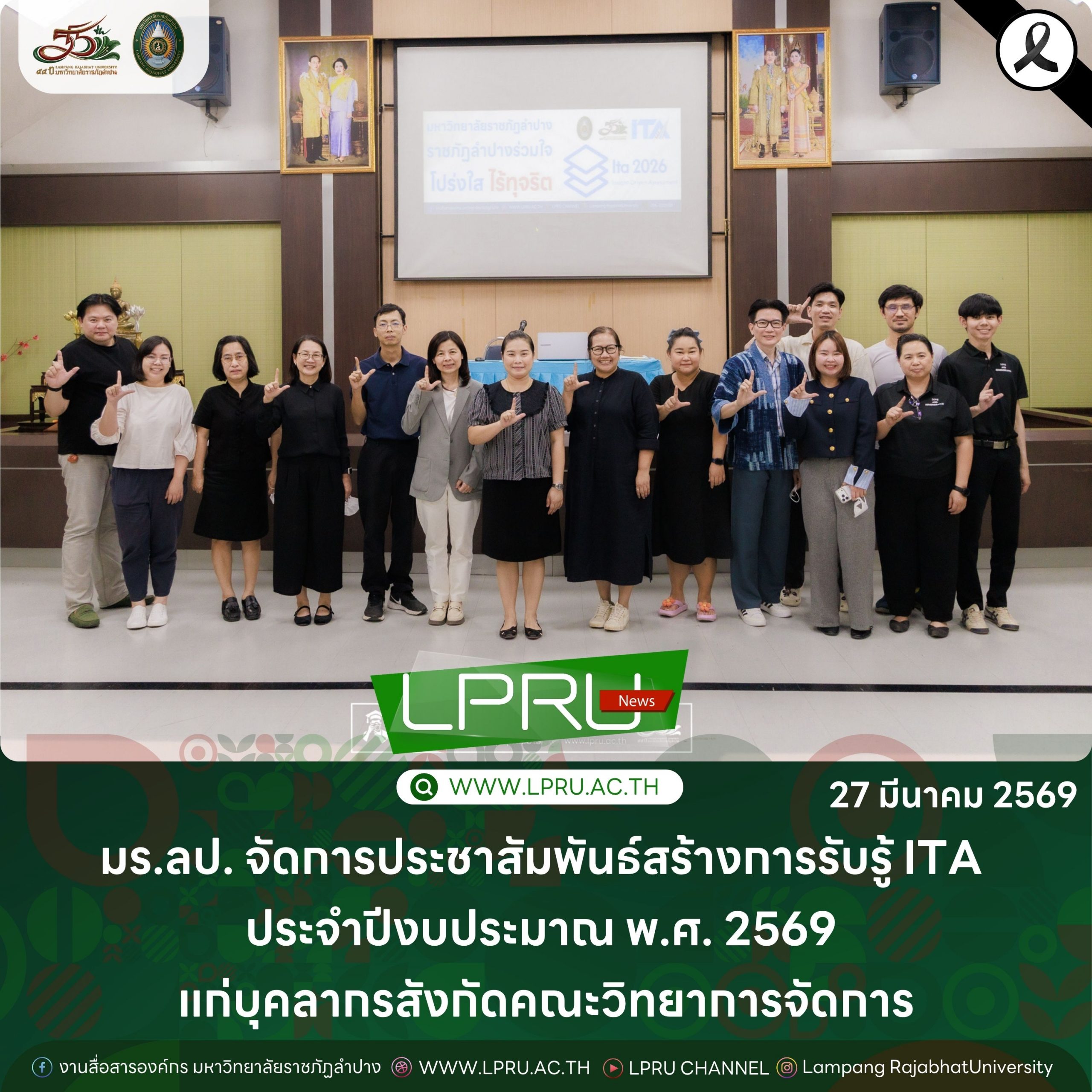 เมื่อวันที่ 27 มีนาคม 2569 น.ส.ศศธร เครือนันตา นักประชาสัมพันธ์ ชำนาญการ ปฏิบัติหน้าที่ในตำแหน่งหัวหน้างานบริหารทั่วไปและสื่อสารองค์กร กองกลาง สำนักงานอธิการบดี มหาวิทยาลัยราชภัฏลำปาง จัดกิจกรรมการประชาสัมพันธ์สร้างการรับรู้ “การประเมินคุณธรรมและความโปร่งใสในการดำเนินงานของหน่วยงานภาครัฐ” (Integrity & Transparency Assessment : ITA) ประจำปีงบประมาณ พ.ศ. 2569 แก่บุคลากรสังกัดคณะวิทยาการจัดการ โดย อาจารย์ ดร.นุสรา แสงอร่ามคณบดีคณะวิทยาการจัดการ นำผู้บริหาร คณาจารย์ และบุคลากรในสังกัด เข้ารับฟัง ณ ห้องประชุมธัญกร ชั้น 1 อาคารคณะวิทยาการจัดการ