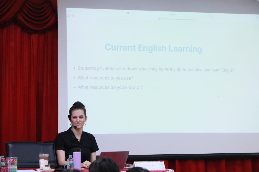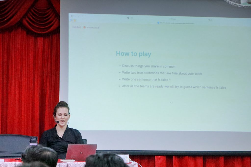 นอกจากนี้ ยังมีกิจกรรมอบรมเชิงปฏิบัติการในหัวข้อ “เทคนิคการสื่อสารโดยใช้ภาษาอังกฤษ” โดย อ.อนงค์กร เทรล อาจารย์กลุ่มวิชาภาษาตะวันตก คณะศิลปศาสตร์ มหาวิทยาลัยแม่โจ้ และการอบรมเชิงปฏิบัติการหัวข้อ “วิธีการรับมือเมื่อต้องสนทนากับเจ้าของภาษา” โดย Miss Emma Buss ครูประจำชั้น English for Everyday Life Program (FEP) โรงเรียนสาธิตมหาวิทยาลัยราชภัฏลำปาง