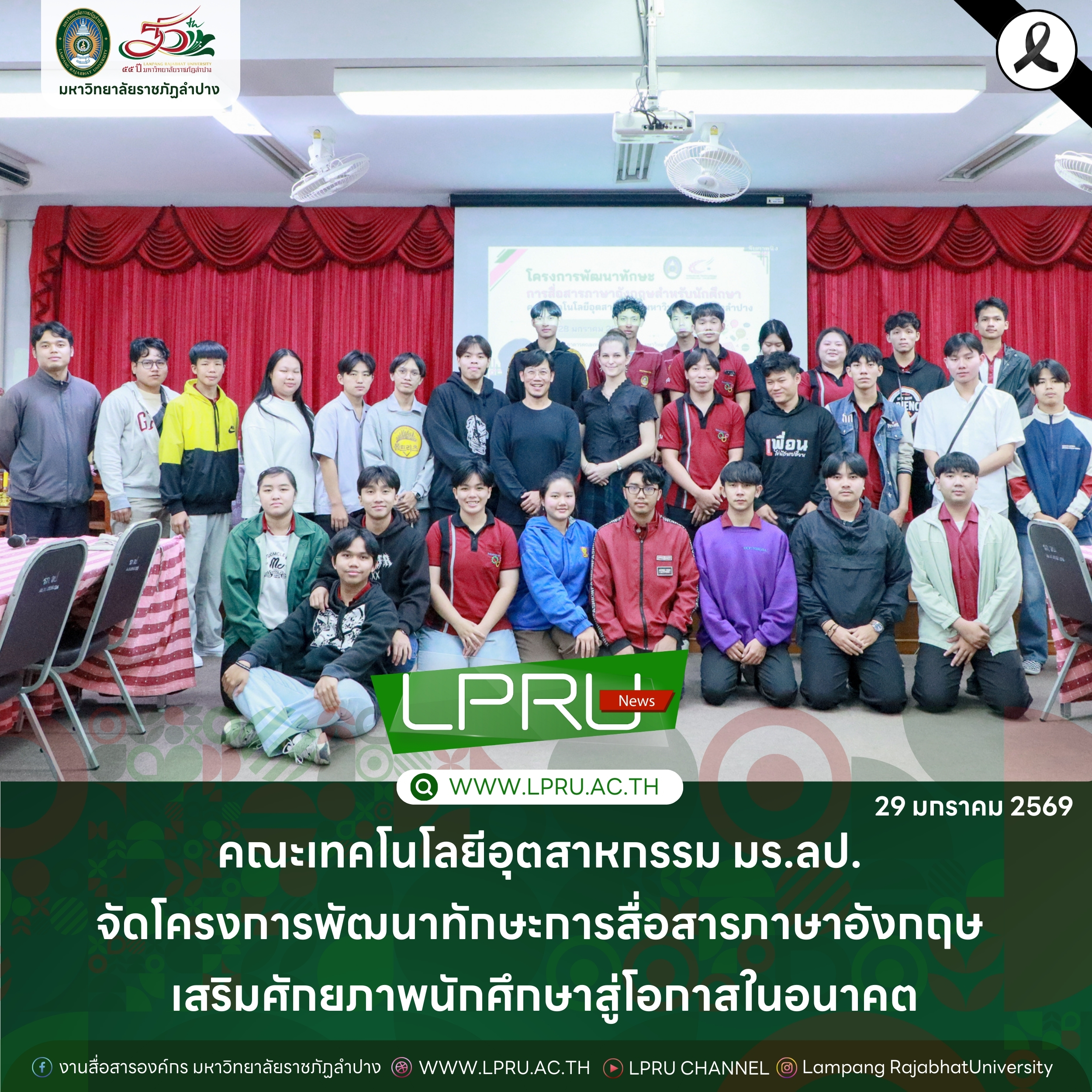 เมื่อวันที่ 28 มกราคม 2569 คณะเทคโนโลยีอุตสาหกรรม มหาวิทยาลัยราชภัฏลำปาง จัดโครงการพัฒนาทักษะการสื่อสารภาษาอังกฤษสำหรับนักศึกษาคณะเทคโนโลยีอุตสาหกรรม ณ ห้องประชุม 1315 อาคาร 13 คณะเทคโนโลยีอุตสาหกรรม โดยมีนักศึกษาชั้นปีที่ 2 คณะเทคโนโลยีอุตสาหกรรม เข้าร่วมกิจกรรมกว่า 40 คน