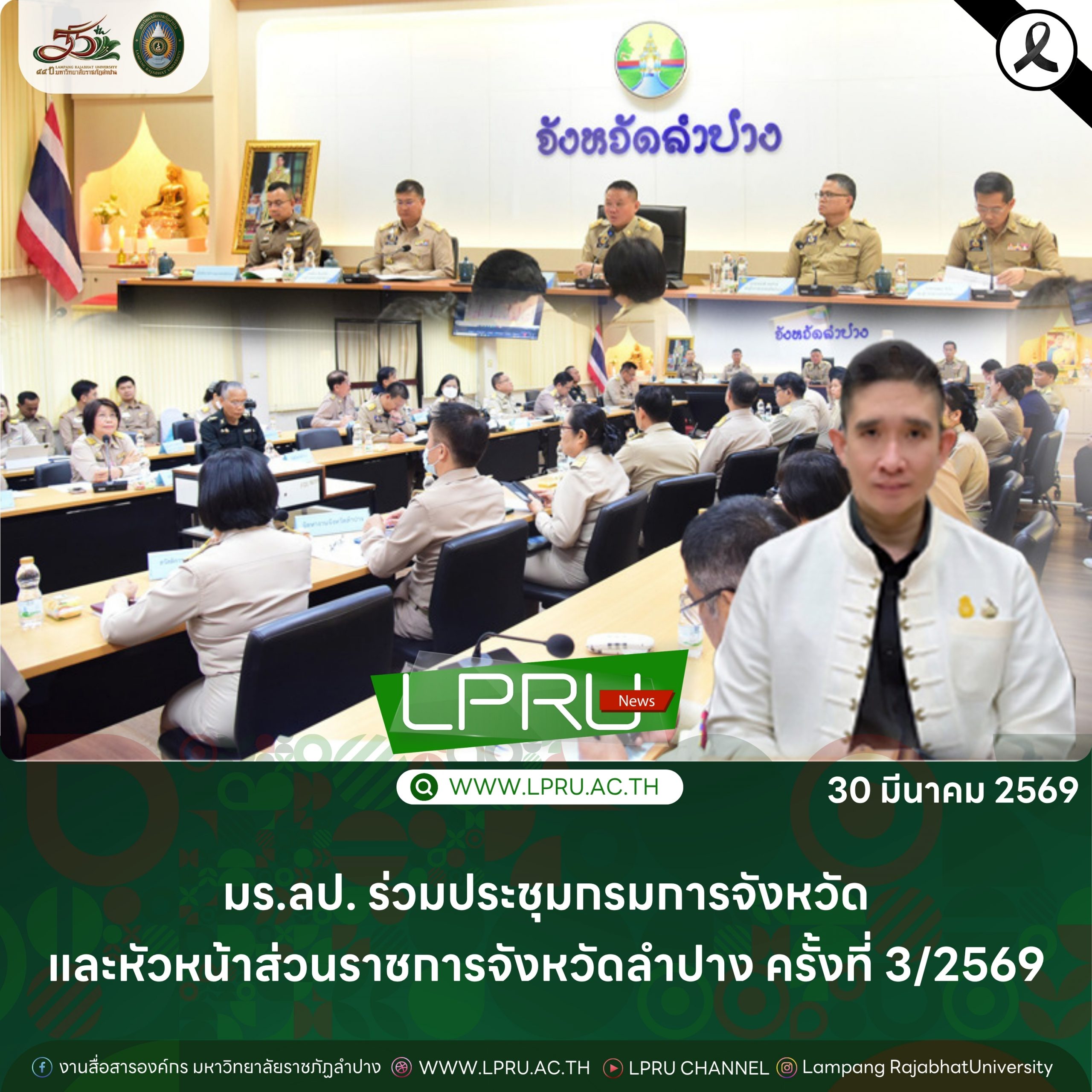 เมื่อวันที่ 30 มีนาคม 2569 ผศ.วุฒิรัตน์ พัฒนิบูลย์ ผู้ช่วยอธิการบดีด้านติดตามนโยบายและกิจการพิเศษ มหาวิทยาลัยราชภัฏลำปาง เข้าร่วมการประชุมคณะกรมการจังหวัดและหัวหน้าส่วนราชการจังหวัดลำปาง ครั้งที่ 3/2569 (ประจำเดือนมีนาคม 2569) โดยมี นายวิวัฒน์ อินทร์ไทยวงศ์ ผู้ว่าราชการจังหวัดลำปาง เป็นประธานการประชุม