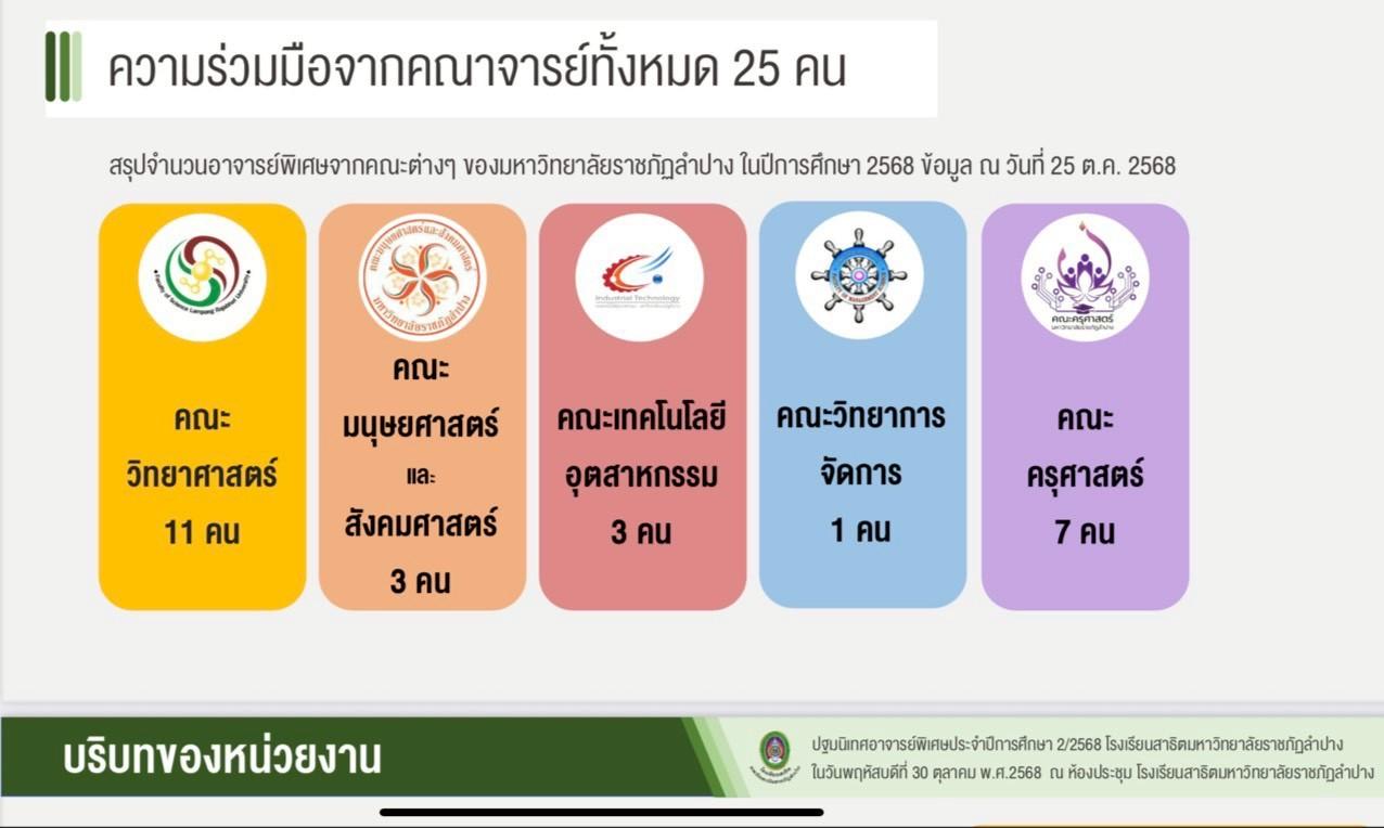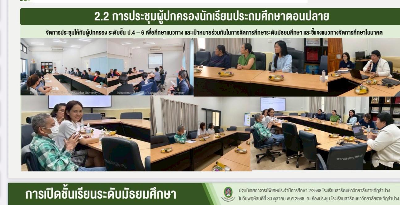 เมื่อวันที่ 30 ตุลาคม 2568 อ.ดร.สมศักดิ์ ก๋าทอง ผู้อำนวยการโรงเรียนสาธิตมหาวิทยาลัยราชภัฏลำปาง ได้กล่าวถึงแนวทางการเปิดชั้นเรียนระดับมัธยมศึกษาตอนต้นในปีการศึกษา 2569 และแนวทางการจัดการเรียนการสอน พร้อมเปิดโอกาสให้คณาจารย์ทุกคณะในมหาวิทยาลัยราชภัฏลำปางได้แสดงความคิดเห็นและร่วมแลกเปลี่ยนเรียนรู้ เพื่อนำมาสู่การพัฒนาหลักสูตร รวมทั้งเอกสารประกอบการสอน หนังสือเรียน และสื่อการสอนที่เน้นผู้เรียนเป็นสำคัญ โดยสร้างจุดเน้นและเสริมจุดแข็ง อ.ดร.พิมพ์ผกา อินทะรส รองผู้อำนวยการฯ ได้นำเสนอกรอบโครงสร้างของลักสูตรสถานศึกษาที่สร้างจุดเน้นและอัตลักษณ์ที่โดดเด่น โดยสอดคล้องกับความถนัดและความสนใจของผู้เรียน