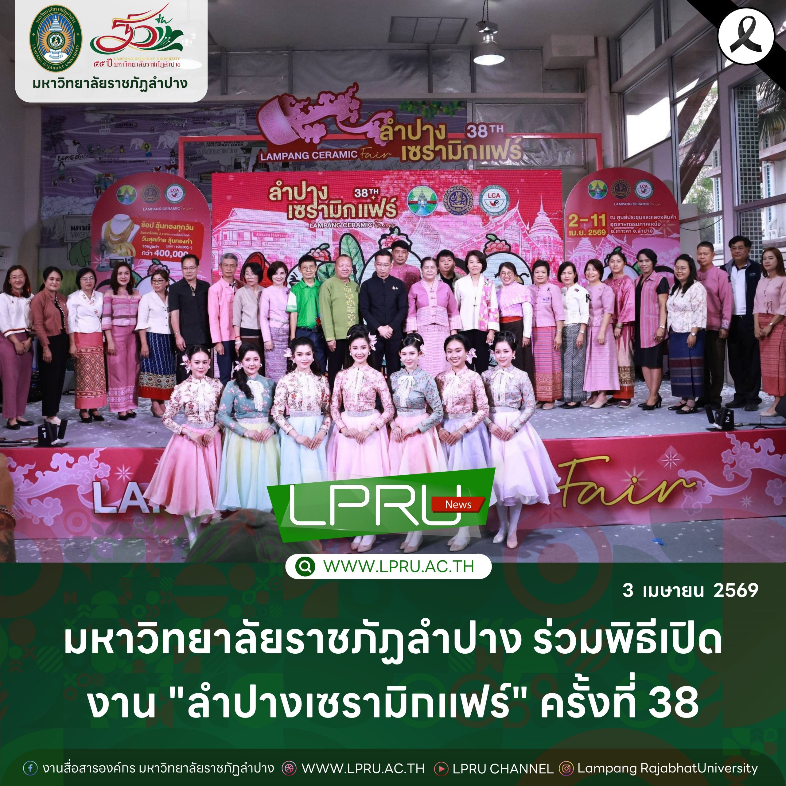 รศ.ธิติมา คุณยศยิ่ง ผู้อำนวยการสถาบันวิจัยและพัฒนา มหาวิทยาลัยราชภัฏลำปาง ร่วมพิธีเปิดงาน “ลำปางเซรามิกแฟร์” ครั้งที่ 38 ตามโครงการส่งเสริมวิสาหกิจขนาดกลางและขนาดย่อม เมื่อวันที่ 2 เมษายน 2569 ณ ศูนย์ประชุมและแสดงสินค้าอุตสาหกรรมภาคเหนือ อำเภอเกาะคา จังหวัดลำปาง โดยมี นายกฤษณะ พินิจ รองผู้ว่าราชการจังหวัดลำปาง เป็นประธานพิธีเปิด นางกนกรัตน์ ยุกติรัตน์ พาณิชย์จังหวัดลำปาง กล่าวรายงาน และ นายกิติศักดิ์ สินวนาทรัพย์ นายกสมาคมเครื่องป้ันดินเผาลำปาง กล่าวต้อนรับ