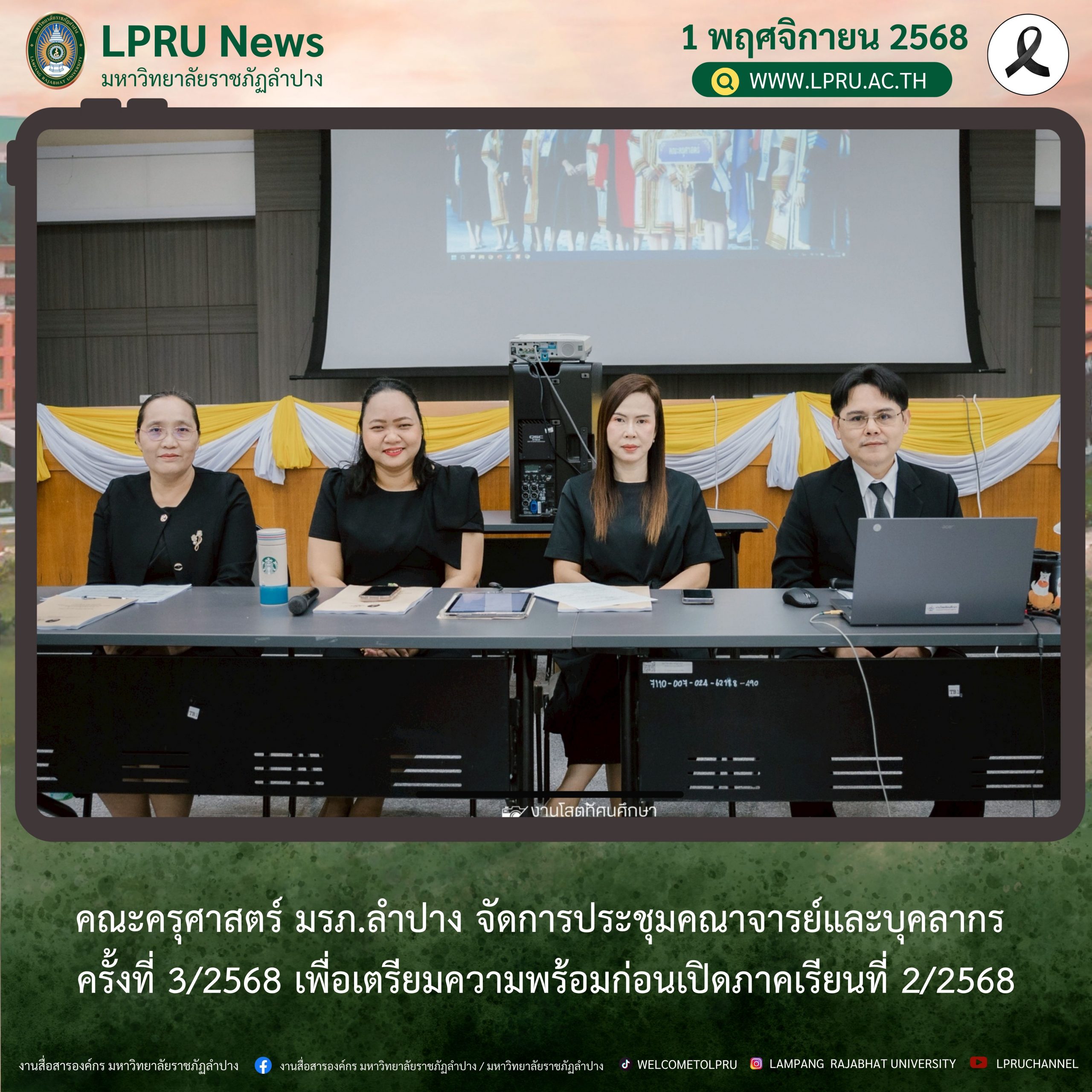 เมื่อวันที่ 30 ตุลาคม 2568 รศ.ดร.ฟิสิกส์ ฌอณ บัวกนก คณบดีคณะครุศาสตร์ เป็นประธานในที่ประชุม คณาจารย์และบุคลากร ครั้งที่ 3/2568 เพื่อเตรียมความพร้อมก่อนเปิดภาคเรียนที่ 2/2568 ณ ห้องประชุมเอื้องหลวง อาคาร 52 คณะครุศาสตร์และคณะมนุษยศาสตร์และสังคมศาสตร์ มหาวิทยาลัยราชภัฏลำปาง โดยมีการแสดงความยินดีแก่บุคลากรสายวิชาการที่ได้รับการแต่งตั้งให้ดำรงตำแหน่งทางวิชาการที่สูงขึ้น ได้แก่ ผศ.ดร.วิไลวรรณ เข้มขัน ได้รับการแต่งตั้งให้เป็น ผู้ช่วยศาสตราจารย์ สาขาวิชาภาษาไทย ผศ.ดร.วารินทร์ วงษ์วรรณ ได้รับการแต่งตั้งให้เป็น ผู้ช่วยศาสตราจารย์ สาขาวิชาภูมิศาสตร์ และผศ.อภิรดี จีนคร้าม ได้รับการแต่งตั้งให้เป็น ผู้ช่วยศาสตราจารย์ สาขาวิชาการศึกษา อนุสาขาวิชาการสอนภาษาอังกฤษ พร้อมทั้งได้มีการแสดงความยินดีและมอบเกียรติบัตรให้แก่คณาจารย์ที่มีผลการประเมินความพึงพอใจของผู้เรียนที่มีต่อการจัดการเรียนการสอนที่ได้คะแนนในระดับสูงสุด ของแต่ละสาขาวิชา และแสดงความยินดีกับบุคลากรสายสนับสนุนที่มีผลการประเมินการปฏิบัติงานอยู่ในระดับสูงสุด มีรายนามดังนี้
