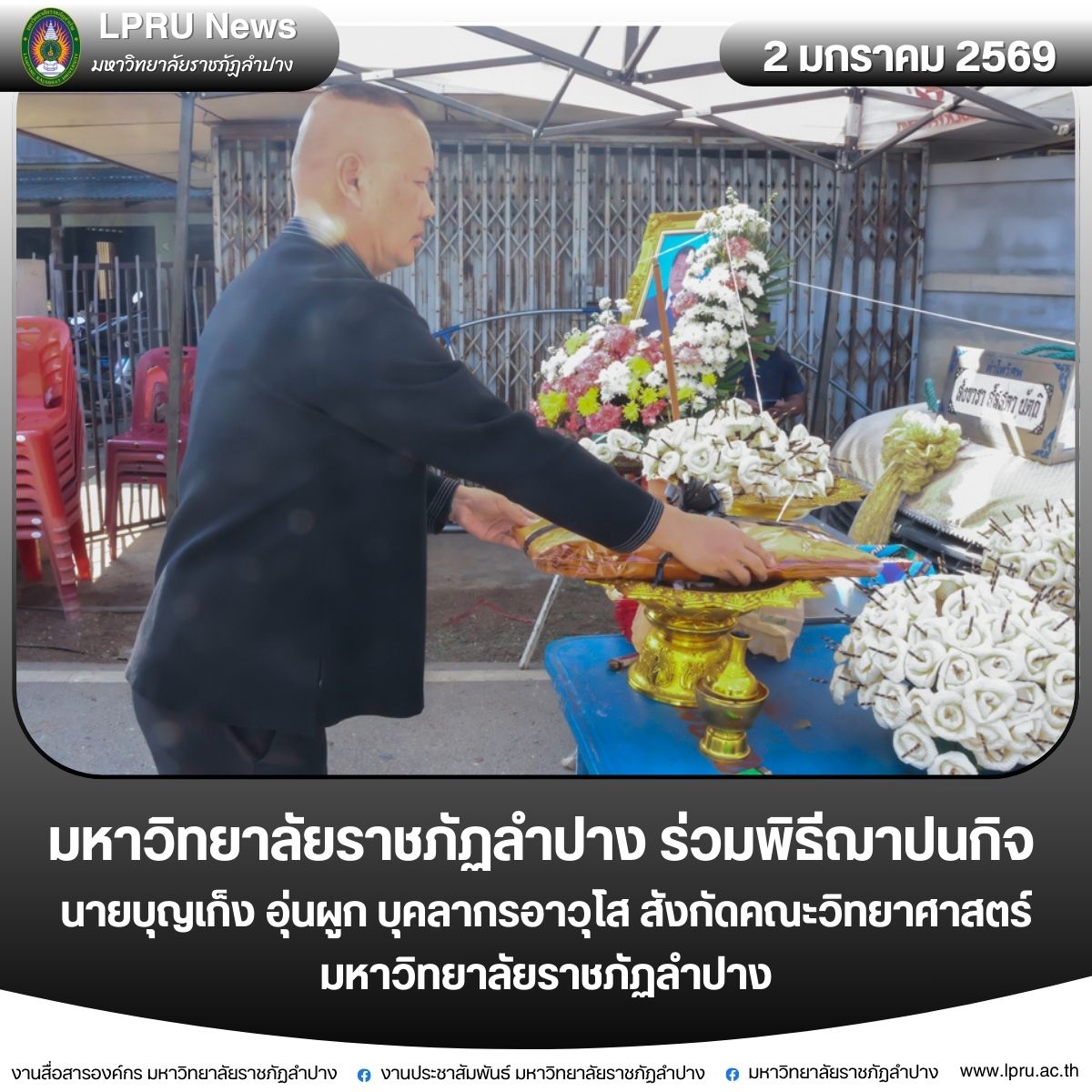 เมื่อวันที่ 2 มกราคม 2569 รศ.ดร.ปริเยศ สิทธิสรวง รองอธิการบดีฝ่ายบริหาร พร้อมด้วย น.ส.ศศธร เครือนันตา ปฏิบัติหน้าที่ในตำแหน่งหัวหน้างานบริหารทั่วไปและสื่อสารองค์กร มหาวิทยาลัยราชภัฏลำปาง บุคลากรอาวุโส และบุคลากรมหาวิทยาลัยราชภัฏลำปาง ร่วมพิธีฌาปนกิจ นายบุญเก็ง อุ่นผูก อายุ 68 ปี บุคลากรอาวุโส สังกัดคณะวิทยาศาสตร์ มหาวิทยาลัยราชภัฏลำปาง โดยได้เริ่มพิธีทางศาสนา ณ บ้านเลขที่ 83 หมู่ที่ 1 ตำบลกล้วยแพะ อำเภอเมือง จังหวัดลำปาง และจะดำเนินการฌาปนกิจ ณ ฌาปนสถานบ้านกล้วยหลวง ตำบลกล้วยแพะ อำเภอเมือง จังหวัดลำปาง ต่อไป
