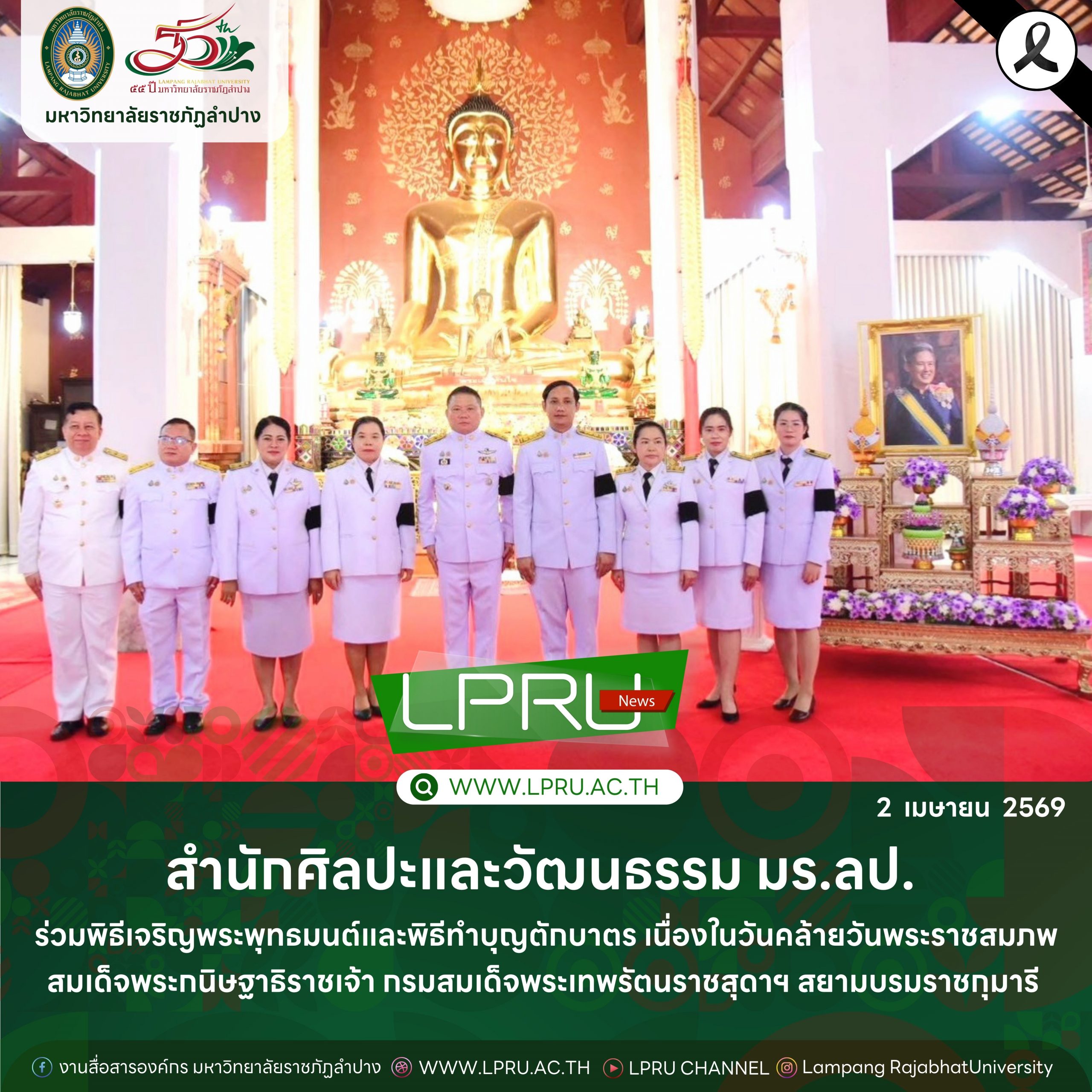 เมื่อวันที่ 2 เมษายน 2569 ผศ.เจษฎา ทองสุข ผู้อำนวยการสำนักศิลปะและวัฒนธรรม พร้อมด้วย น.ส.ธิดารัตน์ ไชยยาสืบ เจ้าหน้าที่บริหารงานทั่วไป ชำนาญการ รักษาการในตำแหน่งหัวหน้าสำนักงานผู้อำนวยการสำนักศิลปะและวัฒนธรรม และ น.ส.ปานฤทัย ไชยรังษี นักวิชาการศึกษา สำนักศิลปะและวัฒนธรรม มหาวิทยาลัยราชภัฏลำปาง ร่วมพิธีเจริญพระพุทธมนต์และทำบุญตักบาตร เพื่อเฉลิมพระเกียรติสมเด็จพระกนิษฐาธิราชเจ้า กรมสมเด็จพระเทพรัตนราชสุดาฯ สยามบรมราชกุมารี เนื่องในโอกาสวันคล้ายวันพระราชสมภพ 2 เมษายน ณ พระอุโบสถ วัดพระแก้วดอนเต้าสุชาดาราม พระอารามหลวง อำเภอเมืองลำปาง จังหวัดลำปาง โดยมี นายวิวัฒน์ อินทร์ไทยวงศ์ ผู้ว่าราชการจังหวัดลำปาง ประธานในพิธี