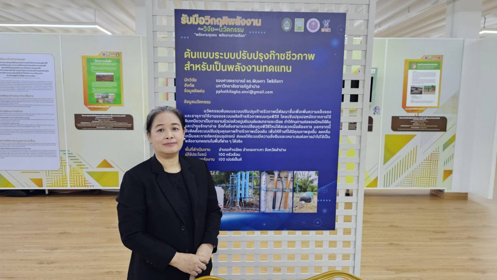 รศ.ดร.พิมผกา โพธิลังกา อาจารย์สังกัดสาขาวิชาวิทยาศาสตร์และเทคโนโลยีสิ่งแวดล้อม คณะวิทยาศาสตร์ มหาวิทยาลัยราชภัฏลำปาง ร่วมนำเสนอผลงานวิจัย “ต้นแบบระบบปรับปรุงก๊าซชีวภาพสำหรับเป็นพลังงานทดแทน” ซึ่งเป็นนวัตกรรมที่มุ่งเน้นการเพิ่มประสิทธิภาพของก๊าซชีวภาพให้สามารถนำไปใช้ทดแทนพลังงานเชื้อเพลิงในระดับชุมชนได้อย่างเป็นรูปธรรม ในงานแถลงข่าวรับมือวิกฤติพลังงานด้วยวิจัยและนวัตกรรม “พลังงานชุมชน พลังงานทางเลือก” เมื่อวันที่ 31 มีนาคม 2569 ณ ศูนย์ส่งเสริมการวิจัยเพื่อมรดกทางวัฒนธรรม ชั้น 2 อาคาร วช. 8 สำนักงานการวิจัยแห่งชาติ กรุงเทพ ฯ