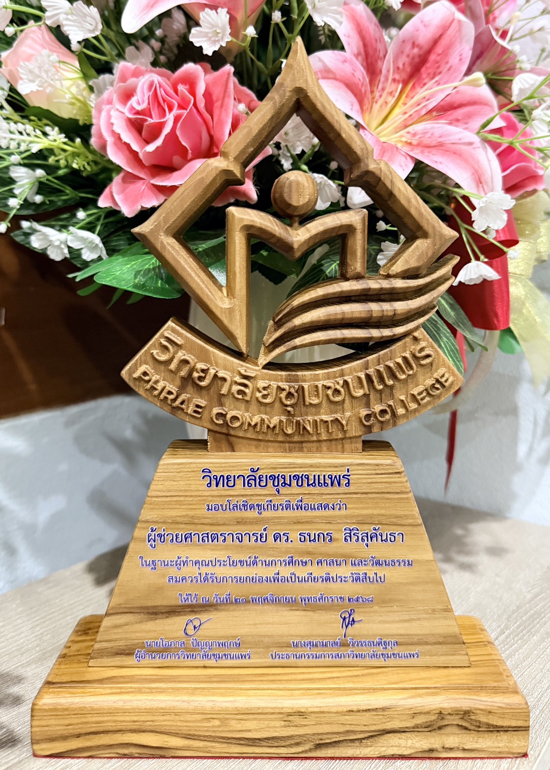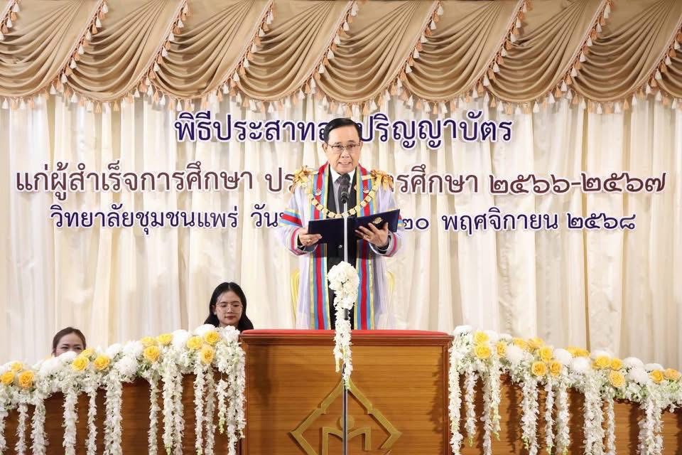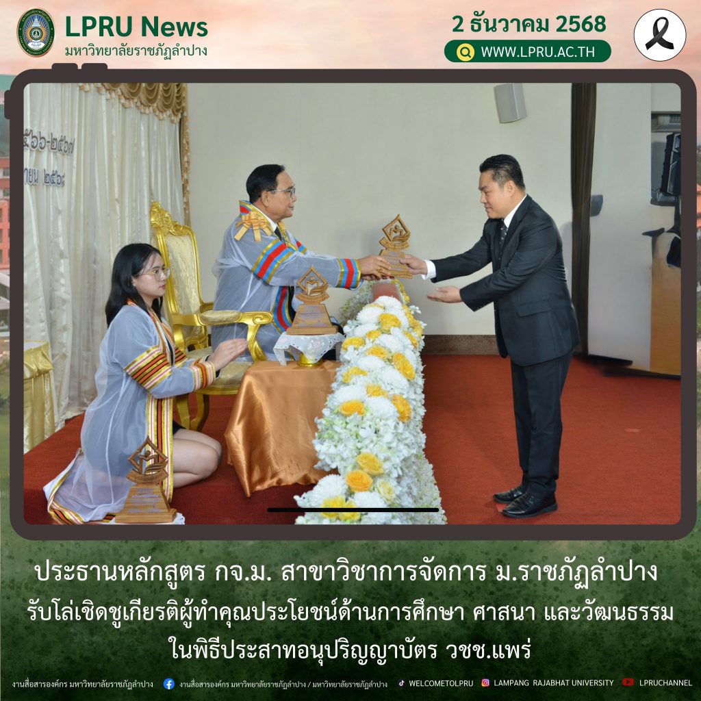 เมื่อวันที่ 20 พฤศจิกายน 2568 ผศ.ดร.ธนกร สิริสุคันธา ประธานหลักสูตรปริญญาโท การจัดการมหาบัณฑิต (กจ.ม.) สาขาวิชาการจัดการ คณะวิทยาการจัดการ มหาวิทยาลัยราชภัฏลำปาง ได้เข้ารับโล่เชิดชูเกียรติผู้ทำคุณประโยชน์ด้านการศึกษา ศาสนา และวัฒนธรรม จากองคมนตรี เพื่อเป็นเกียรติแก่ผู้ที่อุทิศตนทำงานเพื่อสังคมอย่างต่อเนื่อง ในพิธีประสาทอนุปริญญาบัตร ประจำปีการศึกษา 2566–2567 ณ ห้องประชุมชั้น 4 อาคารวิทยบริการ วิทยาลัยชุมชนแพร่ โดยได้รับเกียรติจาก พลเอกประยุทธ์ จันทร์โอชา องคมนตรี เป็นประธานในพิธี