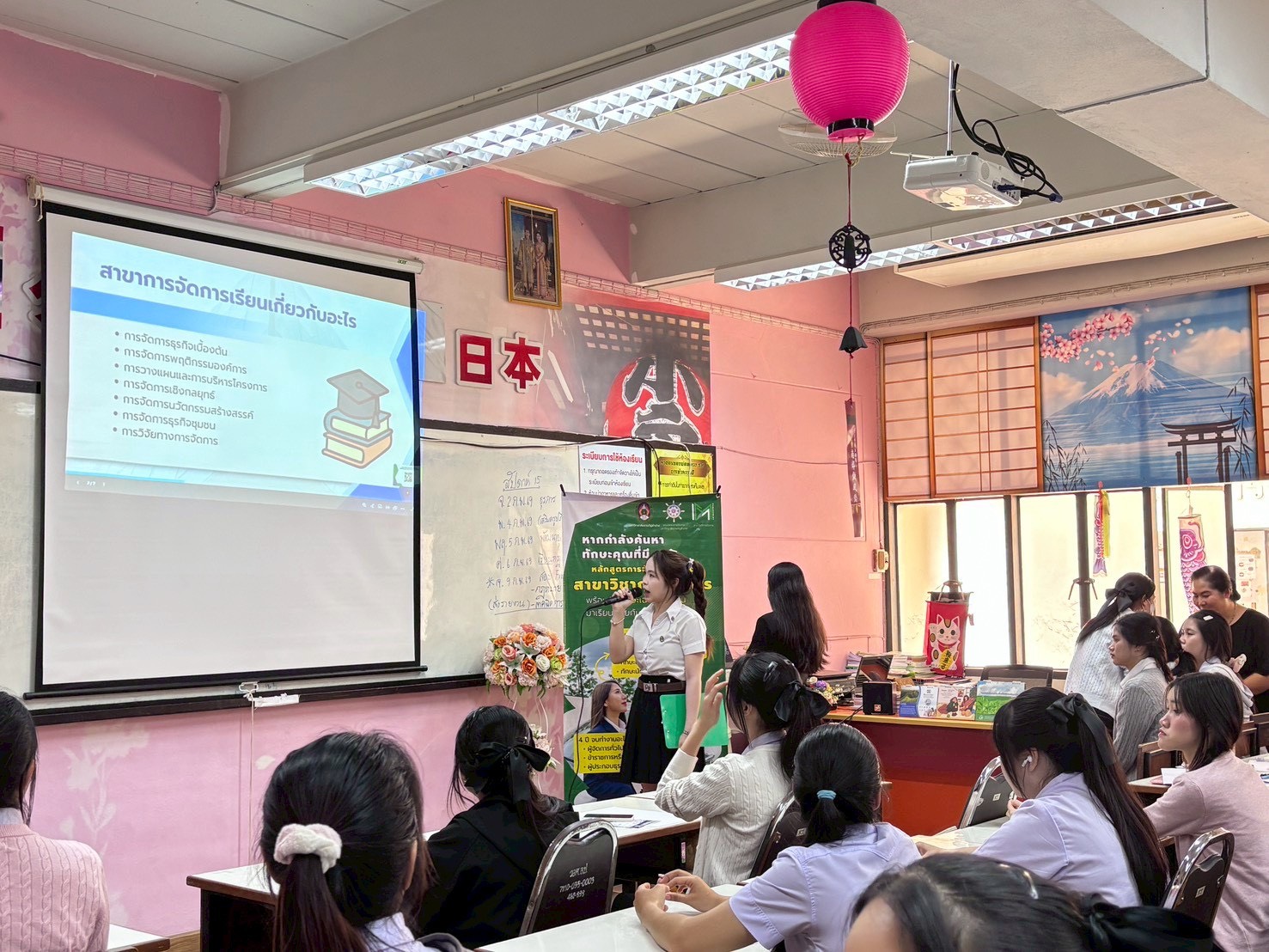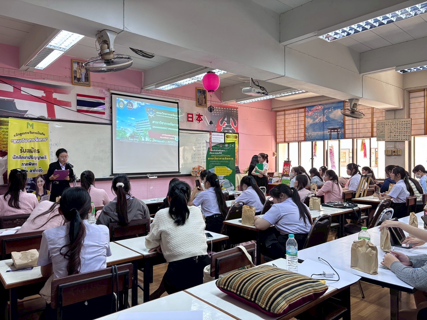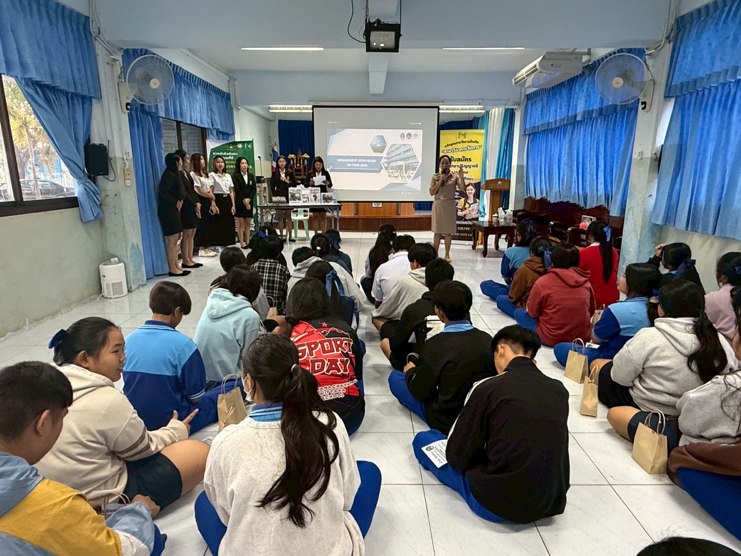 พร้อมกันนี้เมื่อวันที่ 2 กุมภาพันธ์ 2569 ได้จัดกิจกรรมดัวกล่าว ณ โรงเรียนเสด็จวนชยางค์กูล มีนักเรียนชั้นมัธยมศึกษาปีที่ 5 และปีที่ 6 เข้าร่วมกิจกรรมกว่า 70 คน ซึ่งเป็นส่วนหนึ่งในการจัดการเรียนรู้ภายใต้การเรียนการสอนรายวิชาการสื่อสารทางธุรกิจและเทคนิคการนำเสนอ ตามหลักสูตรการจัดการบัณฑิต สาขาวิชาการจัดการ โดยมีวัตถุประสงค์ในการจัดกิจกรรมเพื่อให้นักศึกษาเกิดการเรียนรู้เชิงบูรณาการจากการปฏิบัติตามจุดมุ่งหมายในรายวิชา รวมทั้งเพื่อให้สอดคล้องกับผลลัพธ์การเรียนรู้ที่คาดหวังของหลักสูตร (CLO YLO และ PLO) และเป็นการสร้างการรับรู้รายละเอียดของการเรียนการสอนให้กับนักเรียนใช้ประกอบการตัดสินใจเข้าศึกษาต่อในสาขาวิชาการจัดการอีกด้วย