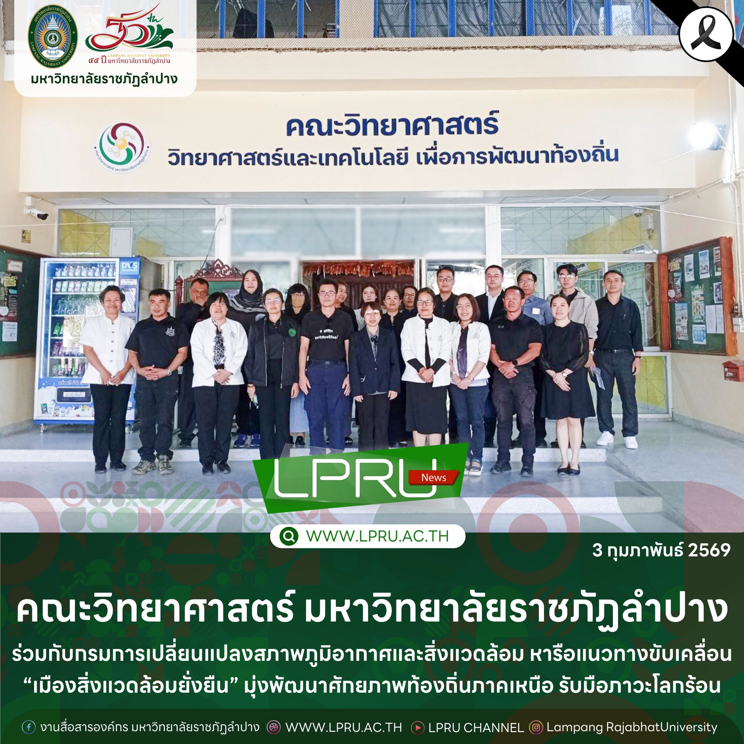 เมื่อวันที่ 3 กุมภาพันธ์ 2569 ผศ.พิภพ นราแก้ว คณบดีคณะวิทยาศาสตร์ มหาวิทยาลัยราชภัฏลำปาง พร้อมด้วย คณาจารย์และบุคลากร ให้การต้อนรับ นางผการัตน์ เพ็งสวัสดิ์ ผู้อำนวยการกลุ่มส่งเสริมการจัดการเมืองยั่งยืน กรมการเปลี่ยนแปลงสภาพภูมิอากาศและสิ่งแวดล้อม และคณะ ในการหารือแนวทางขับเคลื่อน “เมืองสิ่งแวดล้อมยั่งยืน” มุ่งพัฒนาศักยภาพท้องถิ่นภาคเหนือรับมือภาวะโลกร้อน ณ ห้องประชุม 23112 คณะวิทยาศาสตร์ มหาวิทยาลัยราชภัฏลำปาง