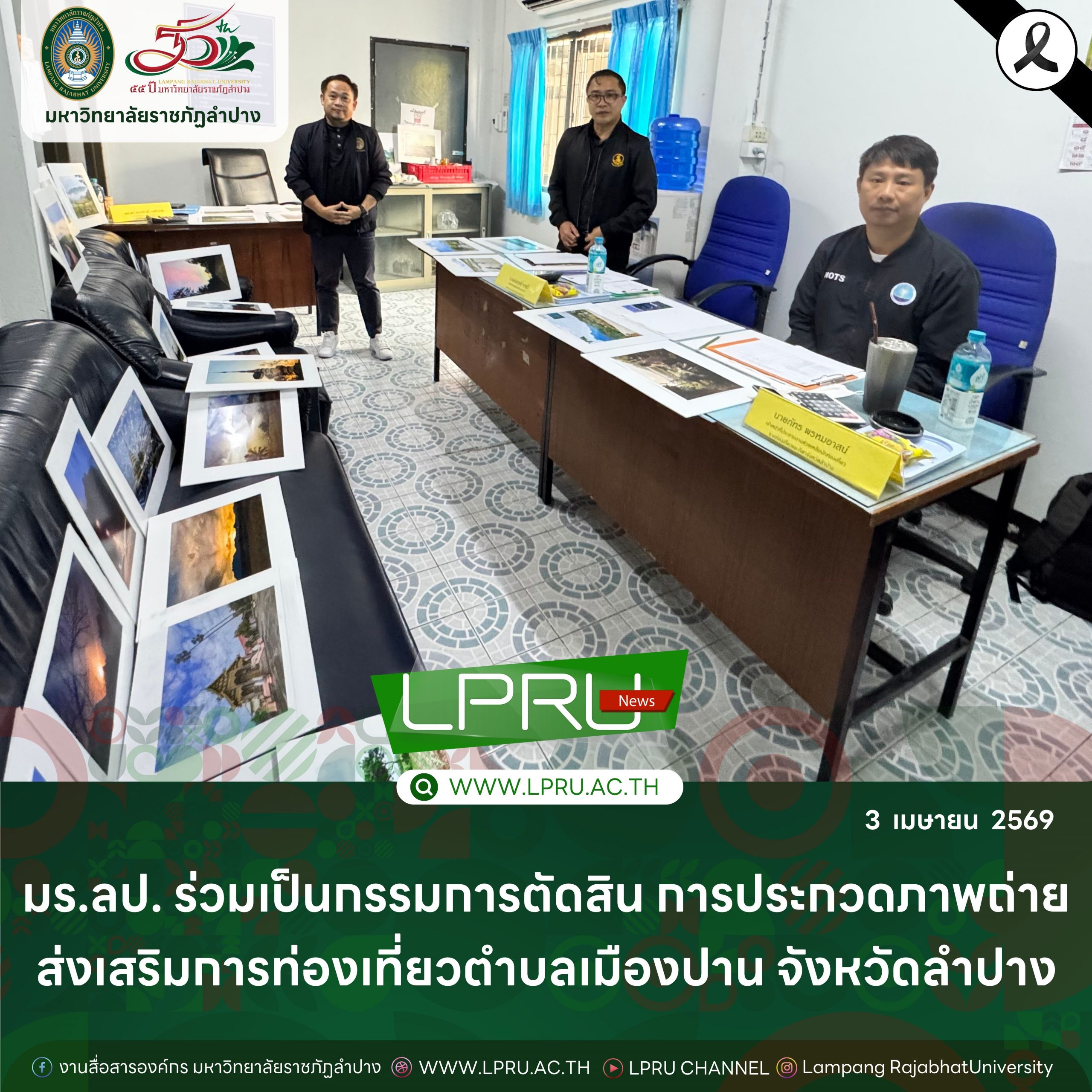 เมื่อวันที่ 2 เมษายน 2569 ผศ.ดร.ขจรศักดิ์ วงศ์วิราช อาจารย์สังกัดสาขาวิชาการจัดการ คณะวิทยาการจัดการ มหาวิทยาลัยราชภัฏลำปาง เข้าร่วมเป็นกรรมการตัดสิน การประกวดภาพถ่ายเพื่อส่งเสริมการท่องเที่ยว ณ ห้องประชุมเทศบาลตำบลเมืองปาน อำเภอเมืองปาน จังหวัดลำปาง โดยมี เจ้าหน้าที่ประสานงานช่วยเหลือนักท่องเที่ยว สำนักงานการท่องเที่ยวและกีฬาจังหวัดลำปาง พร้อมด้วย นายอัมฤทธิ์ จานุวี นักประชาสัมพันธ์ ชำนาญการ สำนักประชาสัมพันธ์จังหวัดลำปาง ร่วมเป็นกรรมการตัดสินในครั้งนี้