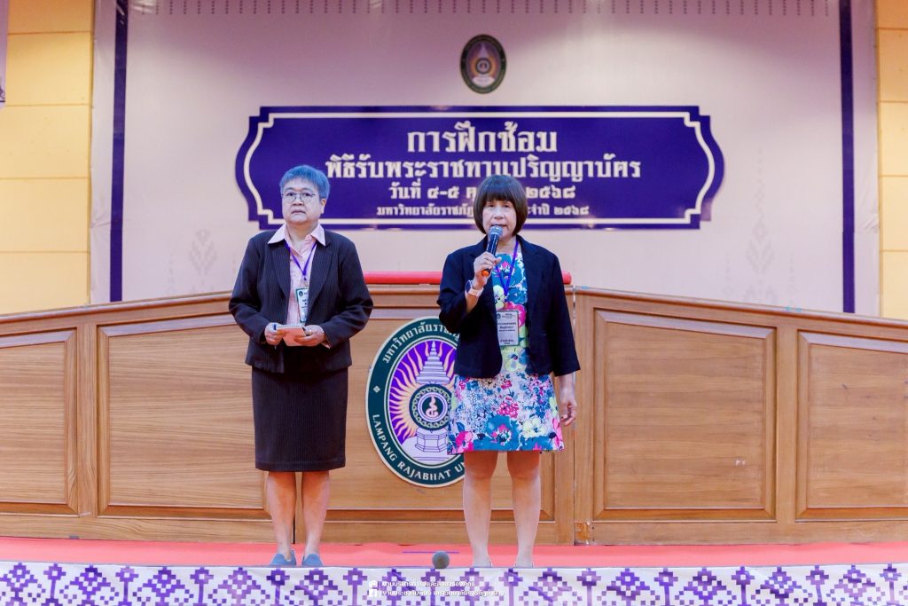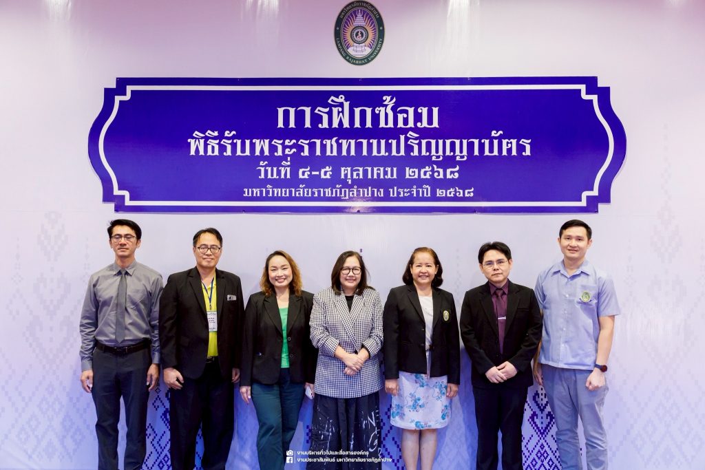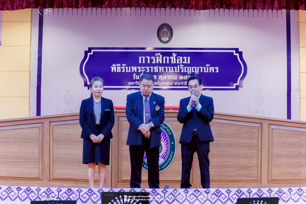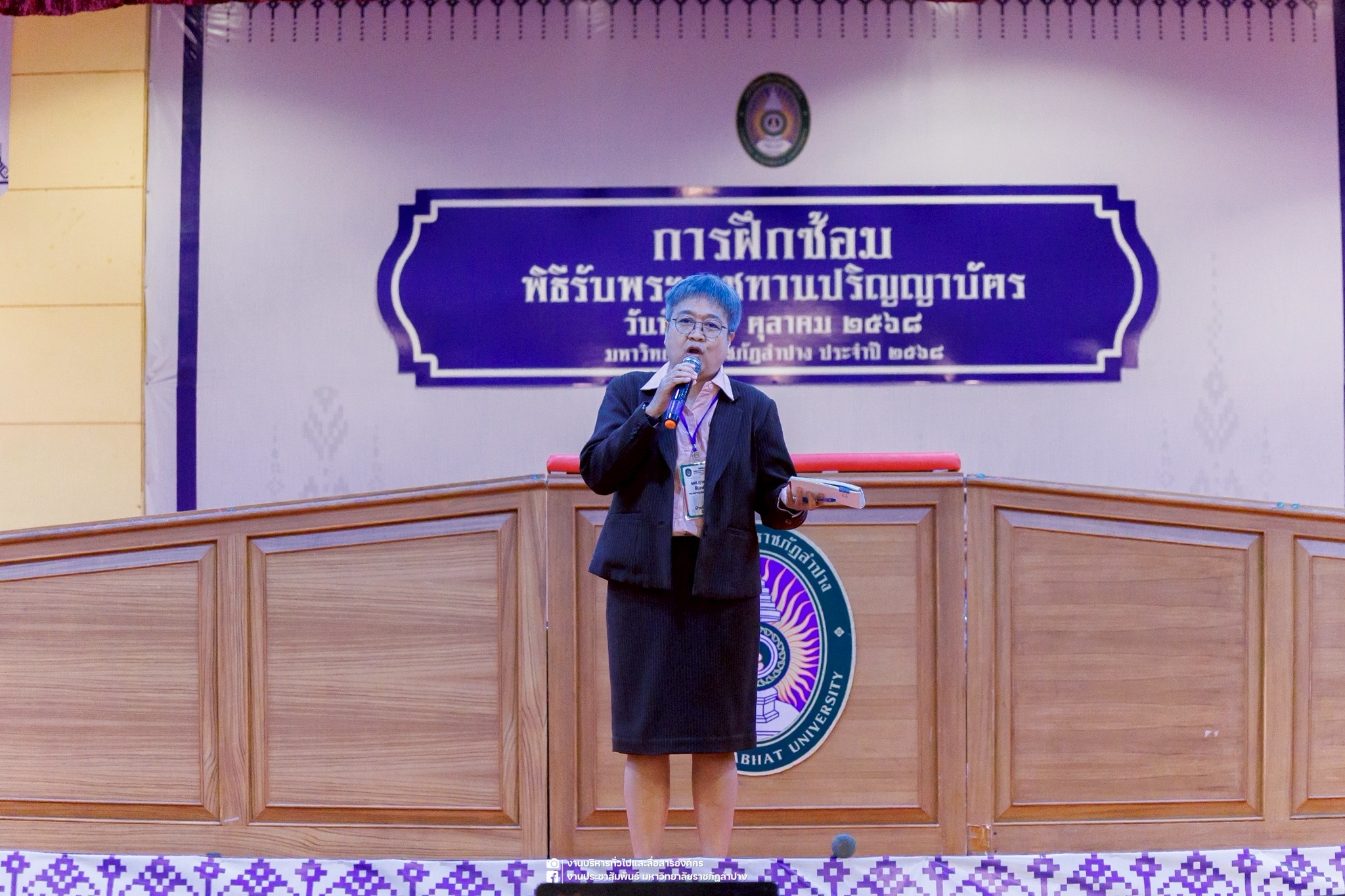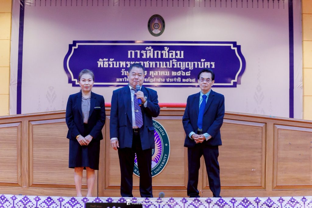 เมื่อวันที่ 4 ตุลาคม 2568 รศ.ดร.กิตติศักดิ์ สมุทธารักษ์ อธิการบดีมหาวิทยาลัยราชภัฏลำปาง เป็นประธานกล่าวต้อนรับบัณฑิตที่เข้ารับการฝึกซ้อมพิธีพระราชทานปริญญาบัตร สำหรับผู้สำเร็จการศึกษาประจำปีการศึกษา 2566 ณ หอประชุมจันทน์ผา มหาวิทยาลัยราชภัฏลำปาง ทั้งนี้นายราชิต ตั้งพระกิตติคุณ พร้อมด้วยนายสมบูรณ์ วงศ์เรือน อุปนายกสมาคมศิษย์เก่า มหาวิทยาลัยราชภัฏลำปาง และ น.ส.วันเพ็ญ เค็มมาก ผู้ช่วยเลขานุการสมาคม ได้ร่วมพูดคุยกับบัณฑิตในกิจกรรมพบปะศิษย์เก่า โดยมี คณะผู้บริหาร คณาจารย์ ให้การต้อนรับบัณฑิตอย่างอบอุ่น พร้อมกันนี้ ผศ.สุวรรณี จันทร์ตา รองอธิการบดีฝ่ายวิชาการ พร้อมด้วยคณะกรรมการฝ่ายฝึกซ้อม กล่าวต้อนรับและดำเนินการฝึกซ้อมการเข้ารับปริญญาบัตร ซึ่งบัณฑิตเข้าร่วมการฝึกซ้อม 240 คน
