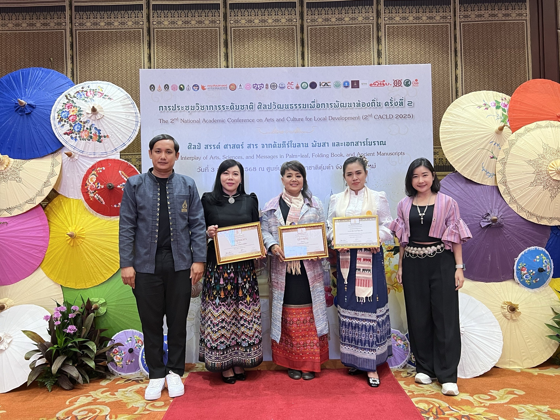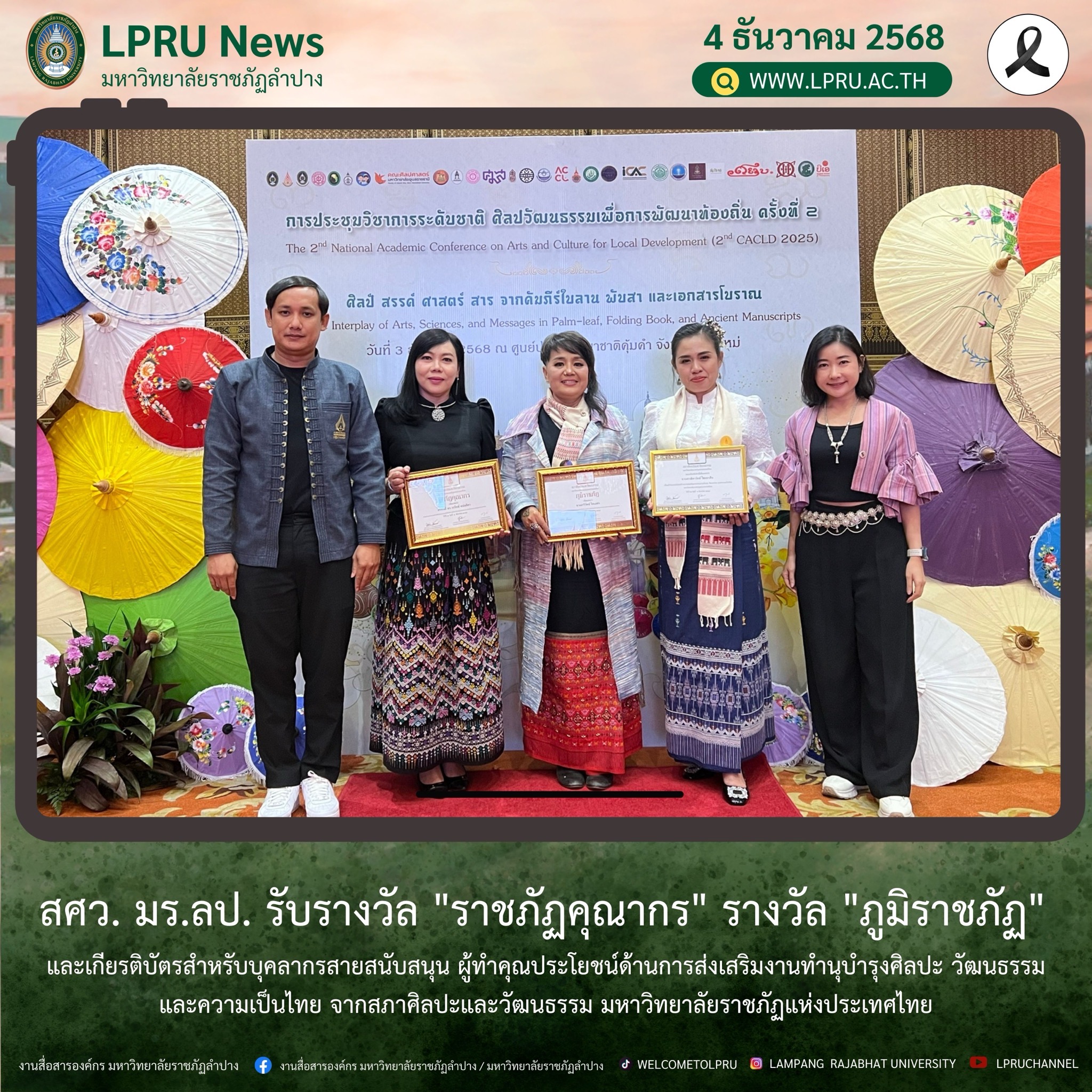 เมื่อวันที่ 2 ธันวาคม 2568 ผศ.เจษฎา ทองสุข ผู้อำนวยการสำนักศิลปะและวัฒนธรรม มหาวิทยาลัยราชภัฏลำปาง พร้อมด้วย อ.ดร.เยาวลักษณ์ งามแสนโรจน์ รองผู้อำนวยการสำนักศิลปะและวัฒนธรรม น.ส.ธิดารัตน์ ไชยยาสืบ รักษาการในตำแหน่งหัวหน้าสำนักงานผู้อำนวยการสำนักศิลปะและวัฒนธรรม นายอาทิตย์ สุปินะ นักวิชาการศึกษา ร่วมพิธีมอบรางวัล “ราชภัฏคุณากร” รางวัล “ภูมิราชภัฏ” และเกียรติบัตรสำหรับบุคลากรสายสนับสนุน ผู้ทำคุณประโยชน์ด้านการส่งเสริมงานทำนุบำรุงศิลปะ วัฒนธรรม และความเป็นไทย จากสภาศิลปะและวัฒนธรรม ณ มหาวิทยาลัยราชภัฏเชียงใหม่ อำเภอเมือง จังหวัดเชียงใหม่