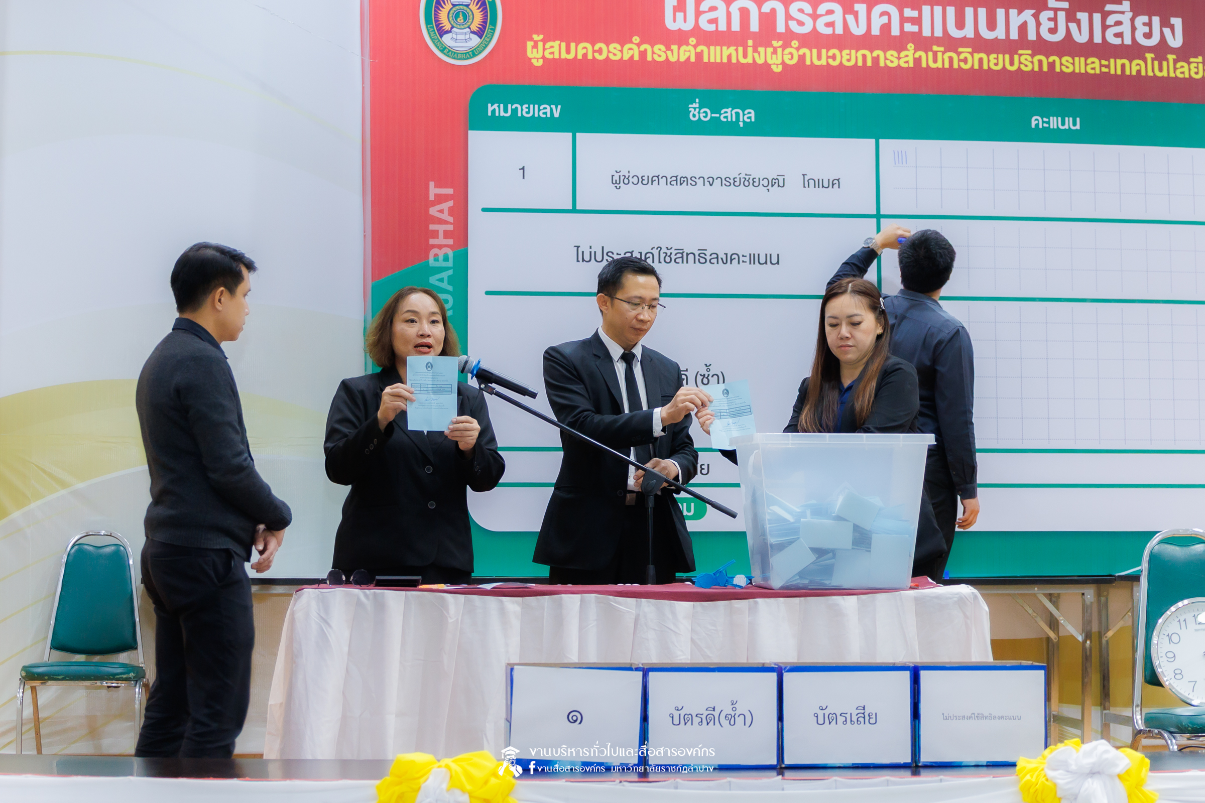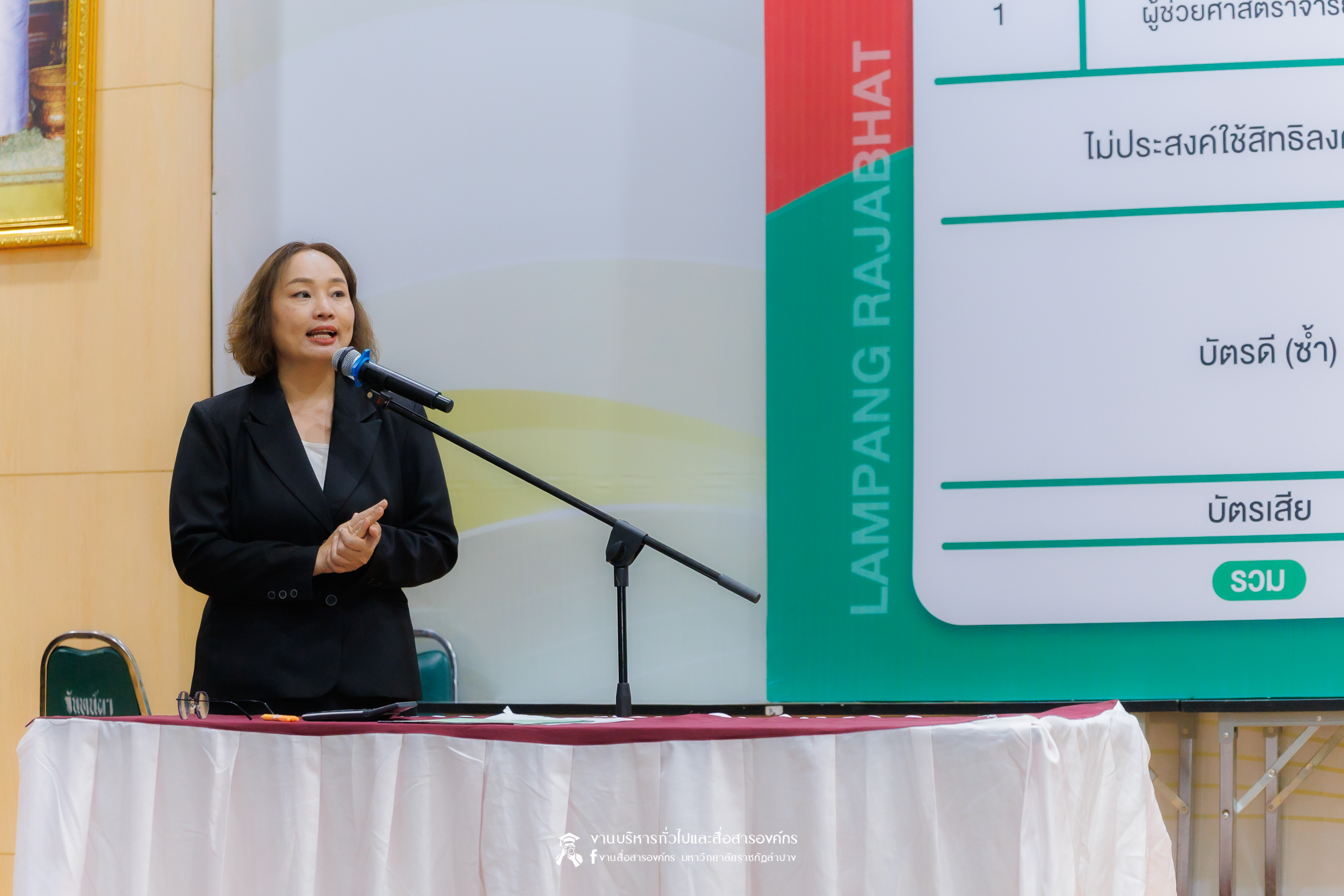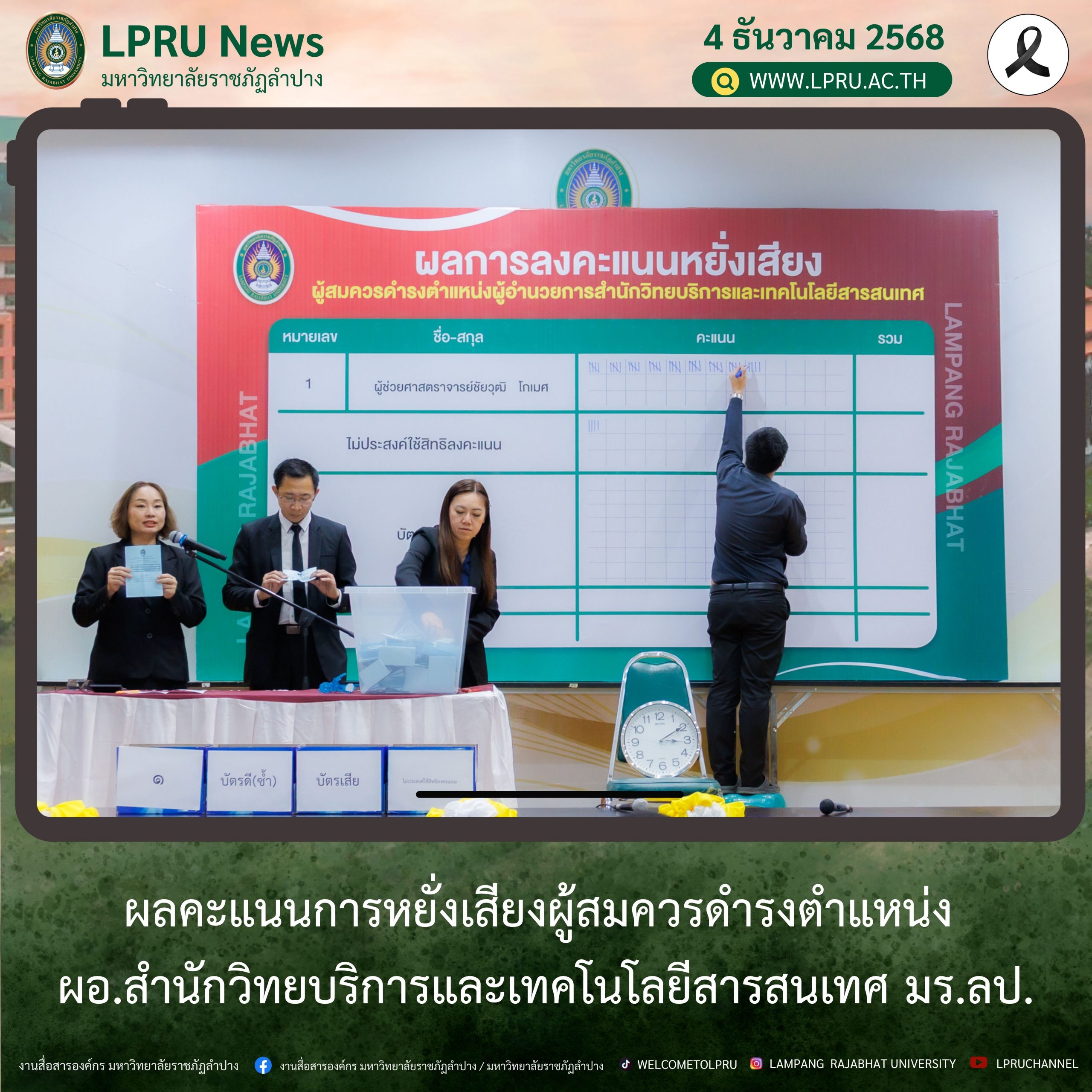 เมื่อวันที่ 4 ธันวาคม 2568 เวลา 15.01 น. สำนักงานสภามหาวิทยาลัยราชภัฏลำปาง โดย รศ.ดร.กิตติศักดิ์ สมุทธารักษ์ อธิการบดีมหาวิทยาลัยราชภัฏลำปาง ประธานคณะกรรมการสรรหาบุคคลเพื่อแต่งตั้งเป็นผู้อำนวยการสำนักวิทยบริการและเทคโนโลยีสารสนเทศ มหาวิทยาลัยราชภัฏลำปาง พร้อมคณะ ได้ดำเนินการนับคะแนนการหยั่งเสียงผู้สมควรดำรงตำแหน่งผู้อำนวยการสำนักศิลปะและวัฒนธรรม มหาวิทยาลัยราชภัฏลำปาง ณ ห้องประชุมโอฬารรัตน์ ชั้น 1 อาคารโอฬาร โรจน์หิรัญ