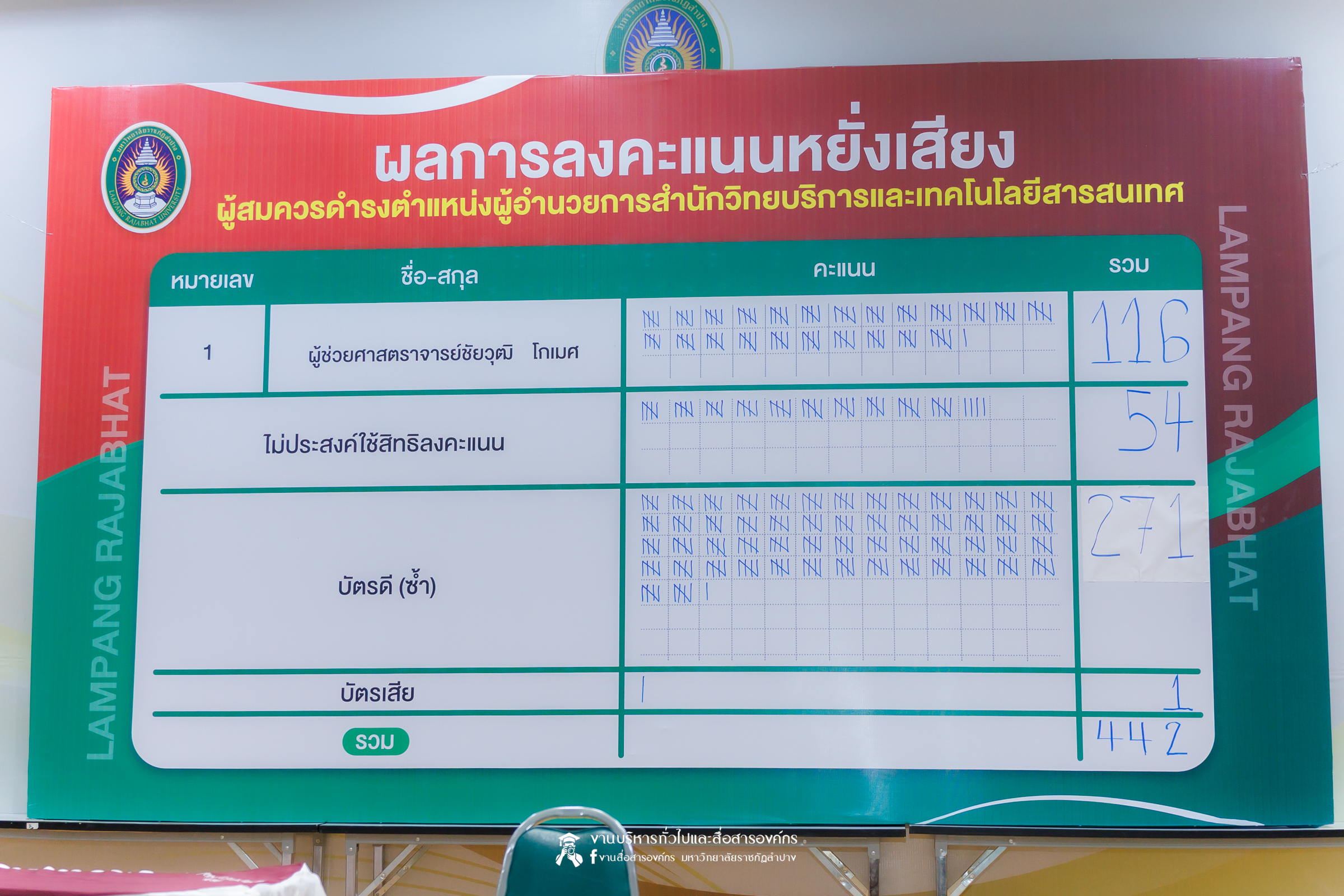 ผลคะแนนการหยั่งเสียงผู้สมควรดำรงตำแหน่ง ผอ. สำนักวิทยบริการและเทคโนโลยีสารสนเทศ มร.ลป.