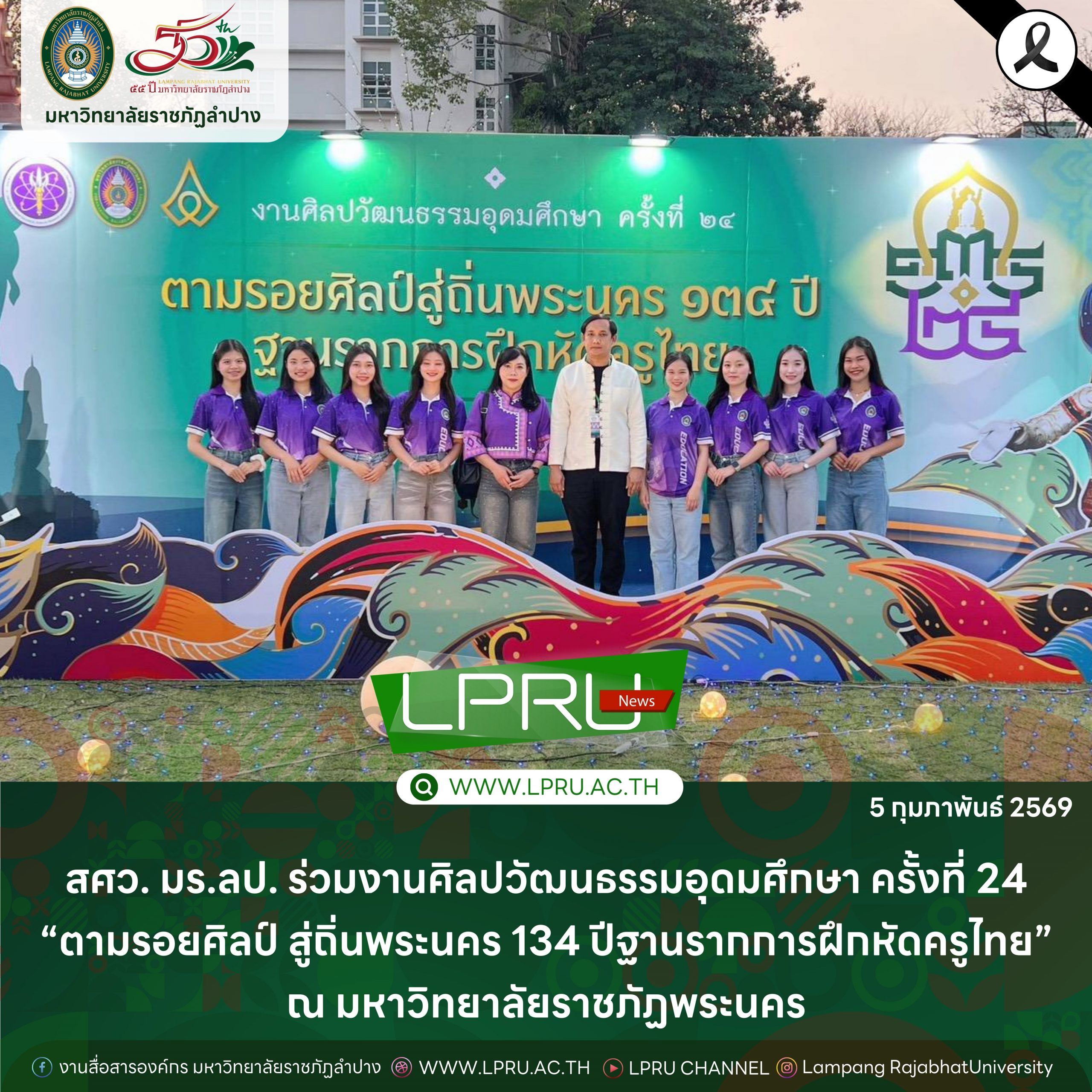 ผศ.เจษฎา ทองสุข ผู้อำนวยการสำนักศิลปะและวัฒนธรรม มหาวิทยาลัยราชภัฏลำปาง พร้อมด้วย อ.ดร.เยาวลักษณ์ งามแสนโรจน์ และนักศึกษา ร่วมงานศิลปวัฒนธรรมอุดมศึกษา ครั้งที่ 24 “ตามรอยศิลป์ สู่ถิ่นพระนคร 134 ปีฐานรากการฝึกหัดครูไทย”เมื่อวันที่ 4 -5 กุมภาพันธ์ 2569 ณ มหาวิทยาลัยราชภัฏพระนคร โดยได้รับเกียรติจาก นางวัฒนาโสภี สุขสอาด ที่ปรึกษาด้านยุทธศาสตร์และแผนอุดมศึกษา วิทยาศาสตร์ วิจัยและนวัตกรรม เป็นประธานในพิธีเปิด รศ.ดร.เปรื่อง กิจรัตน์ภร รักษาราชการแทนอธิการบดีมหาวิทยาลัยราชภัฏพระนคร กล่าวต้อนรับ