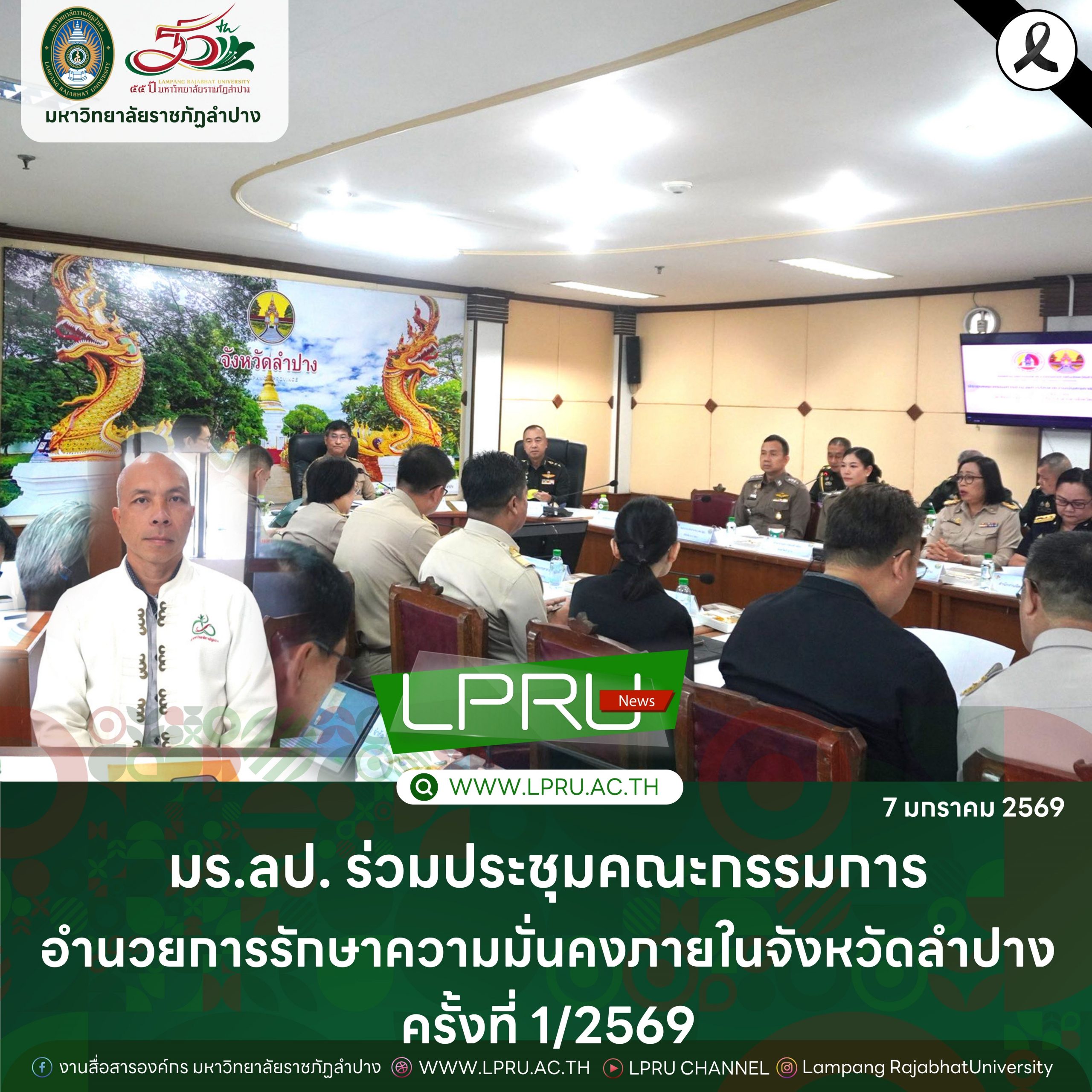 ผศ.เอกรัฐ อินต๊ะวงศา ผู้ช่วยอธิการบดีด้านงานบริหารทั่วไป มหาวิทยาลัยราชภัฏลำปาง ร่วมประชุมคณะกรรมการอำนวยการรักษาความมั่นคงภายในจังหวัดลำปาง ครั้งที่ 1/2569 ณ ห้องประชุมเวียงละกอน ชั้น 4 ศาลากลางจังหวัดลำปาง เมื่อวันที่ 7 มกราคม 2569 โดยมี นายพัชระ สิมะเสถียร รองผู้ว่าราชการจังหวัดลำปาง เป็นประธานการประชุม หัวหน้าส่วนราชการ เจ้าหน้าที่จากหน่วยงานที่เกี่ยวข้องเข้าร่วมประชุมฯ