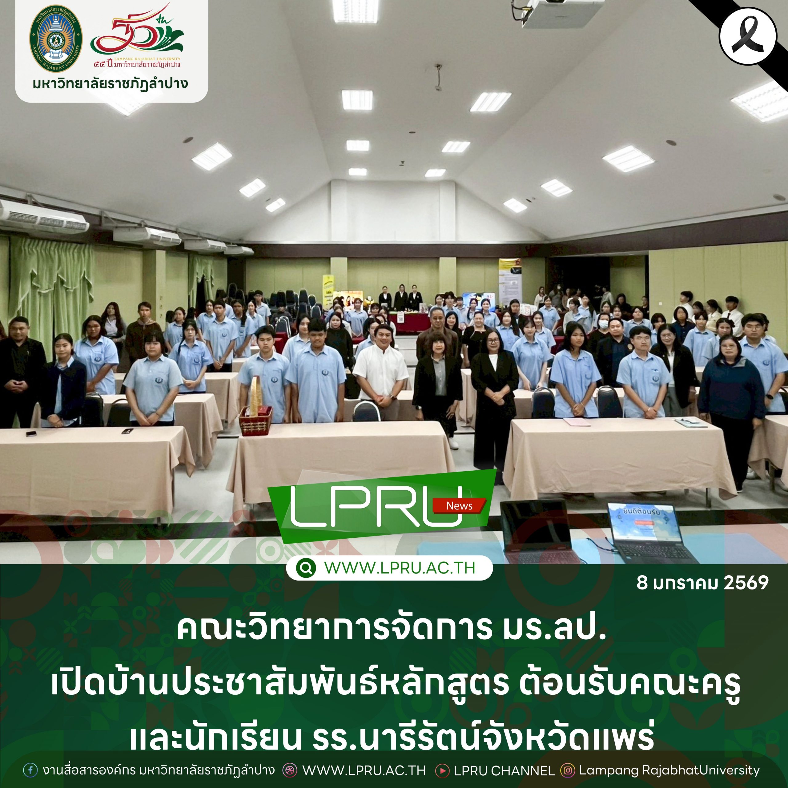 เมื่อวันที่ 7 มกราคม 2569 อ.ดร.นุสรา แสงอร่าม คณบดีคณะวิทยาการจัดการ พร้อมด้วยคณะผู้บริหาร คณาอาจารย์ และนักศึกษา สังกัดคณะวิทยาการจัดการ ร่วมต้อนรับ ว่าที่ ร.ต.บุญญบัตร ฐาปะนา ครู วิทยฐานะ ครูชำนาญการพิเศษ พร้อมด้วย คณะครูและนักเรียนกลุ่มการเรียนบัญชีและการบริหารธุรกิจ โรงเรียนนารีรัตน์จังหวัดแพร่ จำนวน 52 คน เข้าศึกษาดูงานและเรียนรู้หลักสูตรการเรียนการสอนของคณะวิทยาการจัดการ มหาวิทยาลัยราชภัฏลำปาง ณ ห้องประชุมธัญกร คณะวิทยาการจัดการ มหาวิทยาลัยราชภัฏลำปาง