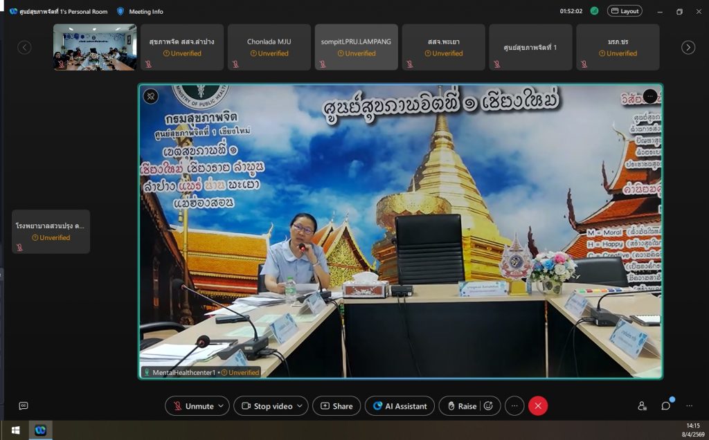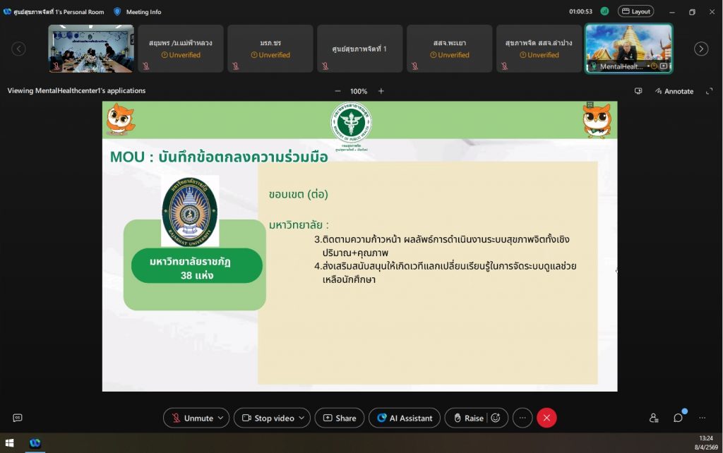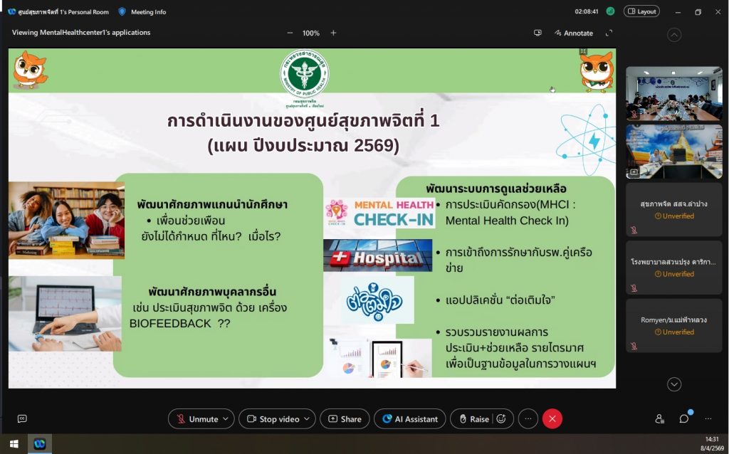 การประชุมในครั้งนี้ จัดโดยศูนย์สุขภาพจิตที่ 1 เชียงใหม่ เพื่อชี้แจงแนวทางการดูแลช่วยเหลือและการส่งเสริมสุขภาพจิตให้กับนักศึกษามหาวิทยาลัย ของหน่วยงานกรมสุขภาพจิตและโรงพยาบาลคู่เครือข่าย รวมทั้งทบทวนแผนการดำเนินงาน ปีงบประมาณ 2569 ให้เป็นปัจจุบัน สอดคล้องกับความจำเป็นและความต้องการของมหาวิทยาลัย โดยมีนายชูพงษ์ สังข์ผลิพันธ์ ผู้อำนวยการศูนย์สุขภาพจิตที่ 1 เป็นประธานการประชุม พร้อมด้วยผู้บริหาร อาจารย์ บุคลากร มหาวิทยาลัยราชภัฏลำปาง มหาวิทยาลัยราชภัฏเชียงใหม่ มหาวทิยาลัยราชภัฏเชียงราย มหาวิทยาลัยเทคโนโลยีราชมงคลล้านนา มหาวิทยาลัยเชียงใหม่ มหาวิทยาลัยแม่โจ้ มหาวิทยาลัยแม่ฟ้าหลวง และมหาวิทยาลัยพะเยา รวมถึงโรงพยาบาลคู่เครือข่าย ประกอบด้วย โรงพยาบาลลำปาง โรงพยาบาลนครพิงค์ โรงพยาบาลเชียงรายราชประชานุเคราะห์ โรงพยาบาลพะเยา โรงพยาบาลสวนปรุงและผู้แทนหน่วยงานที่เกี่ยวข้องเข้าร่วมประชุมในครั้งนี้