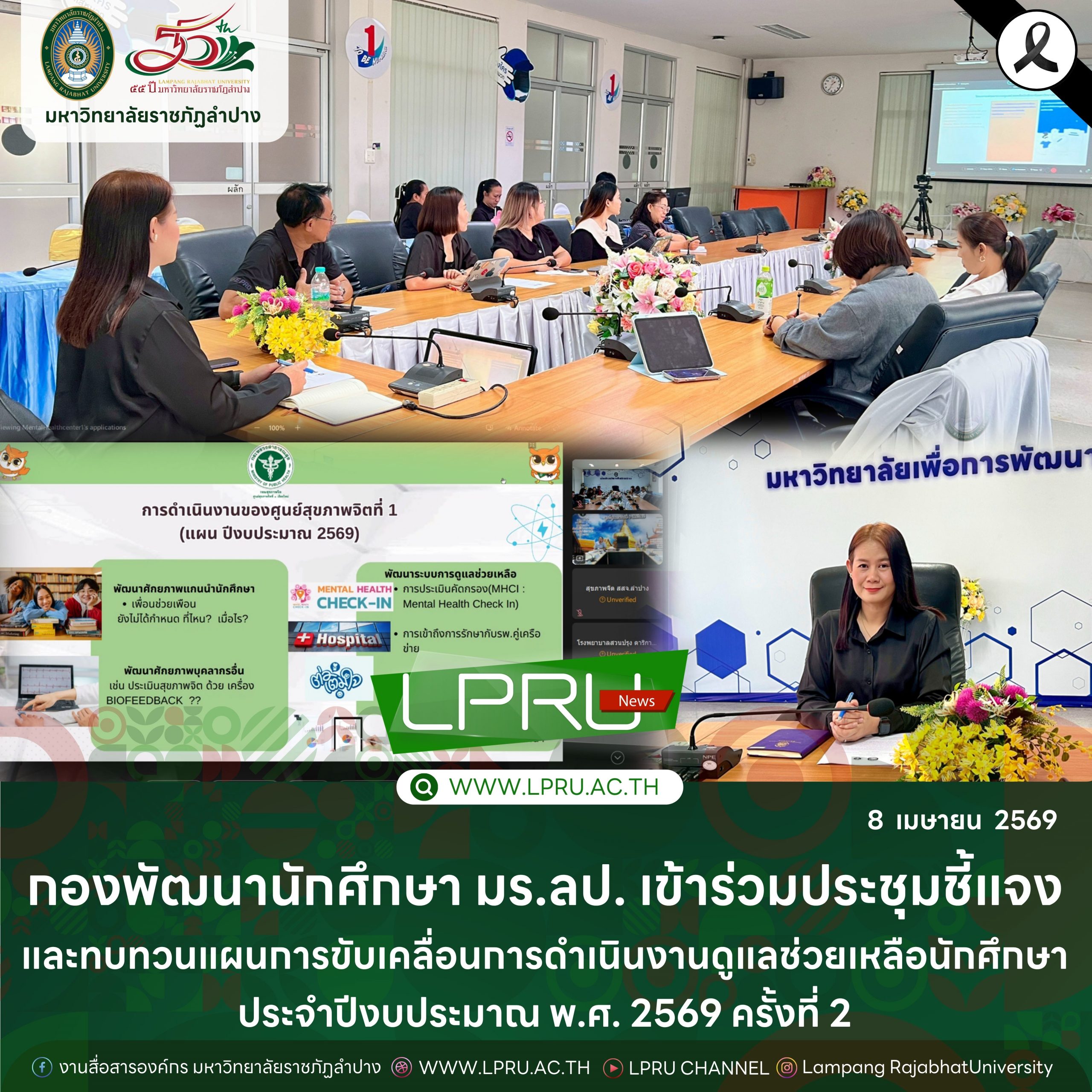 กองพัฒนานักศึกษา มร.ลป. เข้าร่วมประชุมชี้แจงและทบทวนแผนการขับเคลื่อนการดำเนินงานดูแลช่วยเหลือนักศึกษา ประจำปีงบประมาณ พ.ศ. 2569 ครั้งที่ 2
