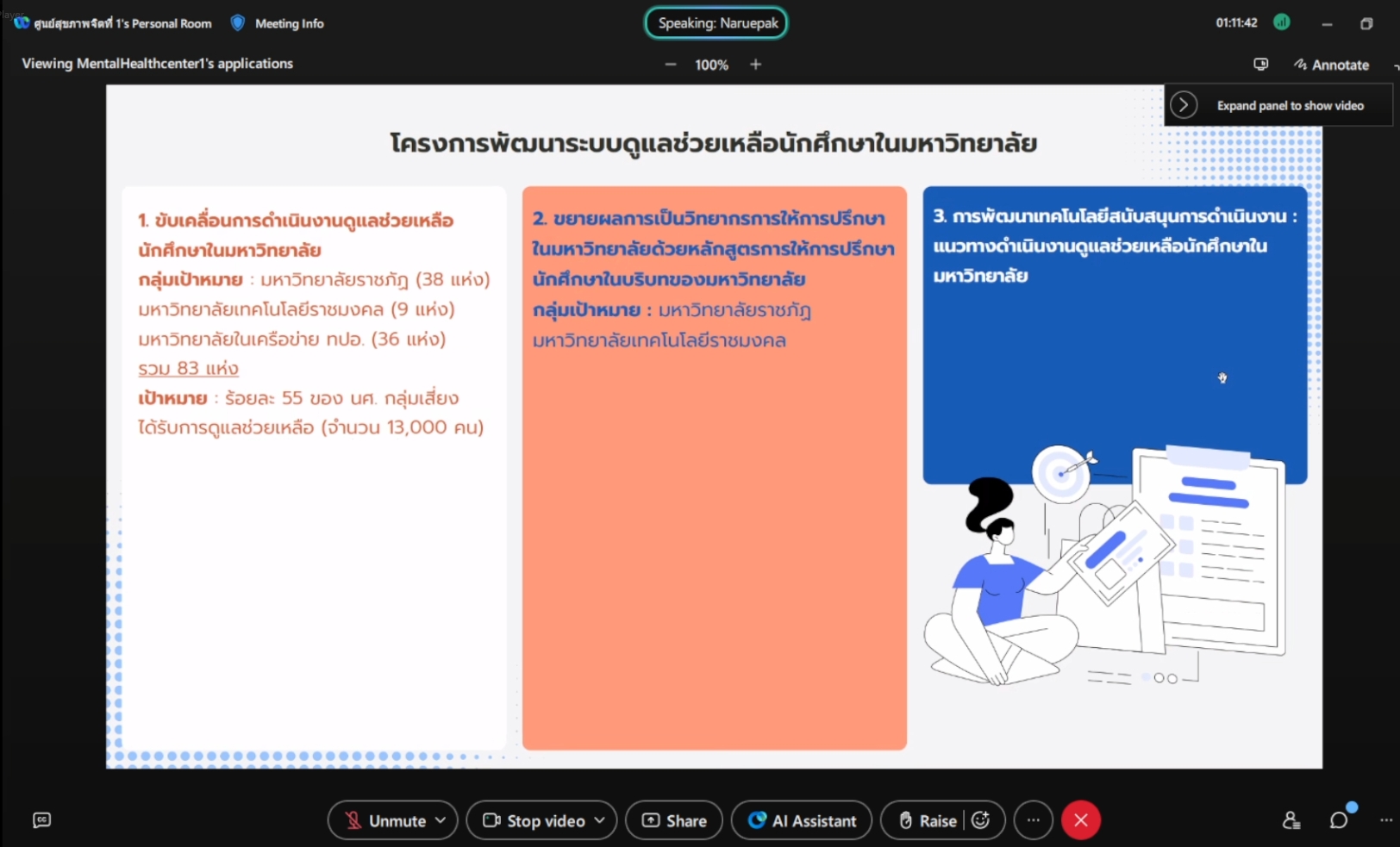 การประชุมในครั้งนี้ จัดโดยศูนย์สุขภาพจิตที่ 1 เชียงใหม่ เพื่อชี้แจงแนวทางการดูแลช่วยเหลือและการส่งเสริมสุขภาพจิตให้กับนักศึกษามหาวิทยาลัย ของหน่วยงานกรมสุขภาพจิตและโรงพยาบาลคู่เครือข่าย รวมทั้งทบทวนแผนการดำเนินงาน ปีงบประมาณ 2569 ให้เป็นปัจจุบัน สอดคล้องกับความจำเป็นและความต้องการของมหาวิทยาลัย โดยมีนายชูพงษ์ สังข์ผลิพันธ์ ผู้อำนวยการศูนย์สุขภาพจิตที่ 1 เป็นประธานการประชุม พร้อมด้วยผู้บริหาร อาจารย์ บุคลากร มหาวิทยาลัยราชภัฏลำปาง มหาวิทยาลัยราชภัฏเชียงใหม่ มหาวทิยาลัยราชภัฏเชียงราย มหาวิทยาลัยเทคโนโลยีราชมงคลล้านนา มหาวิทยาลัยเชียงใหม่ มหาวิทยาลัยแม่โจ้ มหาวิทยาลัยแม่ฟ้าหลวง และมหาวิทยาลัยพะเยา รวมถึงโรงพยาบาลคู่เครือข่าย ประกอบด้วย โรงพยาบาลลำปาง โรงพยาบาลนครพิงค์ โรงพยาบาลเชียงรายราชประชานุเคราะห์ โรงพยาบาลพะเยา โรงพยาบาลสวนปรุงและผู้แทนหน่วยงานที่เกี่ยวข้องเข้าร่วมประชุมในครั้งนี้