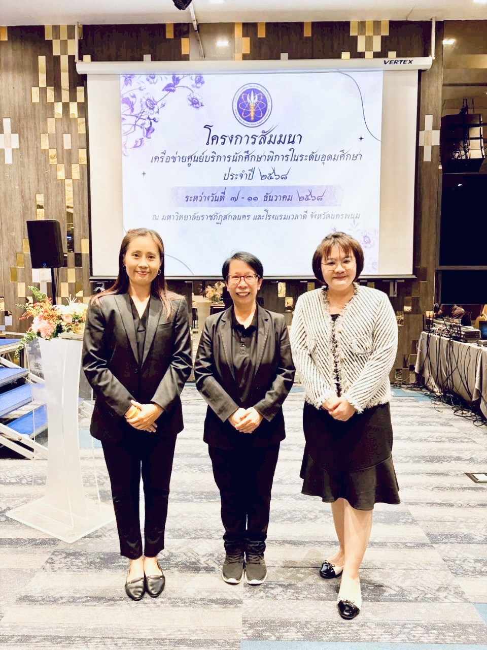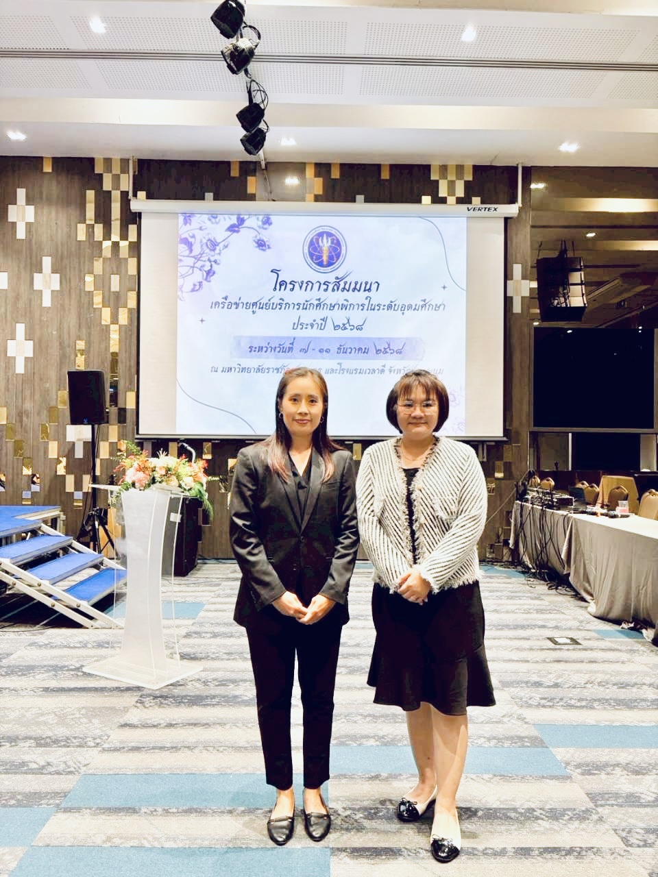 เมื่อวันที่ 7 ธันวาคม 2568 น.ส.โชติมนต์ สีตาบุตร เจ้าหน้าที่บริหารงานทั่วไป ชำนาญการ พร้อมด้วย น.ส.ศิริลักษณ์ พิลัยหล้า นักวิชาการศึกษา ปฏิบัติการ งานบริการและสวัสดิการนักศึกษา กองพัฒนานักศึกษา เข้าร่วมโครงการสัมมนาเครือข่ายศูนย์บริการนักศึกษาพิการในระดับอุดมศึกษา ระหว่างวันที่ 7 – 11 ธันวาคม 2568 ณ มหาวิทยาลัยราชภัฏสกลนคร และโรงแรมเวลาดี จังหวัดนครพนม