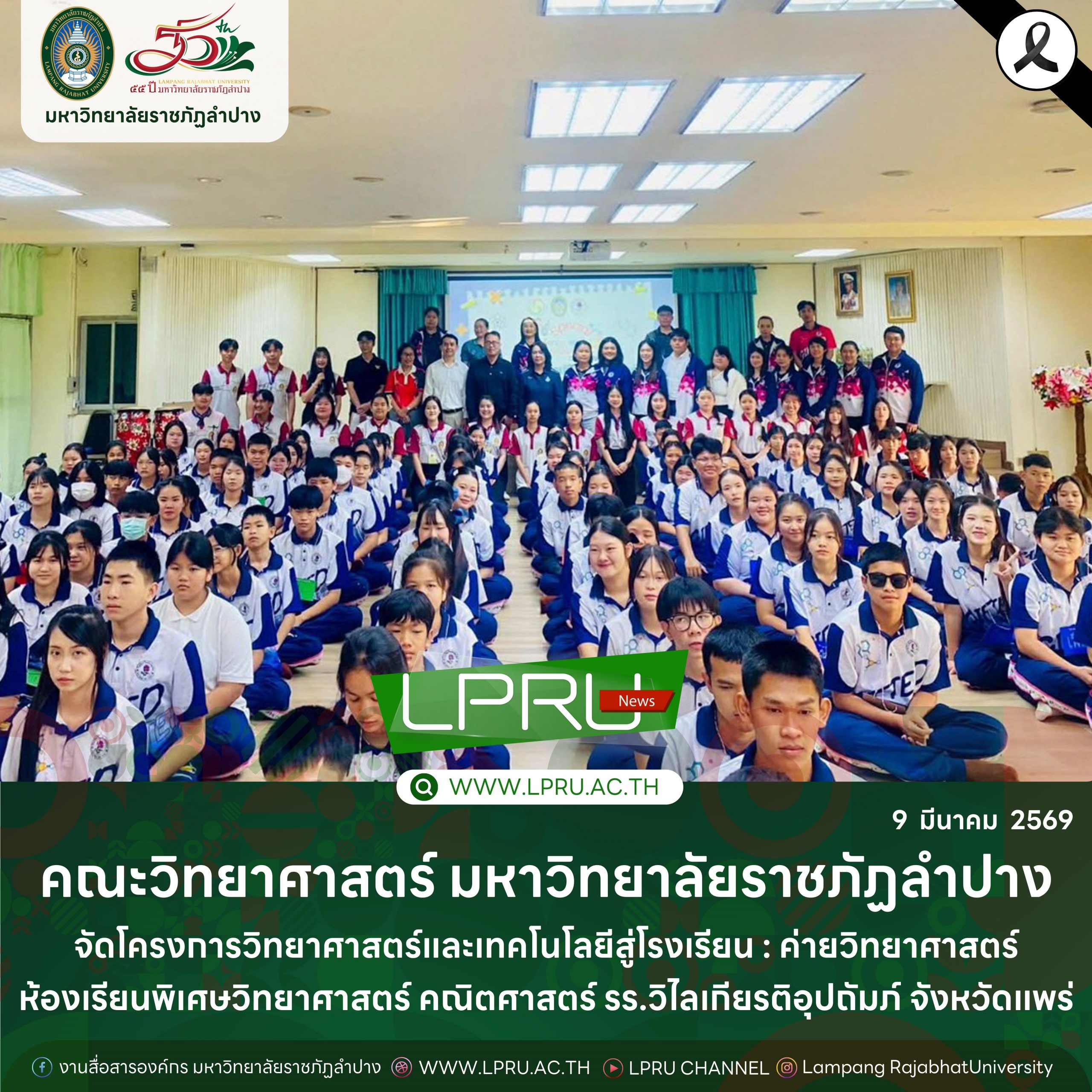 เมื่อวันที่ 7 มีนาคม 2569 ผศ.พิภพ นราแก้ว คณบดีคณะวิทยาศาสตร์ พร้อมด้วย ผศ.ดร.วีระ พันอินทร์ รองคณบดีฝ่ายวิชาการ คณาจารย์ บุคลากร นักศึกษาคณะวิทยาศาสตร์ จัดโครงการวิทยาศาสตร์และเทคโนโลยีสู่โรงเรียน : ค่ายวิทยาศาสตร์ห้องเรียนพิเศษวิทยาศาสตร์ คณิตศาสตร์ ระดับชั้นมัธยมศึกษาตอนต้นและตอนปลาย โรงเรียนวิไลเกียรติอุปถัมภ์ จังหวัดแพร่ ณ คณะวิทยาศาสตร์ มหาวิทยาลัยราชภัฏลำปาง โดยมีนักเรียนเข้าร่วมกิจกรรมกว่า 150 คน