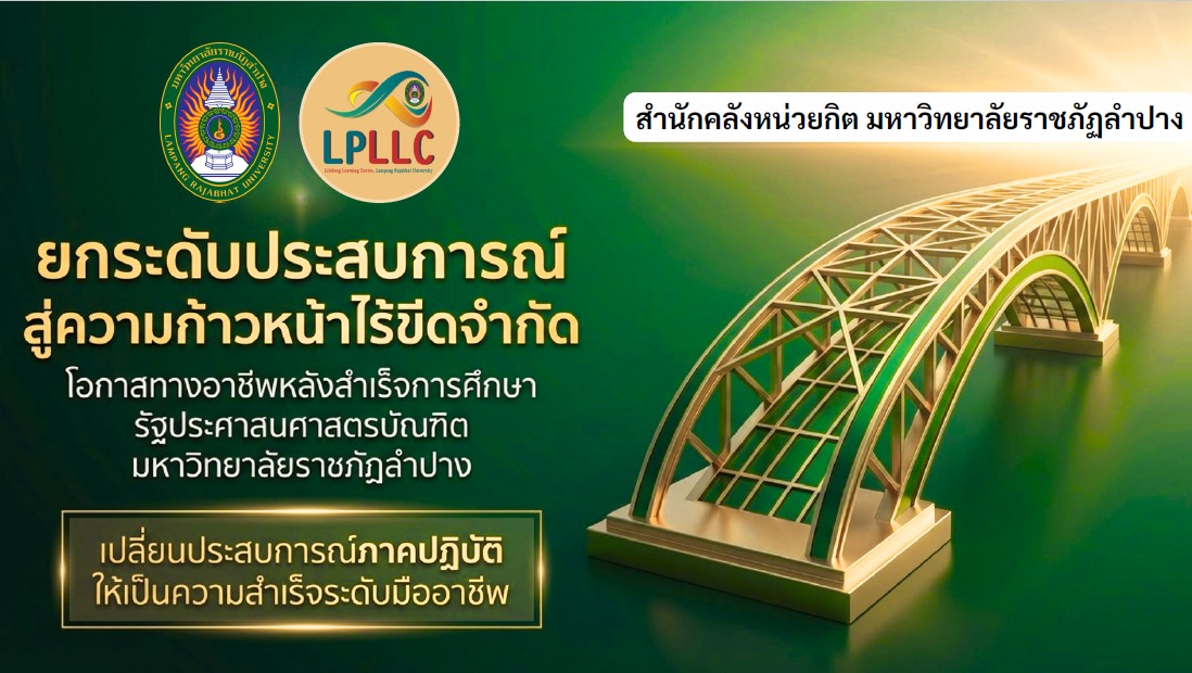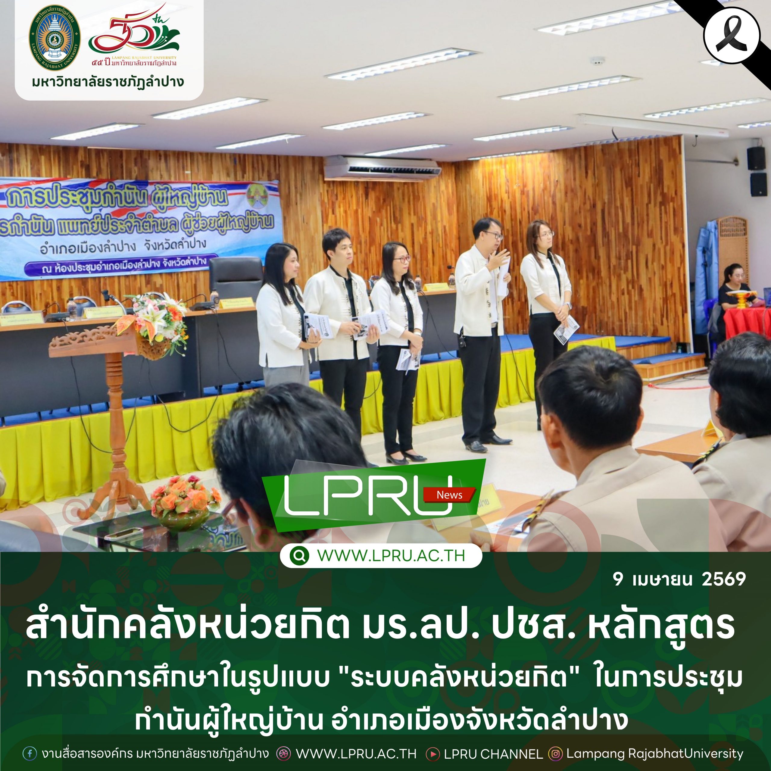 เมื่อวันที่ 9 เมษายน 2569 ผศ.อัญธิชา รุ่งแสง ผู้อำนวยการสำนักคลังหน่วยกิต พร้อมด้วย รศ.ดร.พงศ์วัชร ฟองกันทา ผศ.ดร.ปิญชาน์ ต่อกิตติกุล ผศ.ดร.อัจฉรา เมฆสุวรรณ รองผู้อำนวยการสำนักคลังหน่วยกิต และ อ.ดร.เทวฤทธิ์ วิญญา อาจารย์สังกัดสาขาวิชารัฐประศาสนศาตร์ คณะมนุษยศาสตร์และสังคมศาสตร์ มหาวิทยาลัยราชภัฏลำปาง ดำเนินการประชาสัมพันธ์หลักสูตรเทียบโอนประสบการณ์ของมหาวิทยาลัยราชภัฏลำปาง รูปแบบ “ระบบคลังหน่วยกิต” ในการประชุมกำนัน ผู้ใหญ่บ้าน แพทย์ประจำตำบล และสารวัตรกำนัน ประจำเดือนเมษายน พ.ศ. 2569 ณ หอประชุมที่ว่าการอำเภอเมืองลำปาง จังหวัดลำปาง