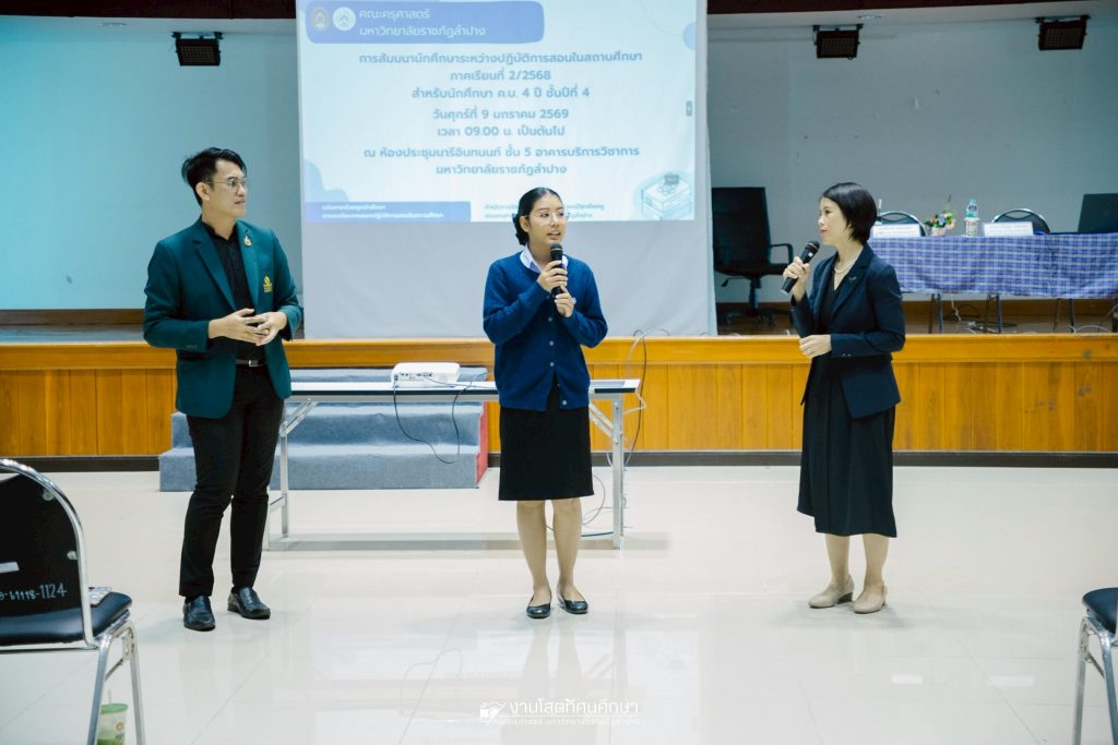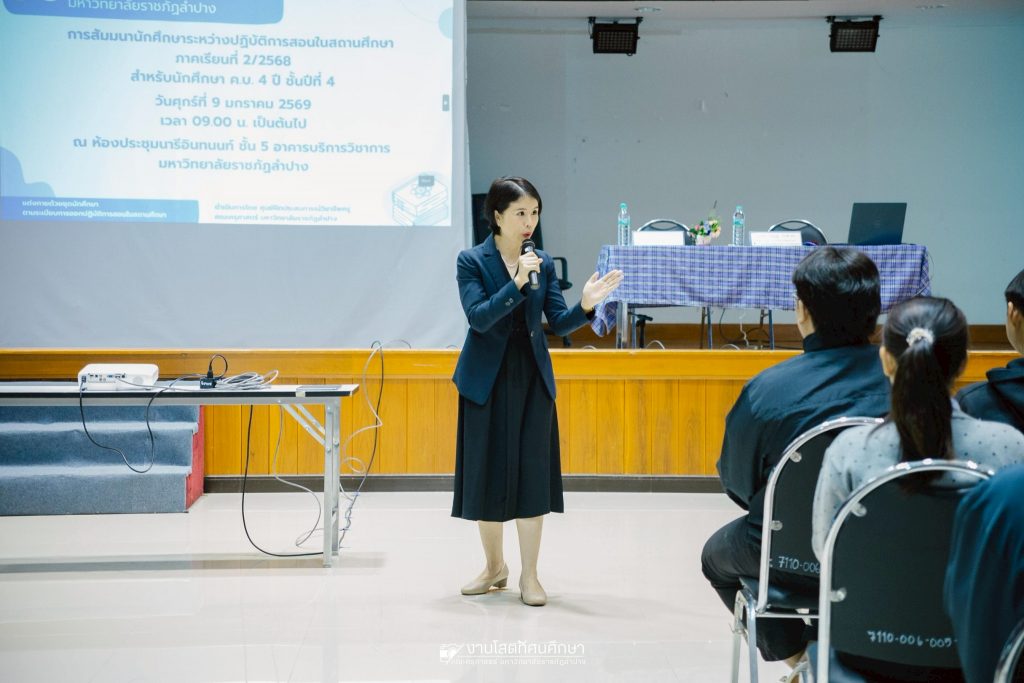 รศ.ดร.ฟิสิกส์ ฌอณ บัวกนก คณบดีคณะครุศาสตร์ มหาวิทยาลัยราชภัฏลำปาง เป็นประธานพิธีเปิดกิจกรรมการสัมมนานักศึกษาระหว่างปฎิบัติการสอนในสถานศึกษาประจำภาคเรียนที่ 2/2568 สำหรับนักศึกษาชั้นปีที่ 4 หลักสูตรครุศาสตรบัณฑิต 4 ปี เมื่อวันที่ 9 มกราคม 2569 ณ ห้องประชุมนารีอินทนนท์ ชั้น 5 อาคารบริการวิชาการ มหาวิทยาลัยราชภัฏลำปาง