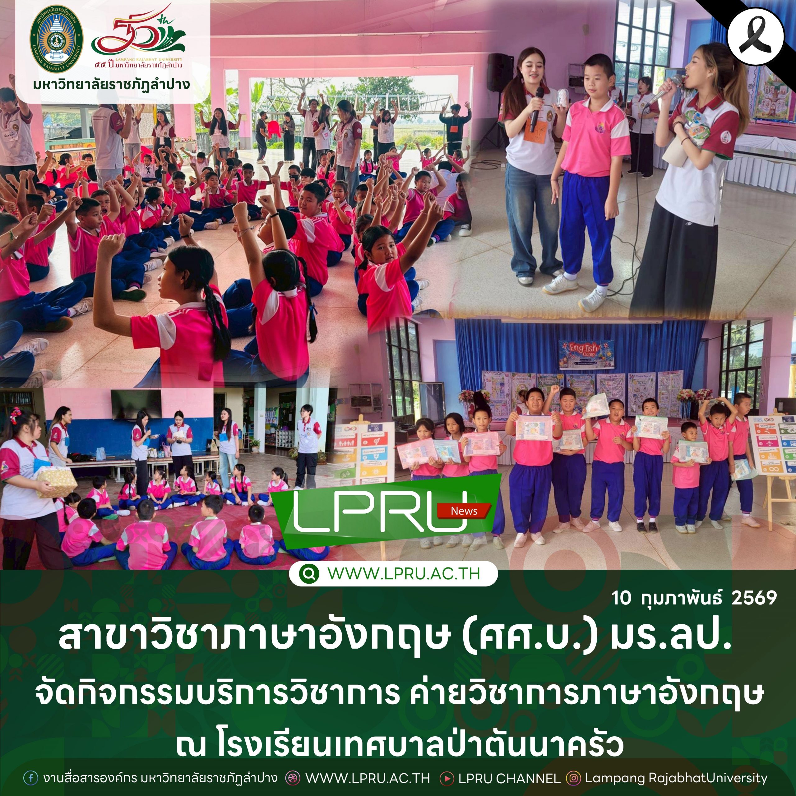 เมื่อวันที่ 9 กุมภาพันธ์ 2569 ผศ.ดร.จิตรลดา มูลมา รองคณบดีฝ่ายวิชาการและประกันคุณภาพการศึกษา คณะมนุษยศาสตร์และสังคมศาสตร์ และผศ.ดร.ฤทัย พานิช ประธานสาขาวิชาภาษาอังกฤษ หลักสูตรศิลปศาสตรบัณฑิต (ศศ.บ.) นำคณาจารย์และนักศึกษา สาขาวิชาภาษาอังกฤษ (ศศ.บ.) คณะมนุษยศาสตร์และสังคมศาสตร์ มหาวิทยาลัยราชภัฏลำปาง จัดกิจกรรมบริการวิชาการ ค่ายวิชาการภาษาอังกฤษ ให้แก่นักเรียนโรงเรียนเทศบาลป่าตันนาครัว อำเภอแม่ทะ จังหวัดลำปาง โดยได้รับเกียรติจากนางอุษณีย์ เลื่อนลอย ผู้อำนวยการโรงเรียนเทศบาลป่าตันนาครัว เป็นประธานพิธีเปิด