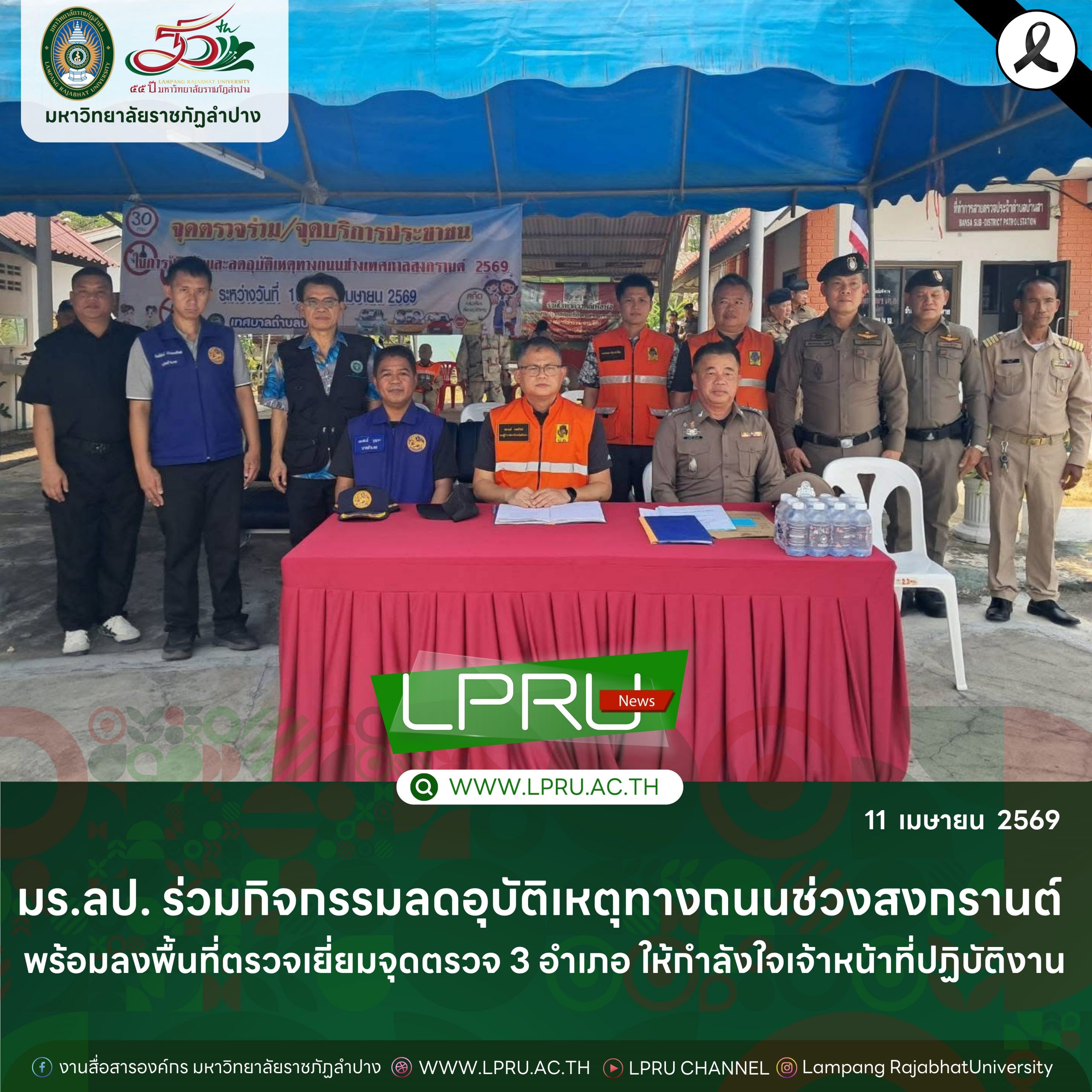 เมื่อวันที่ 11 เมษายน 2569 นายสุรศักดิ์ ประกัน นักวิชาการศึกษา สังกัดกองพัฒนานักศึกษา สำนักงานอธิการบดี มหาวิทยาลัยราชภัฏลำปาง ร่วมกิจกรรมลดอุบัติเหตุทางถนนช่วงสงกรานต์ พร้อมลงพื้นที่ตรวจเยี่ยมจุดตรวจและด่านตรวจร่วม ในการปฏิบัติงานของศูนย์ปฏิบัติการป้องกันอุบัติเหตุทางถนนช่วงเทศกาลสงกรานต์ พ.ศ. 2569 โดยมี นายรณรงค์ เทพรักษ์ รองผู้ว่าราชการจังหวัดลำปาง เป็นประธานลงพื้นที่ตรวจเยี่ยมฯ 4 จุดตรวจ ประกอบด้วย จุดที่ 1 จุดตรวจป้อมตำรวจบ้านสา ตำบลบ้านสา อำเภอแจ้ห่ม จุดที่ 2 จุดตรวจร่องเคาะ บริเวณหน้า อบต.ร่องเคาะ ตำบลร่องเคาะ อำเภอวังเหนือ จุดที่ 3 จุดตรวจสามแยกสบปาน ตำบลสบปาน อำเภอเมืองปาน และ จุดที่ 4 จุดบริการประชาชน หน้า อบต.ทุ่งกว๋าว ตำบลทุ่งกว๋าว อำเภอเมืองปาน จังหวัดลำปาง