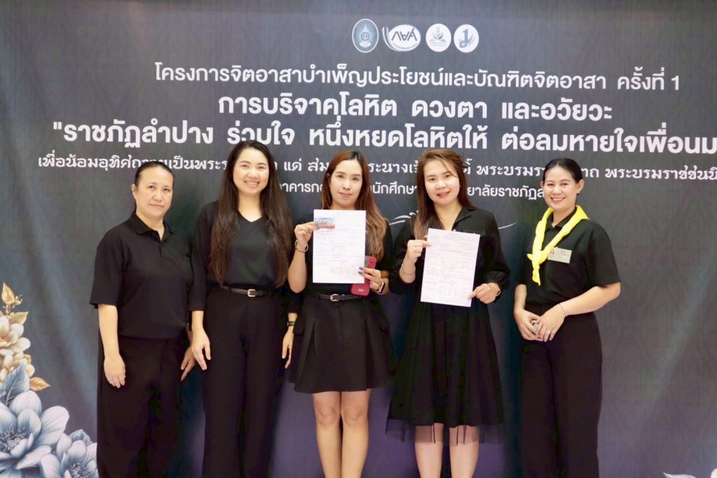 กพน. มร.ลป. จัดโครงการจิตอาสาบำเพ็ญประโยชน์และบัณฑิตจิตอาสา ครั้งที่ 1  “ราชภัฏลำปางร่วมใจ หนึ่งหยดโลหิตให้ ต่อลมหายใจเพื่อนมนุษย์” ร่วมบริจาคโลหิต ดวงตา และอวัยวะ เพื่อน้อมอุทิศถวายเป็นพระราชกุศลแด่พระพันปีหลว