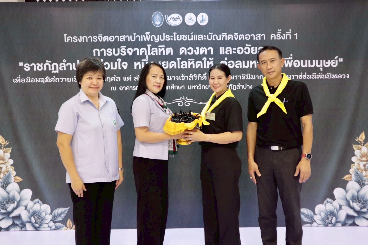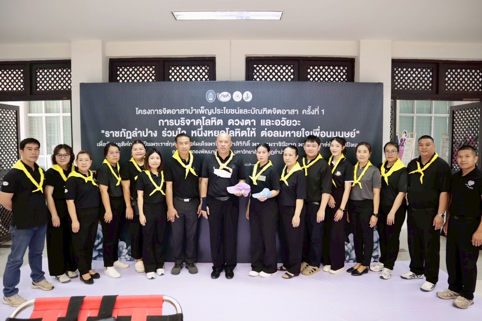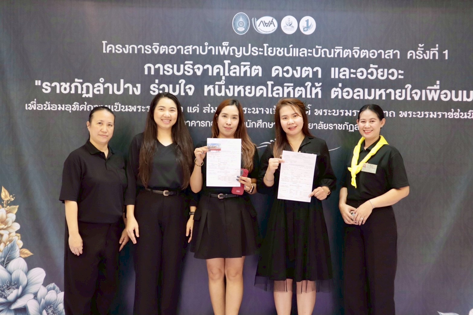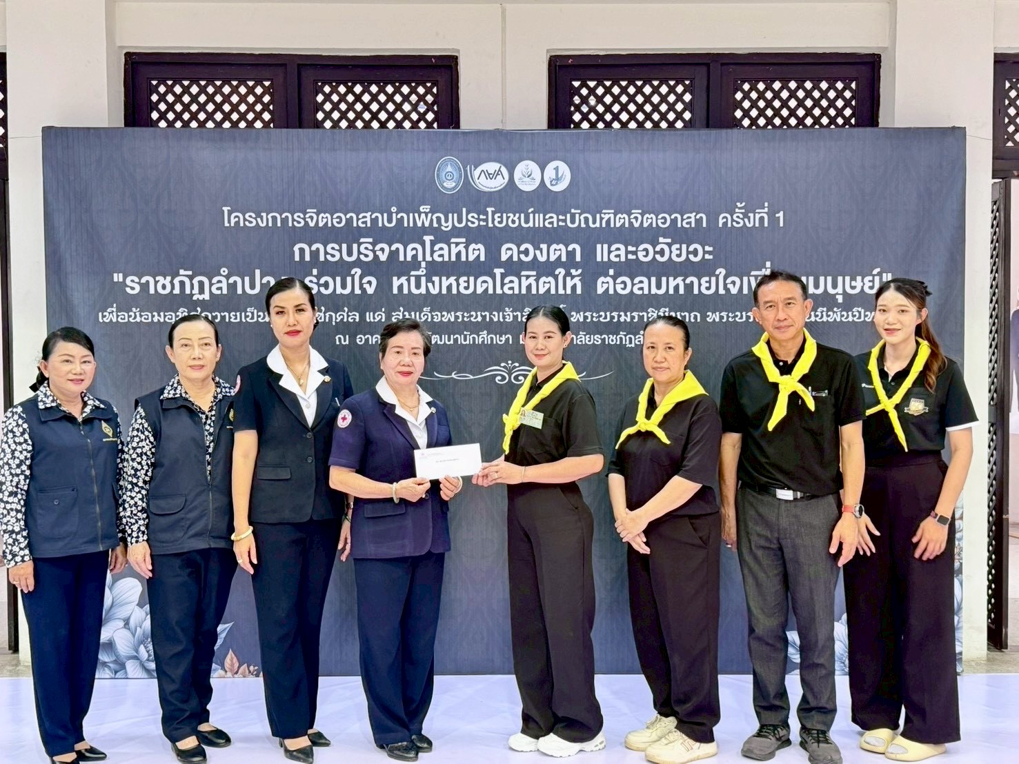 เมื่อวันที่ 12 พฤศจิกายน 2568 กองพัฒนานักศึกษา มหาวิทยาลัยราชภัฏลำปาง จัดโครงการจิตอาสาบำเพ็ญประโยชน์และบัณฑิตจิตอาสา ครั้งที่ 1 นำโดย รศ.ปริตต์ สายสี รองอธิการบดีฝ่ายกิจการนักศึกษา พร้อมด้วย คณาจารย์ บุคลากร นักศึกษา สมาชิกจิตอาสาสังกัดมหาวิทยาลัยราชภัฏลำปาง และประชาชน ร่วมบริจาคโลหิต ดวงตา และอวัยวะ เพื่อน้อมอุทิศถวายเป็นพระราชกุศลแด่ สมเด็จพระนางเจ้าสิริกิติ์ พระบรมราชินีนาถ พระบรมราชชนนีพันปีหลวง ณ อาคารกองพัฒนานักศึกษา มหาวิทยาลัยราชภัฏลำปาง โดยมียอดการบริจาคโลหิต จำนวน 16,000 ซีซี บริจาคดวงตา จำนวน 2 ราย และบริจาคอวัยวะ จำนวน 2 ราย