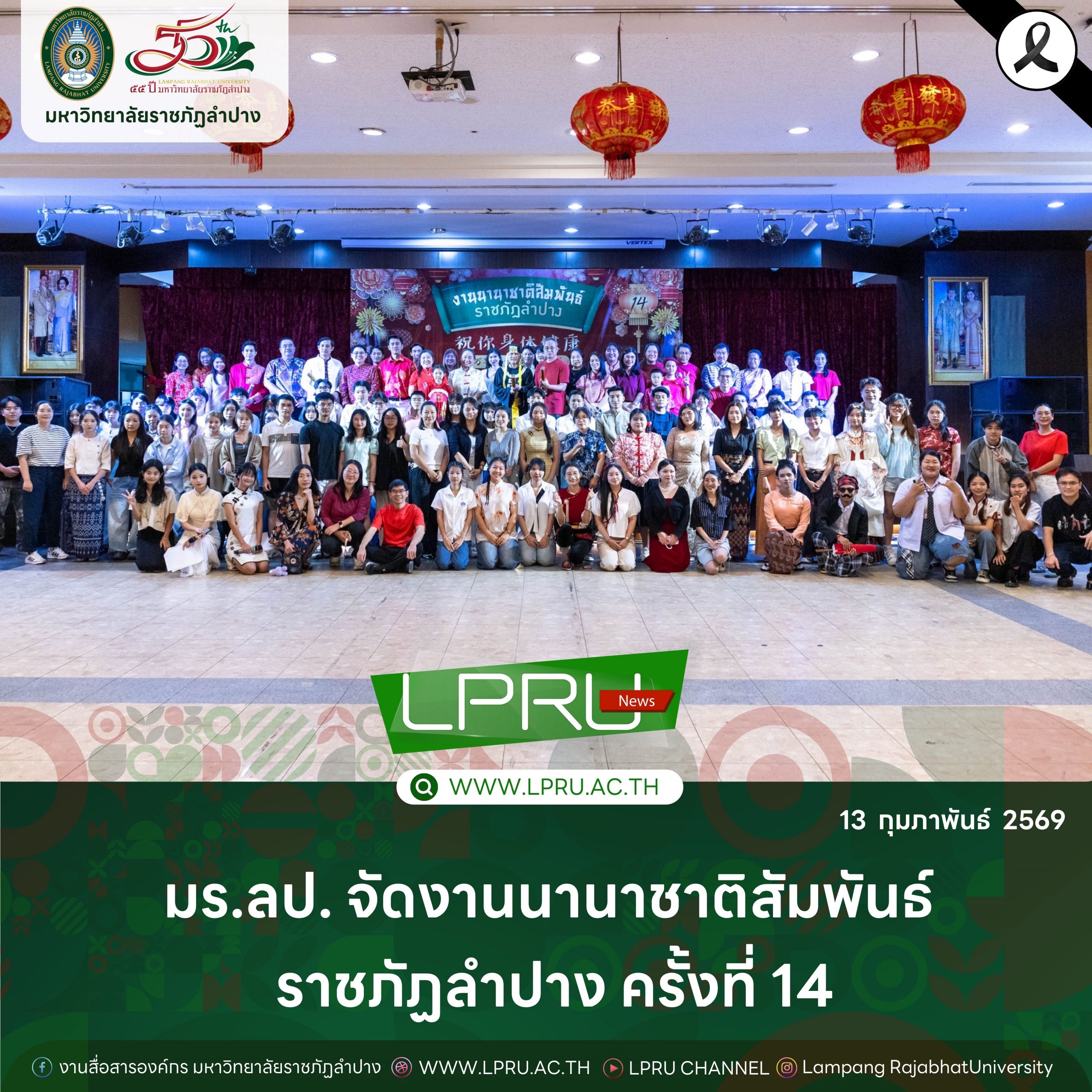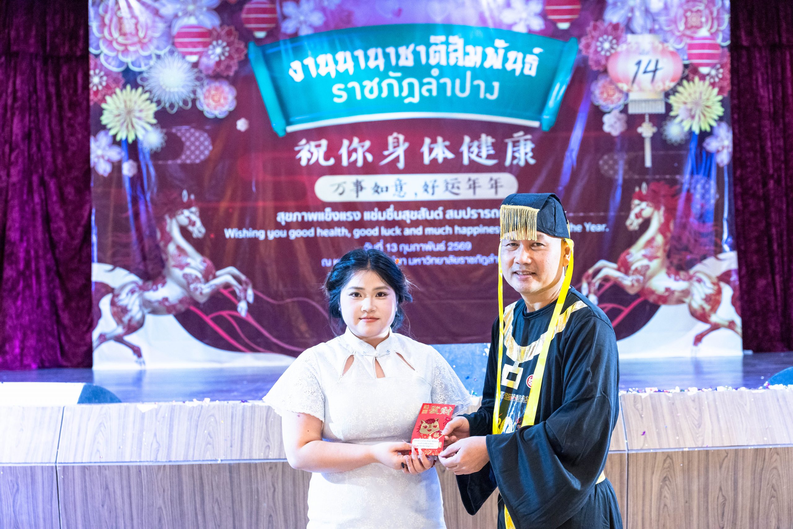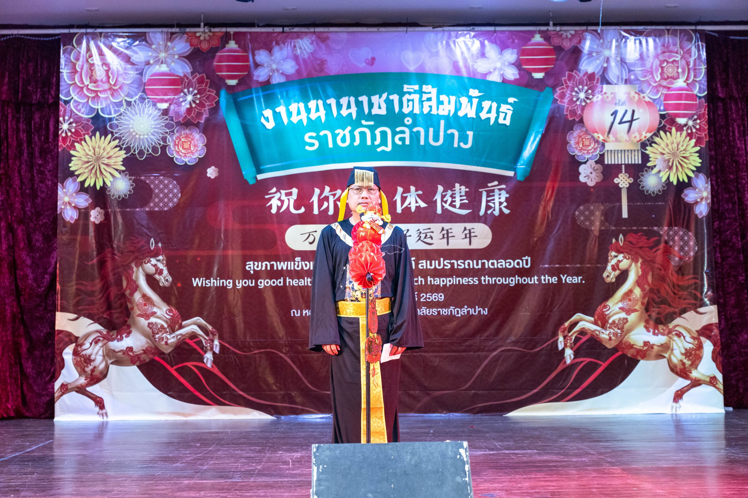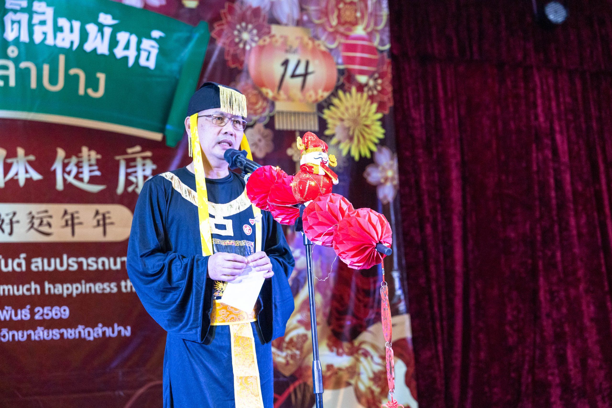 รศ.ดร.ปริเยศ สิทธิสรวง รองอธิการบดีฝ่ายบริหาร มหาวิทยาลัยราชภัฏลำปาง เป็นประธานเปิดงานนานาชาติสัมพันธ์ ราชภัฏลำปาง ครั้งที่ 14 พร้อมกล่าวอวยพรในโอกาสเทศกาลตรุษจีน แก่นักศึกษา และผู้เข้าร่วมงาน ณ ห้องประชุมจันทน์ผา มหาวิทยาลัยราชภัฏลำปาง เมื่อวันที่ 13 กุมภาพันธ์ 2569 โดยมี อ.อัจฉริยา ครุธาโรจน์ ผู้ช่วยอธิการบดีด้านวิเทศสัมพันธ์ กล่าวรายงาน