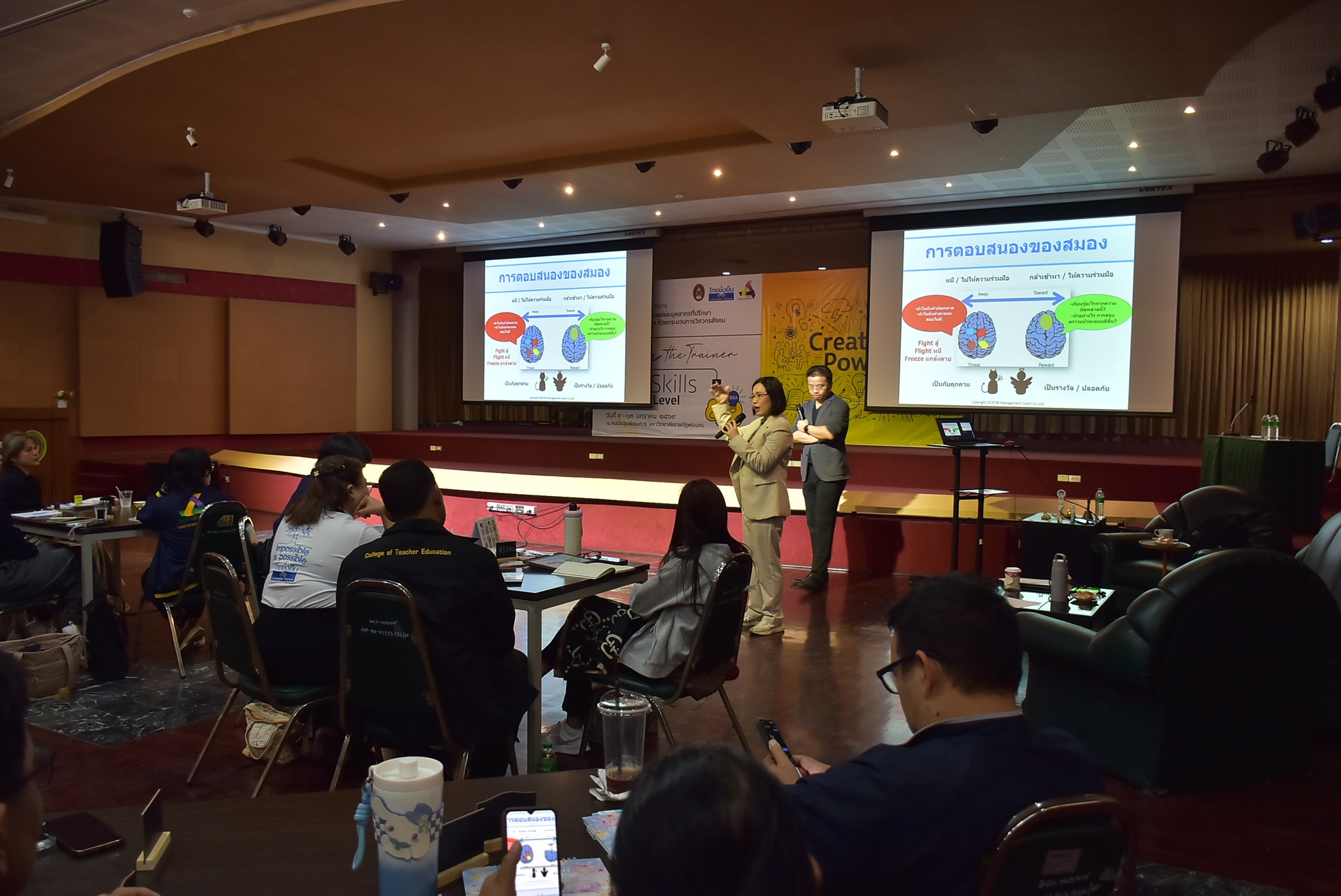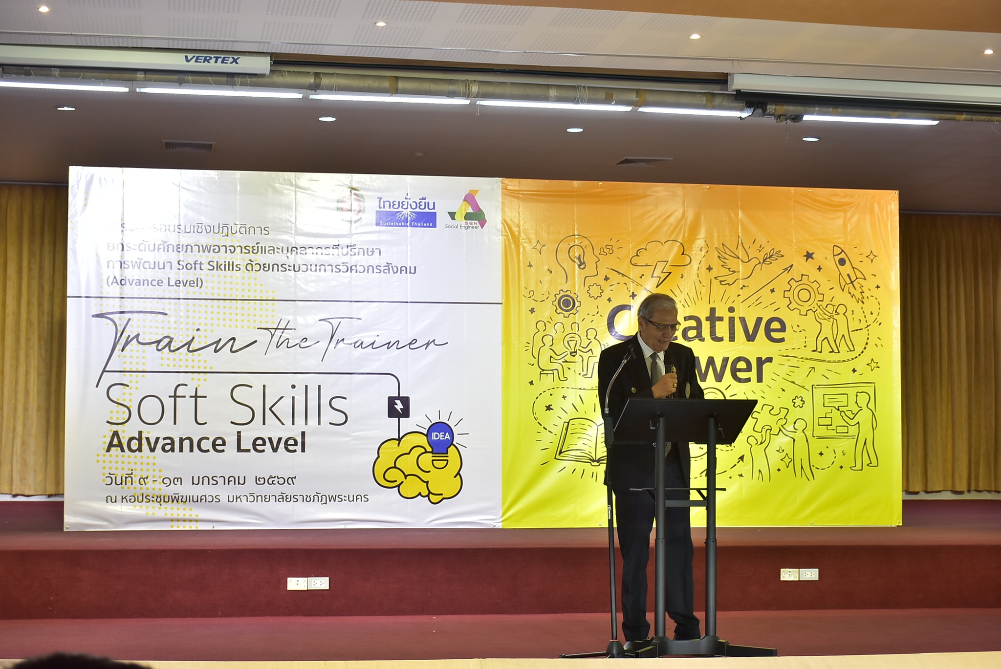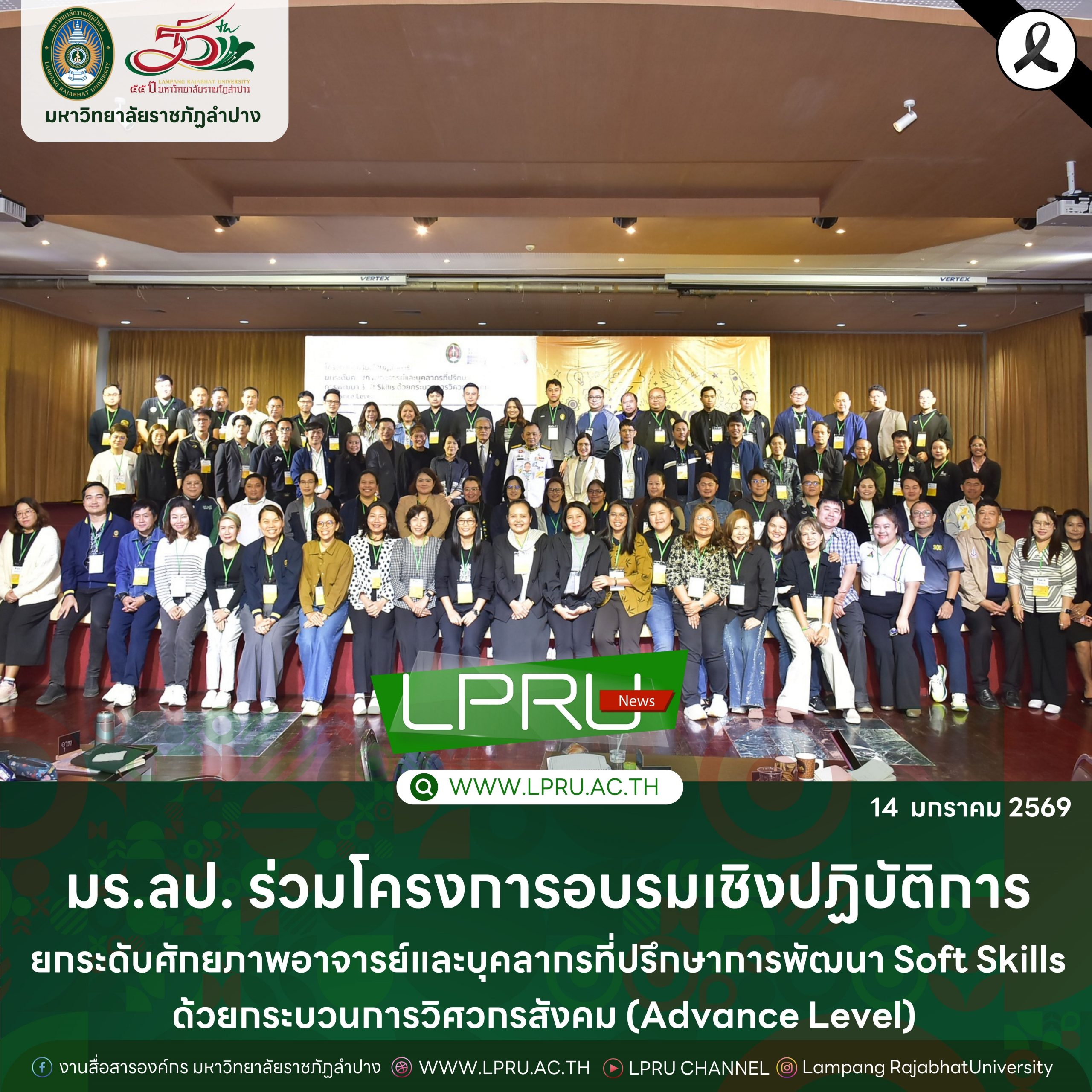 รศ.ปริตต์ สายสี รองอธิการบดีฝ่ายกิจการนักศึกษา พร้อมด้วย อ.อุษา โบสถ์ทอง อาจารย์สังกัดสาขาวิชาการจัดการ คณะวิทยาการจัดการ และนายบัณฑิต โบสถ์ทอง นักวิชาการศึกษา ปฏิบัติการ สังกัดกองพัฒนานักศึกษา มหาวิทยาลัยราชภัฏลำปาง ร่วมโครงการอบรมเชิงปฏิบัติการยกระดับศักยภาพอาจารย์และบุคลากรที่ปรึกษาการพัฒนา Soft Skills ด้วยกระบวนการวิศวกรสังคม (Advance Level) เมื่อวันที่ 9 – 13 มกราคม 2569 ณ หอประชุมพิฆเนศวร มหาวิทยาลัยราชภัฏพระนคร โดยได้รับเกียรติจาก พลเอก ดาว์พงษ์ รัตนสุวรรณ องคมนตรี เป็นประธานพิธีเปิด ในการนี้ รศ.ดร.เปรื่อง กิจรัตน์ภร รักษาราชการแทนอธิการบดีมหาวิทยาลัยราชภัฏพระนคร กล่าวต้อนรับและกล่าวรายงานวัตถุประสงค์โครงการ