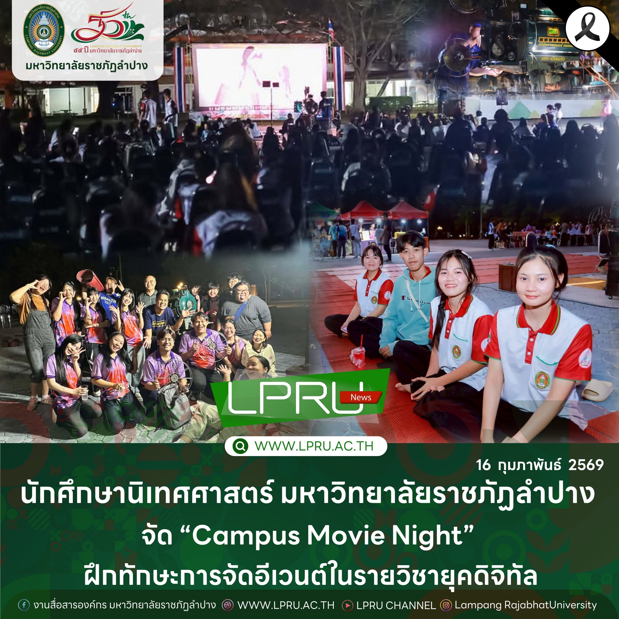 นักศึกษาสาขาวิชานิเทศศาสตร์ ชั้นปีที่ 3 คณะวิทยาการจัดการ มหาวิทยาลัยราชภัฏลำปาง จัดกิจกรรมดูหนังกลางแปลง “Campus Movie Night” ภายใต้รายวิชาการจัดอีเว้นท์ นิทรรศการ และสื่อกิจกรรมในยุคดิจิทัล เพื่อให้ผู้เรียนได้ฝึกกระบวนการทำงานจริง ตั้งแต่การวางแผนงาน การออกแบบรูปแบบกิจกรรม การจัดเตรียมสถานที่ การประชาสัมพันธ์ผ่านสื่อดิจิทัล ตลอดจนการดำเนินงานและประเมินผลหลังการจัดกิจกรรม โดยมุ่งเน้นการพัฒนาทักษะด้านการสื่อสารและการจัดอีเว้นท์ (Event) ให้สอดคล้องกับบริบทสื่อในยุคปัจจุบัน อีกทั้งยังเป็นการสร้างพื้นที่กิจกรรมสร้างสรรค์ภายในมหาวิทยาลัยสำหรับนักศึกษาและบุคลากร เมื่อวันที่ 11 กุมภาพันธ์ 2569 ณ ลานอเนกประสงค์ราชพฤกษ์ มหาวิทยาลัยราชภัฏลำปาง