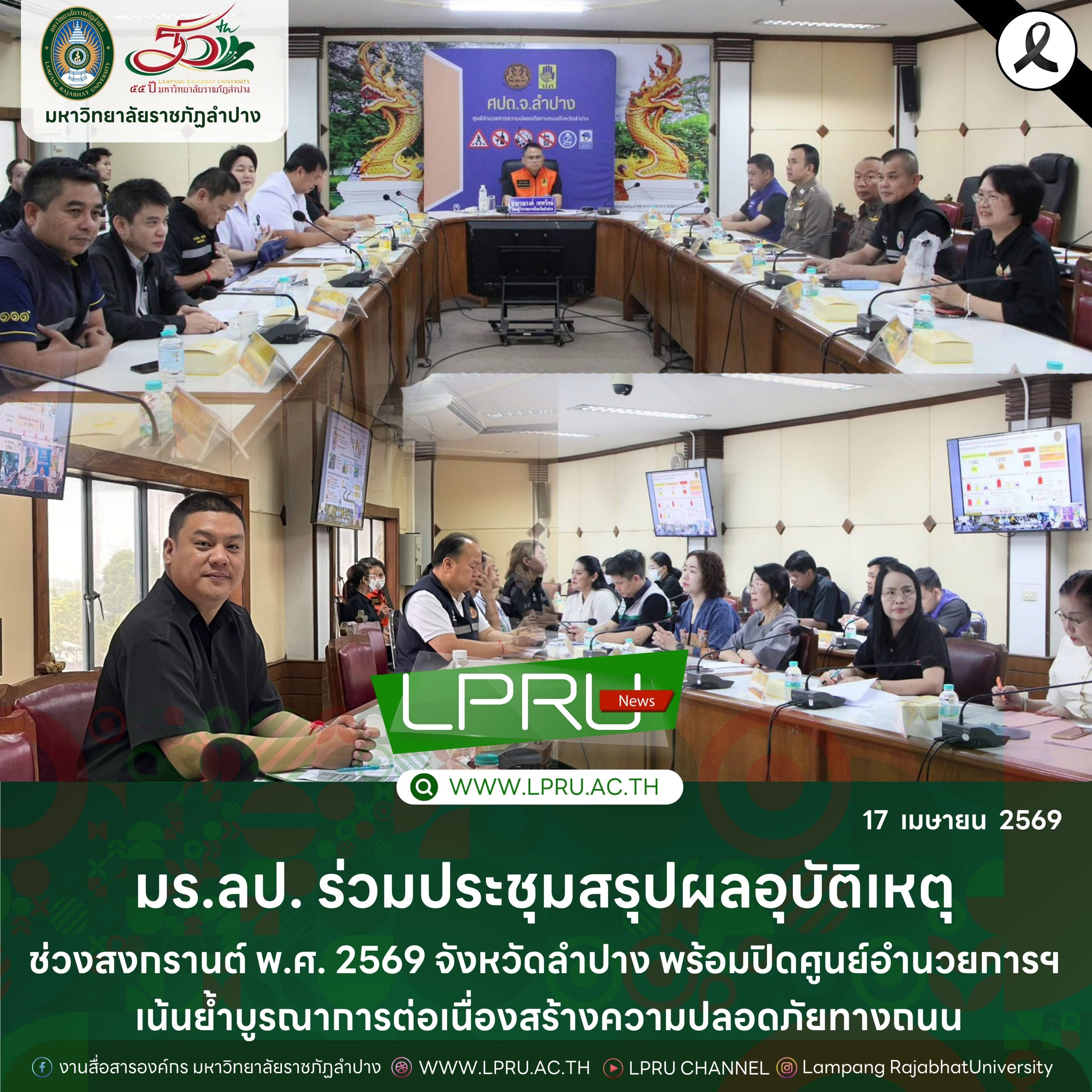 เมื่อวันที่ 17 เมษายน 2569 นายสุรศักดิ์ ประกัน นักวิชาการศึกษา สังกัดกองพัฒนานักศึกษา สำนักงานอธิการบดี มหาวิทยาลัยราชภัฎลำปาง ร่วมพิธีปิดศูนย์ปฏิบัติการป้องกันและลดอุบัติเหตุทางถนนช่วงเทศกาลสงกรานต์ พ.ศ. 2569 ณ ห้องประชุมเวียงละกอน ชั้น 4 ศาลากลางจังหวัดลำปาง โดยมี นายรณรงค์ เทพรักษ์ รองผู้ว่าราชการจังหวัดลำปาง เป็นประธานการประชุมคณะกรรมการศูนย์อำนวยการความปลอดภัยทางถนนจังหวัดลำปาง (ศปถ.) ครั้งที่ 3/2569 พร้อมเป็นประธานในพิธีปิดศูนย์ปฏิบัติการป้องกันและลดอุบัติเหตุทางถนนช่วงเทศกาลสงกรานต์ พ.ศ. 2569 ซึ่งมีหน่วยงานที่เกี่ยวข้องเข้าร่วมเพื่อติดตามผลการดำเนินงานช่วงเทศกาลสงกรานต์ สรุปสถิติอุบัติเหตุ ปัญหาอุปสรรค และถอดบทเรียน เพื่อนำไปปรับปรุงแนวทางการป้องกันและลดอุบัติเหตุในอนาคต พร้อมกันนี้ได้ร่วมรับฟังการประชุมคณะอนุกรรมการเฉพาะกิจฯ ผ่านระบบ VCS โดยมีนายธีรพัฒน์ คัชมาตย์ อธิบดีกรมป้องกันและบรรเทาสาธารณภัย เป็นประธานติดตามสถานการณ์และปิดศูนย์อำนวยการฯ อย่างเป็นทางการ