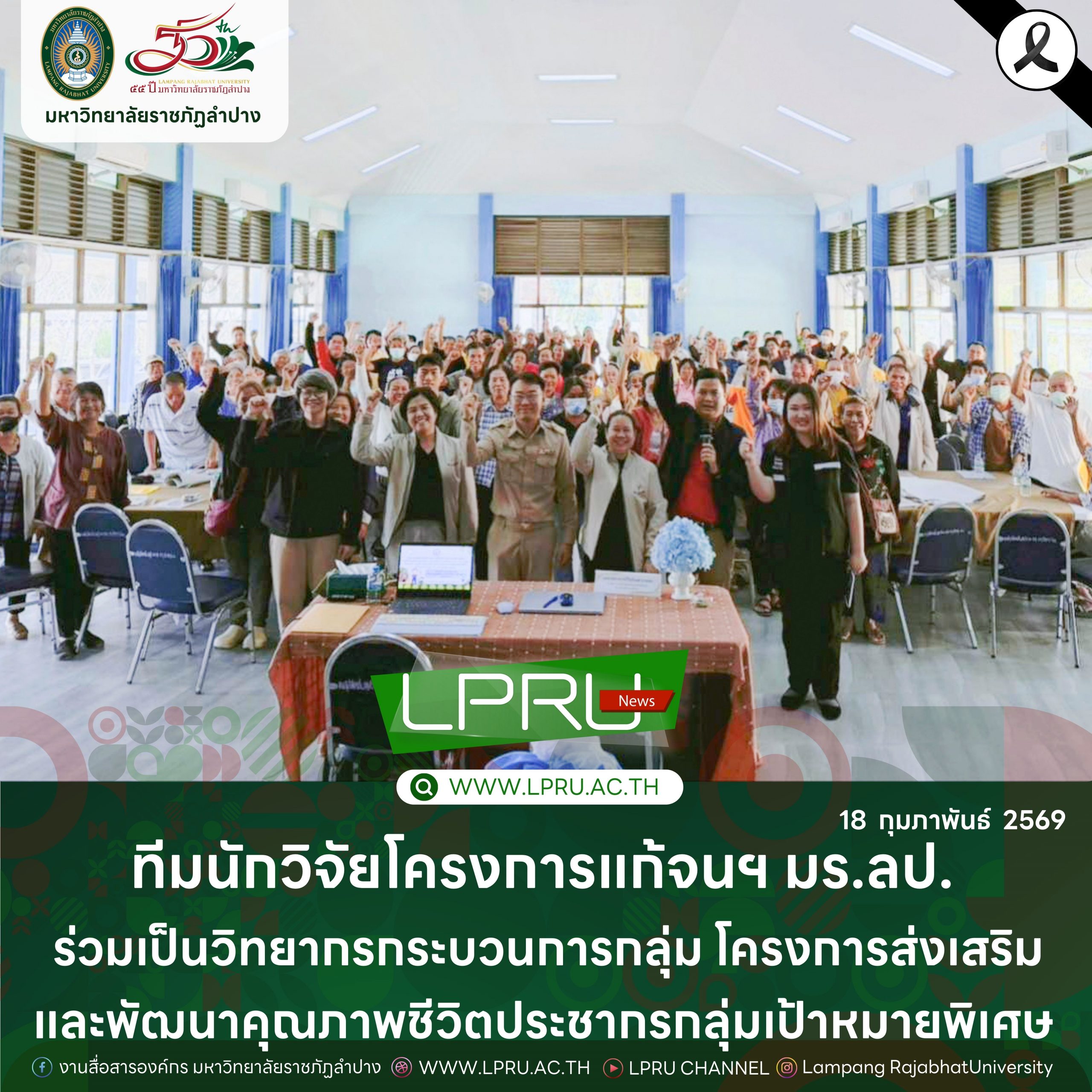 เมื่อวันที่ 16 กุมภาพันธ์ 2569 รศ.วิไลลักษณ์ พรมเสน รองอธิการบดีฝ่ายวิจัยและวิชาการต่างประเทศ พร้อมด้วย ผศ.ดร.ปิยรัตน์ วงศ์จุมมะลิ ผศ.ดร.อนันต์ อุปสอด อาจารย์สังกัดสาขาวิชายุทธศาสตร์การพัฒนาท้องถิ่นที่ยั่งยืน คณะมนุษยศาสตร์และสังคมศาสตร์ และ น.ส.วิไลรัตน์ วันกมลสวัสดิ์ นักวิจัย สังกัดสถาบันวิจัยและพัฒนา มหาวิทยาลัยราชภัฏลำปาง ร่วมเป็นวิทยากรกระบวนการกลุ่ม โครงการส่งเสริมและพัฒนาคุณภาพชีวิตประชากรกลุ่มเป้าหมายพิเศษ ในพื้นที่นิคมสร้างตนเองกิ่วลม จังหวัดลำปาง ประจำปีงบประมาณ พ.ศ.2569 ณ ศูนย์พัฒนาการจัดสวัสดิการสังคมผู้สูงอายุจังหวัดลำปาง โดยมี นายอนิรุจน์ พงศธรวรนันท์ นักพัฒนาสังคมชำนาญการ เป็นประธานในพิธีเปิด