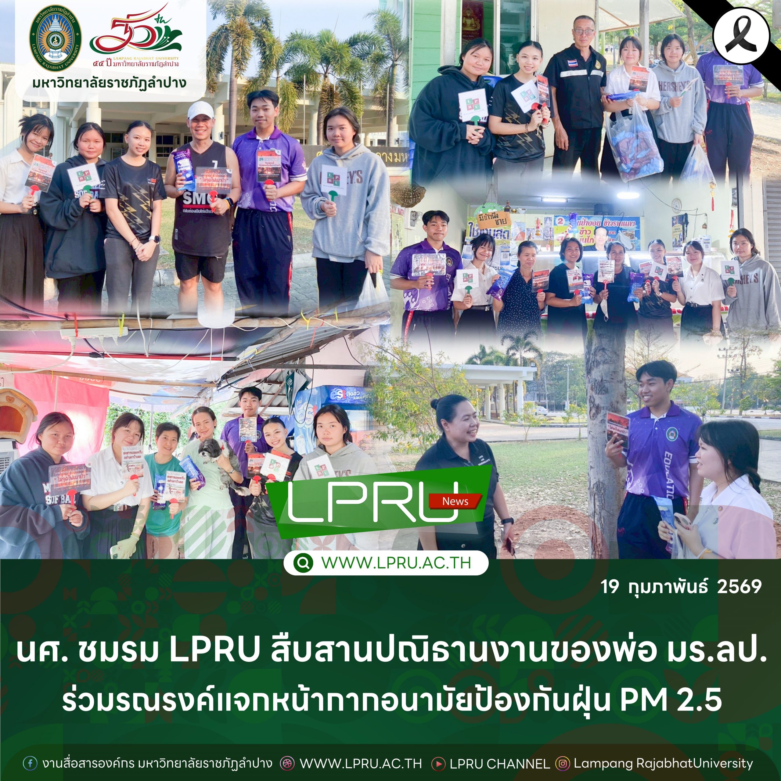 เมื่อวันที่ 18 กุมภาพันธ์ 2569 นักศึกษาชมรม LPRU สืบสานปณิธานงานของพ่อ มหาวิทยาลัยราชภัฏลำปาง ร่วมรณรงค์แจกหน้ากากอนามัยป้องกันฝุ่น PM 2.5 เนื่องในวันรณรงค์ให้ปลอดควันพิษจากไฟป่า ณ ภายในบริเวณมหาวิทยาลัยราชภัฏลำปาง