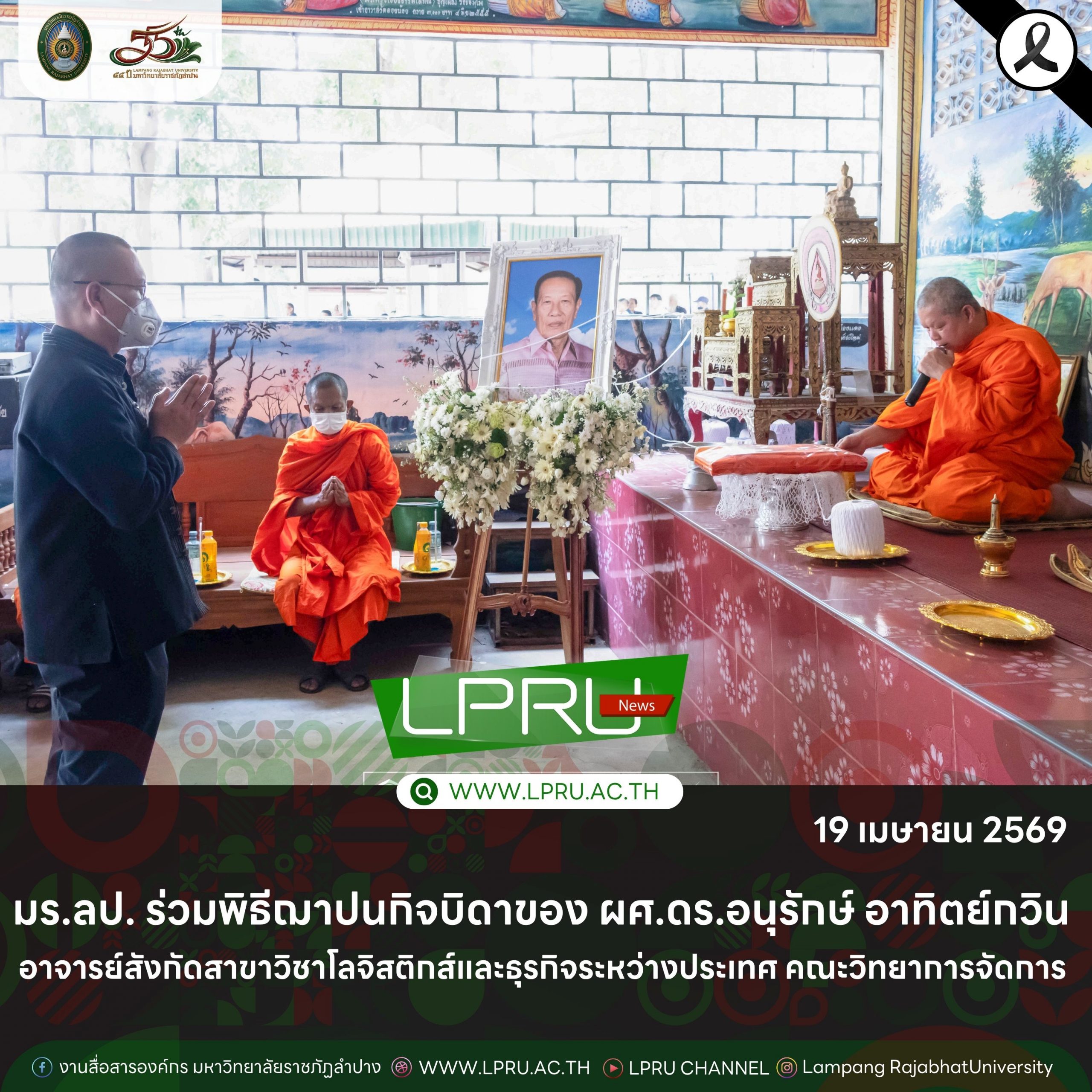 เมื่อวันที่ 19 เมษายน 2569 รศ.ดร.ปริเยศ สิทธิสรวง รองอธิการบดีฝ่ายบริหาร พร้อมด้วย อ.ดร.เสาวรีย์ บุญสา คณบดีคณะมนุษยศาสตร์และสังคมศาสตร์ อ.อุษา โบสถ์ทอง ผู้อำนวยการสำนักงานสหกิจศึกษาและการศึกษาเชิงบูรณาการกับการทำงาน (CWIE) มหาวิทยาลัยราชภัฏลำปาง อ.ดร.พิมาย วงค์ทา อาจารย์สังกัดสาขาวิชาคอมพิวเตอร์ธุรกิจ และบุคลากร มหาวิทยาลัยราชภัฏลำปาง ร่วมพิธีฌาปนกิจคุณพ่อสุเทพ อาทิตย์กวิน อายุ 88 ปี บิดาของ ผศ.ดร.อนุรักษ์ อาทิตย์กวิน อาจารย์สังกัดสาขาวิชาโลจิสติกส์และธุรกิจระหว่างประเทศ คณะวิทยาการจัดการ มหาวิทยาลัยราชภัฏลำปาง ณ ฌาปนสถานบ้านดอนไชย อำเภอเถิน จังหวัดลำปาง