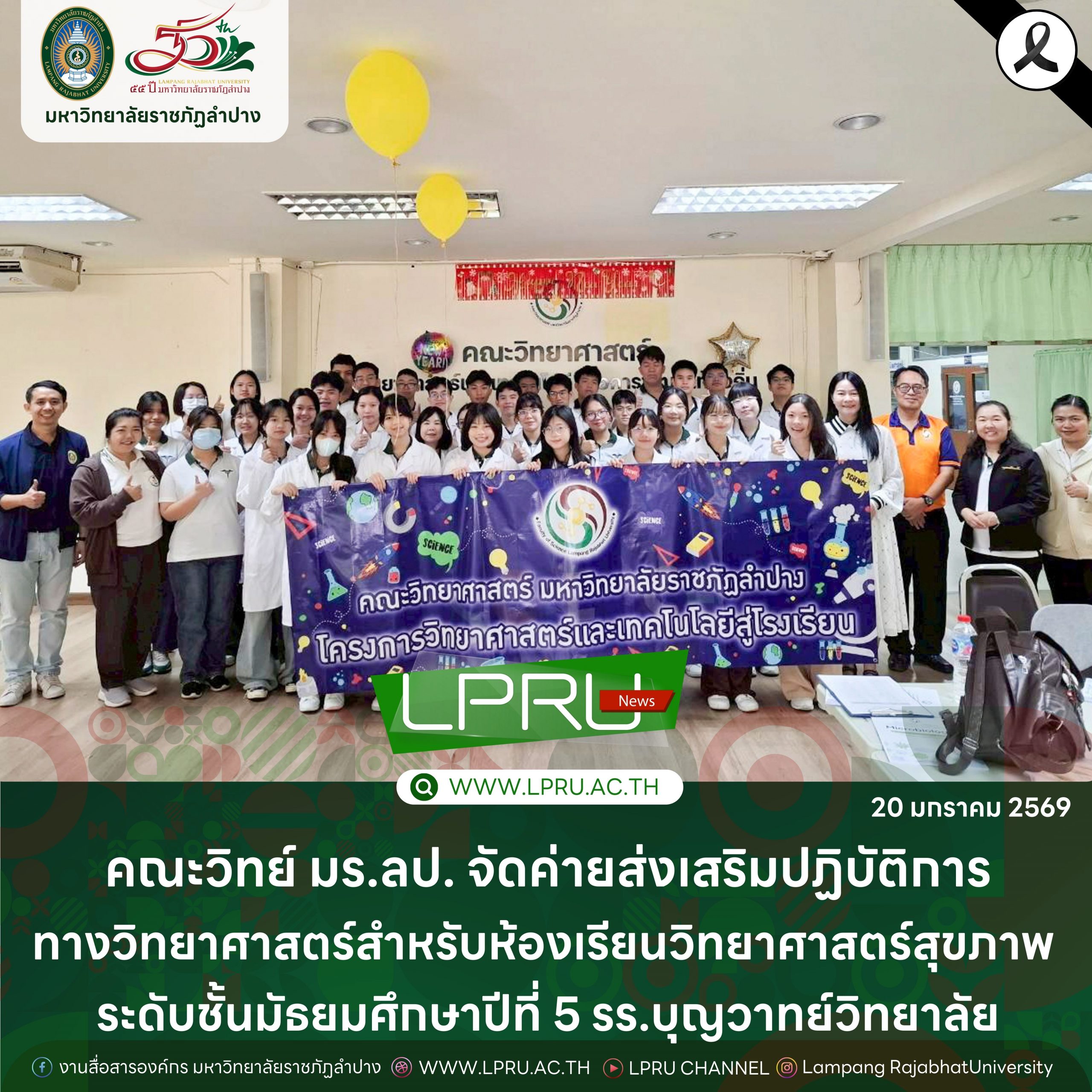 เมื่อวันที่ 17 – 18 มกราคม 2569 ผศ.พิภพ นราแก้ว คณบดีคณะวิทยาศาสตร์ พร้อมด้วย ผศ.ดร.วีระ พันอินทร์ รองคณบดีฝ่ายวิชาการคณะวิทยาศาสตร์ อาจารย์ บุคลากร และนักศึกษา จัดค่ายส่งเสริมปฏิบัติการทางวิทยาศาสตร์สำหรับห้องเรียนวิทยาศาสตร์สุขภาพ ให้กับนักเรียนระดับชั้นมัธยมศึกษาปีที่ 5 โรงเรียนบุญวาทย์วิทยาลัย ณ คณะวิทยาศาสตร์ มหาวิทยาลัยราชภัฏลำปาง