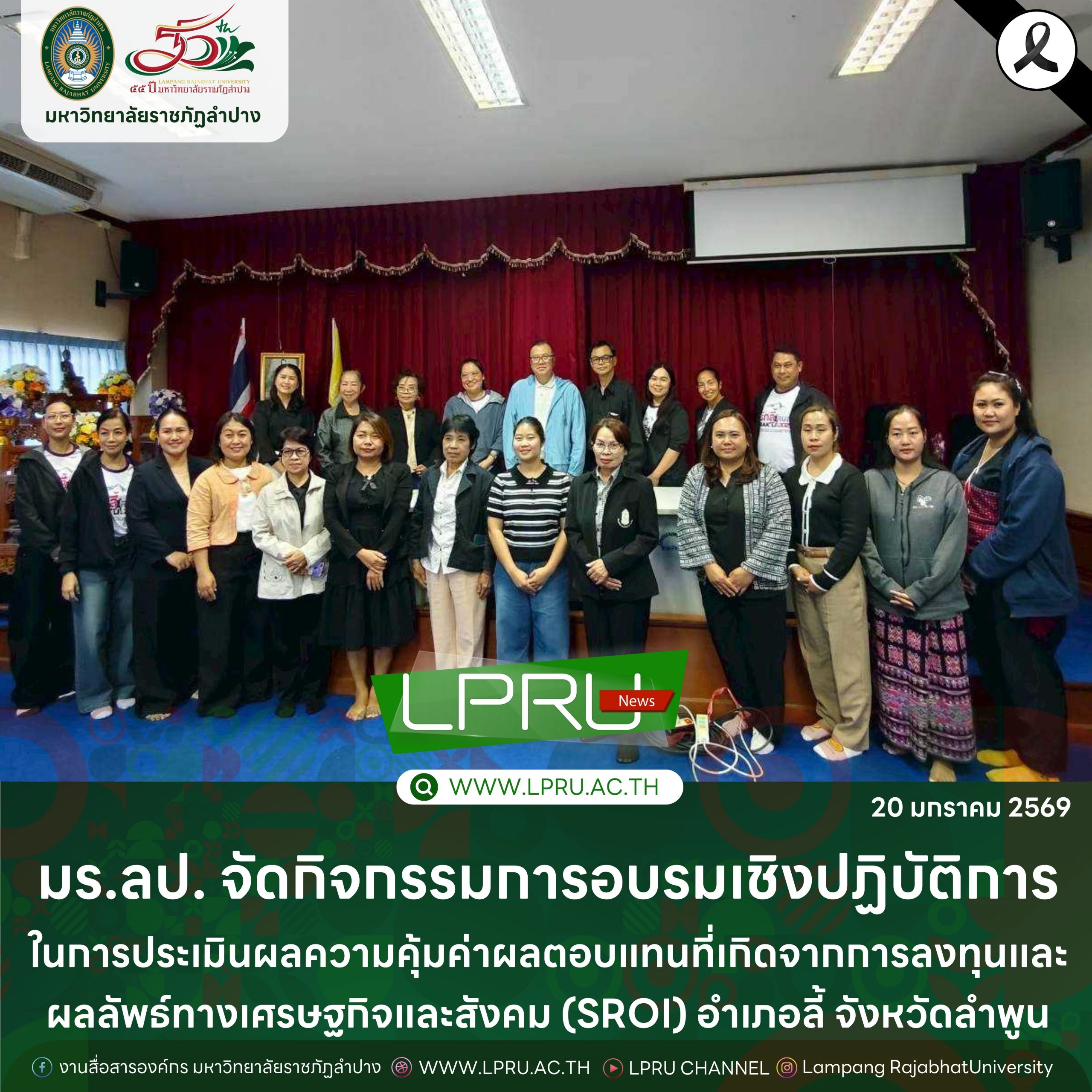 เมื่อวันที่ 19 มกราคม 2569 ผศ.ดร.ณัฐนันท์ ฐิติยาปราโมทย์ ผู้ช่วยคณบดีคณะวิทยาการจัดการ ในฐานะหัวหน้าโครงการพัฒนาความเป็นเลิศของสถาบันอุดมศึกษาและพัฒนากำลังคนขั้นสูง (Reinventing University) ประจำปีงบประมาณ พ.ศ. 2568 พร้อมด้วย ผศ.ดร.สุขเกษม ลางคุลเสน ผู้ช่วยคณบดีคณะวิทยาการจัดการ ผศ.ดร.รัชดาพร หวลอารมณ์ อาจารย์สังกัดสาขาวิชารัฐประศาสนศาสตร์ คณะมนุษยศาสตร์และสังคมศาสตร์ ผศ.ดร.เหนือขวัญ บัวเผื่อน อาจารย์สังกัดคณะครุศาสตร์ มหาวิทยาลัยราชภัฏลำปาง และเจ้าหน้าที่โครงการ จัดกิจกรรมการอบรมเชิงปฏิบัติการในการประเมินผลความคุ้มค่าผลตอบแทนที่เกิดจากการลงทุนและผลลัพธ์ทางเศรษฐกิจและสังคม (SROI) ภายใต้โครงการพัฒนาความเป็นเลิศของสถาบันอุดมศึกษาและพัฒนากำลังคนขั้นสูง (Reinventing University) ประจำปีงบประมาณ พ.ศ. 2568 ตามโครงการพัฒนาศักยภาพและการบริหารจัดการแหล่งท่องเที่ยวตามแนวคิดเศรษฐกิจสร้างสรรค์เพื่อความยั่งยืนในพื้นที่อำเภอลี้ จังหวัดลำพูน ณ เทศบาลตำบลวังดินอำเภอลี้ จังหวัดลำพูน