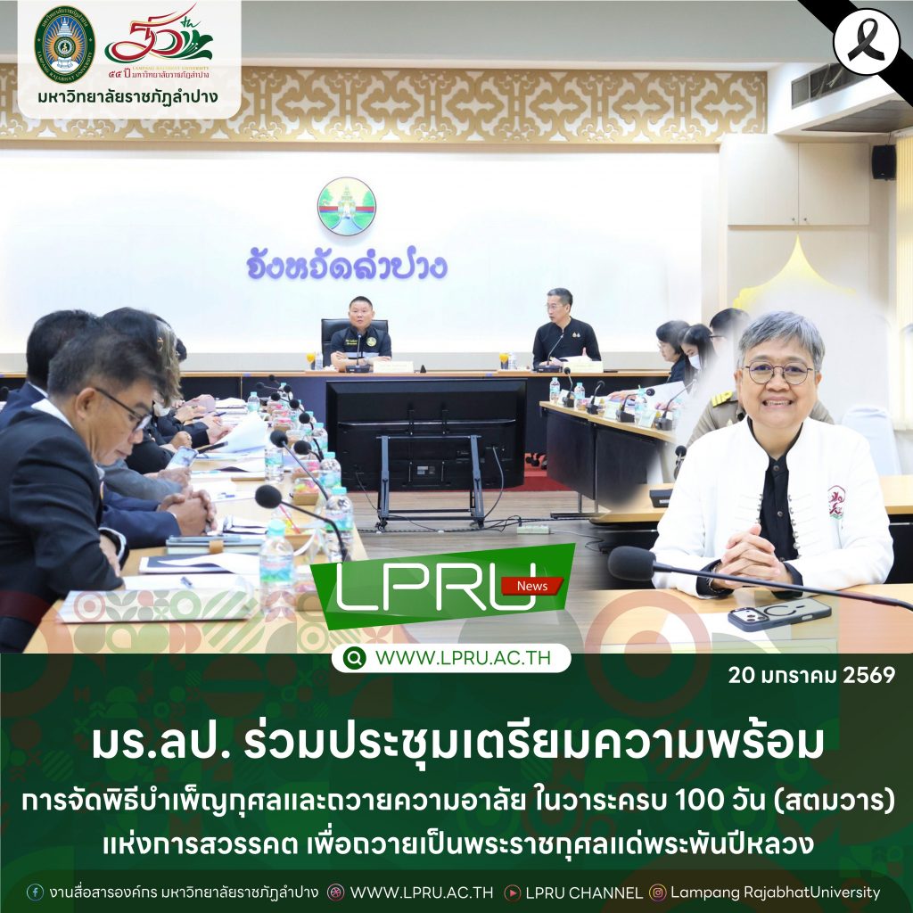 เมื่อวันที่ 20 มกราคม 2569 ผศ.สุวรรณี จันทร์ตา รองอธิการบดีฝ่ายวิชาการ ร่วมประชุมเตรียมความพร้อมการจัดพิธีบำเพ็ญกุศลและถวายความอาลัย ในวาระครบ 100 วัน (สตมวาร) แห่งการสวรรคต เพื่อถวายเป็นพระราชกุศลแด่สมเด็จพระนางเจ้าสิริกิติ์ พระบรมราชินีนาถ พระบรมราชชนนีพันปีหลวง ณ ห้องประชุมอาลัมภางค์ ชั้น 4 ศาลากลางจังหวัดลำปาง โดยมี นายวิวัฒน์ อินทร์ไทยวงศ์ ผู้ว่าราชการจังหวัดลำปาง เป็นประธานการประชุม