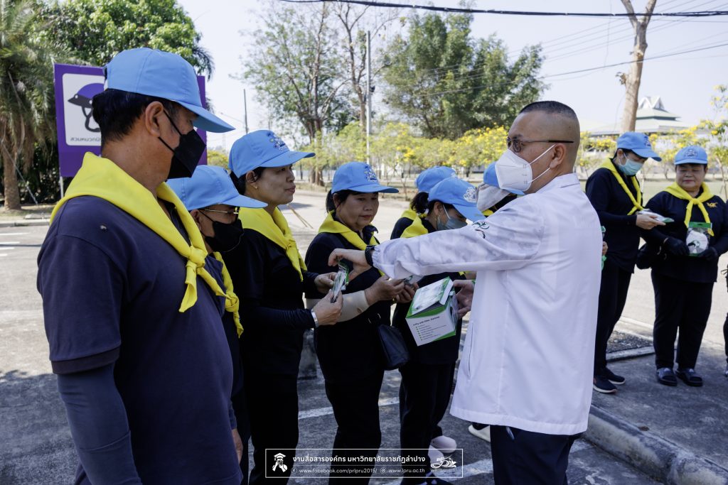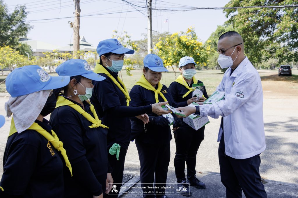 รศ.ดร.ปริเยศ สิทธิสรวง รองอธิการบดีฝ่ายบริหาร มหาวิทยาลัยราชภัฏลำปาง ร่วมตรวจเยี่ยมการจัดกิจกรรมจิตอาสา และแจกหน้ากากอนามัยป้องกันฝุ่น PM 2.5 ให้กับแม่บ้าน เจ้าหน้าที่ภาคสนาม และผู้ปฏิบัติงานในสถานที่โล่งแจ้ง เมื่อวันที่ 20 มีนาคม 2569 ณ บริเวณด้านหลังอาคารสำนักงานอธิการบดี มหาวิทยาลัยราชภัฏลำปาง